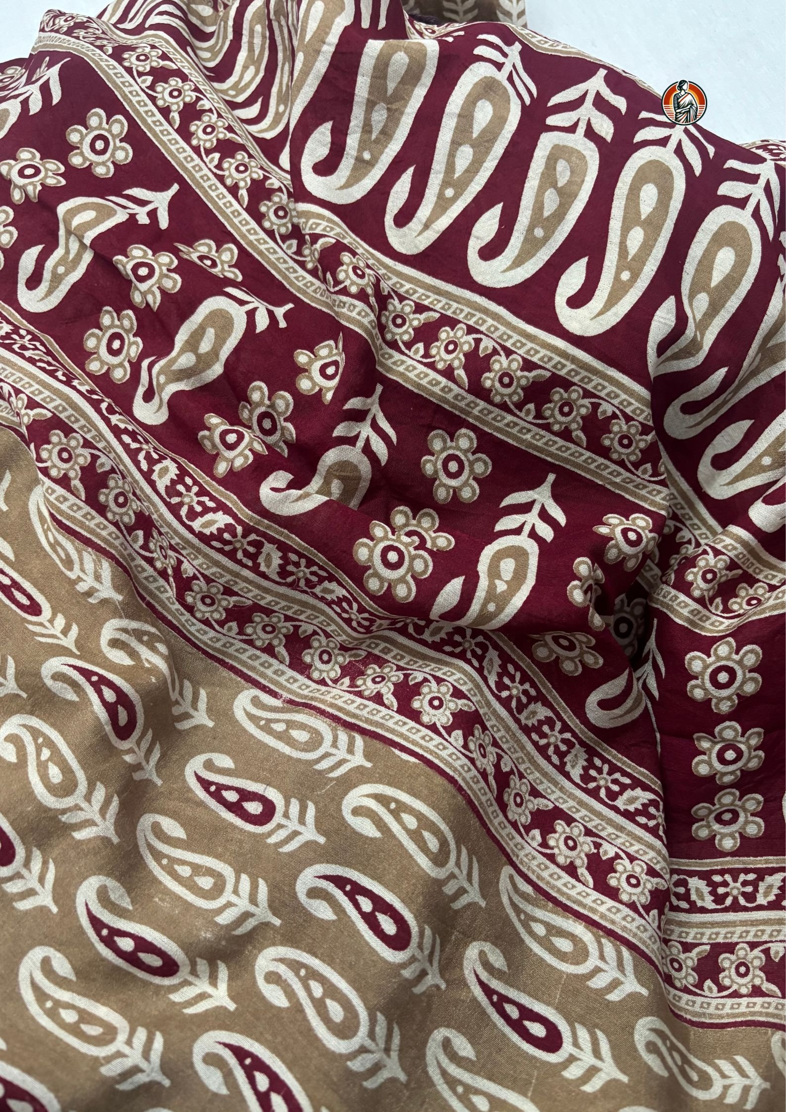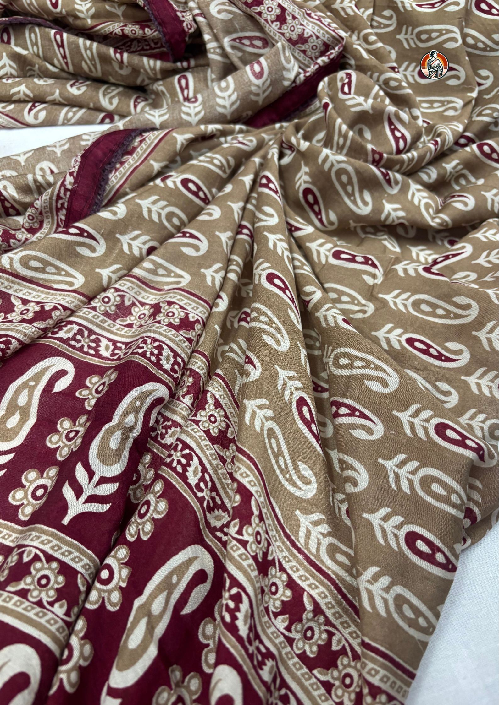 Beige & Maroon Mul Cotton Saree with Paisley Print, Traditional Border & Blouse (6.5 Meter)