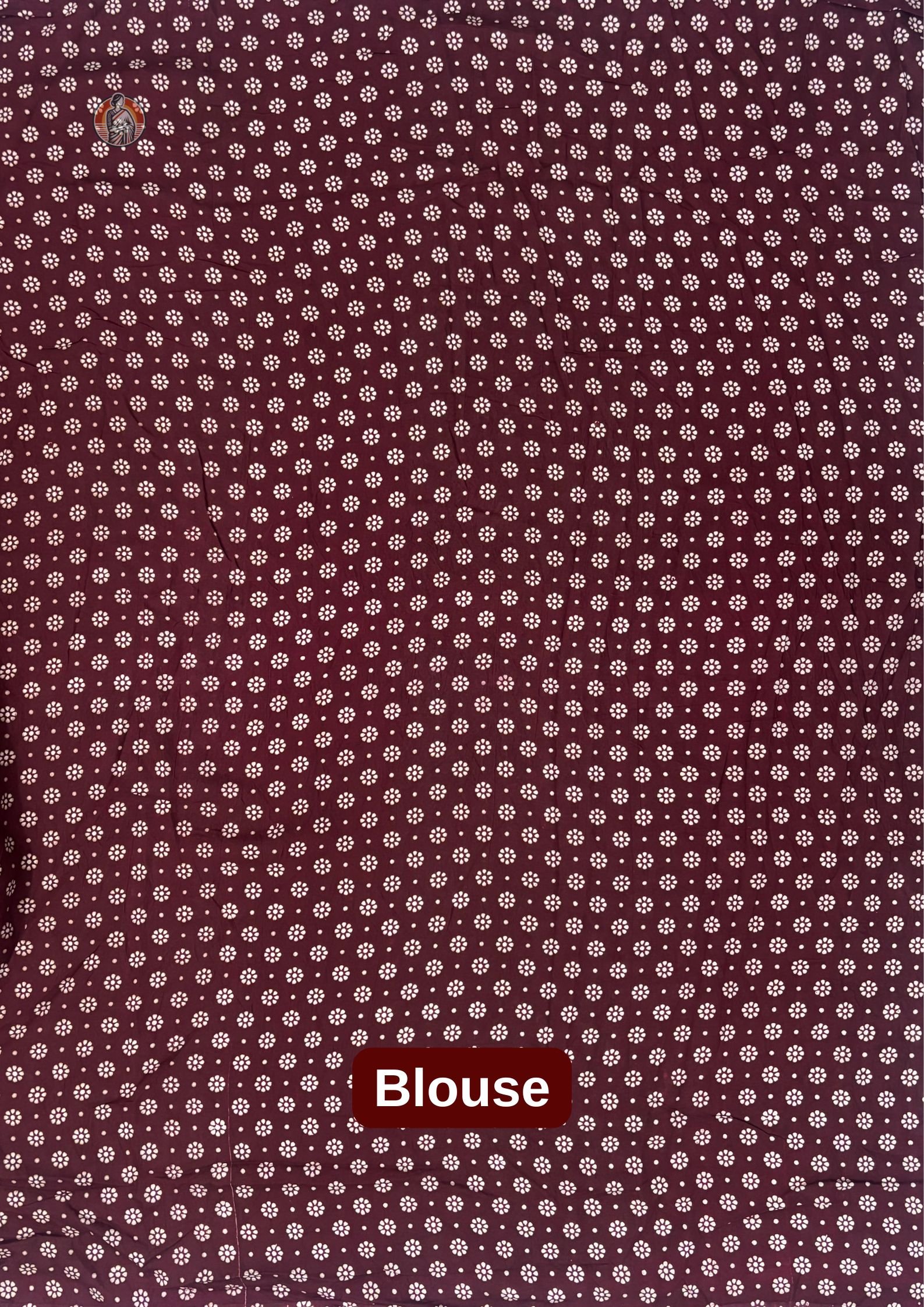 The blouse piece is in a deep maroon shade with small white floral buti, which pairs beautifully with the saree and allows for a nicely contrasted stitched blouse.