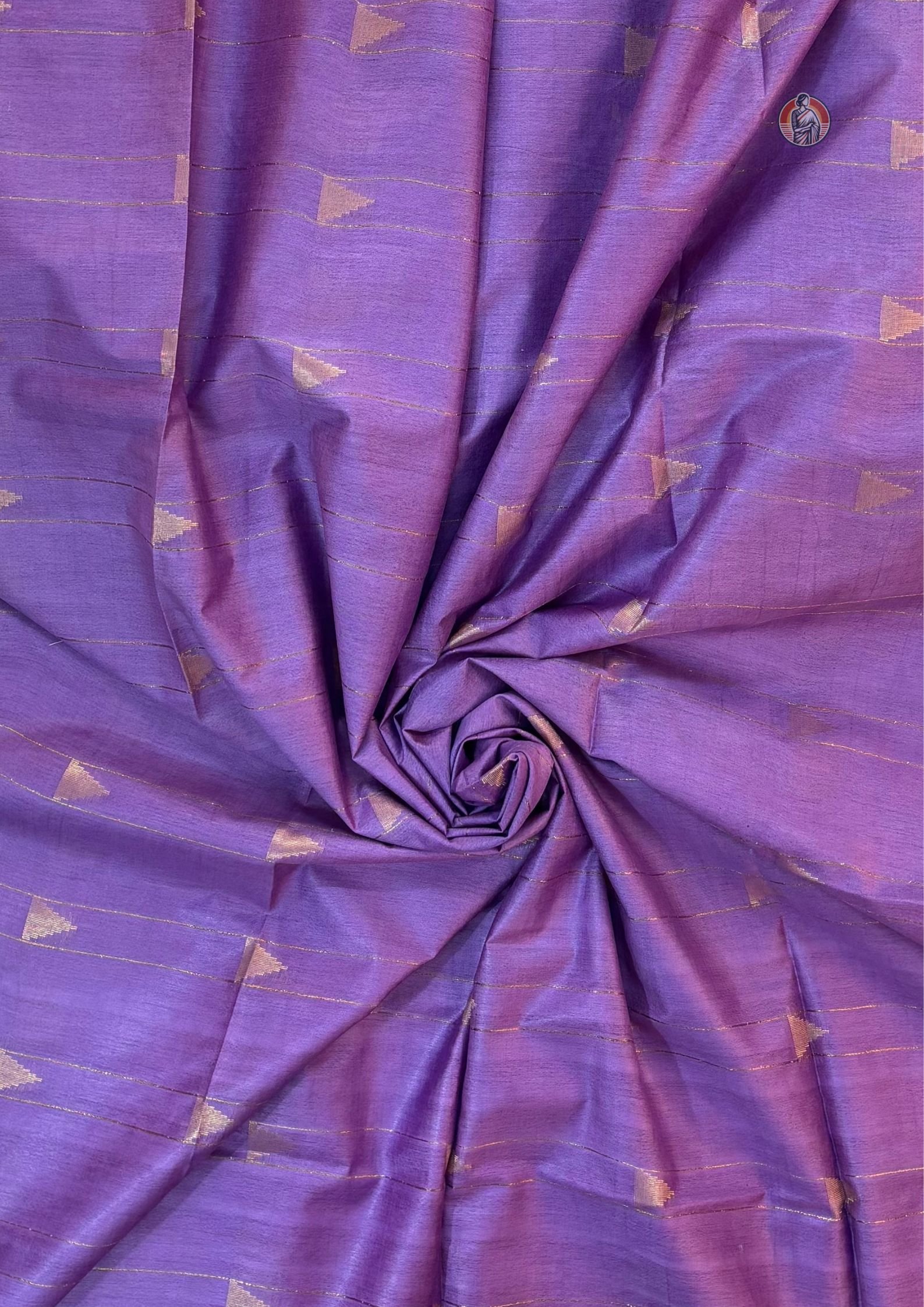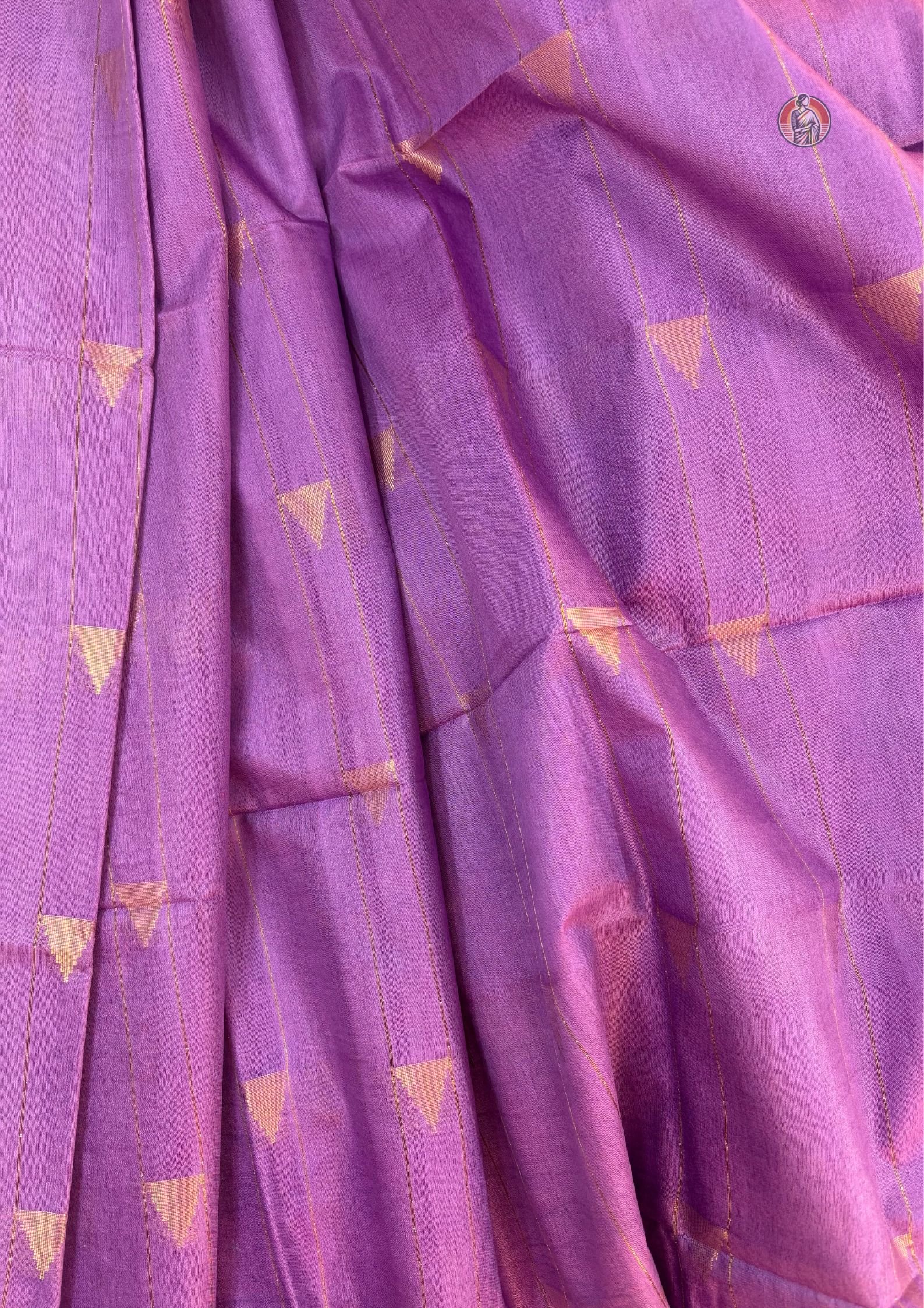 The main body of the saree is woven in a soft purple shade and decorated with small triangle motifs placed evenly in vertical alignment. These motifs are woven in a light golden tone, adding detail without making the saree look heavy. Thin vertical woven lines run along the motifs, giving the body a structured and neat appearance.