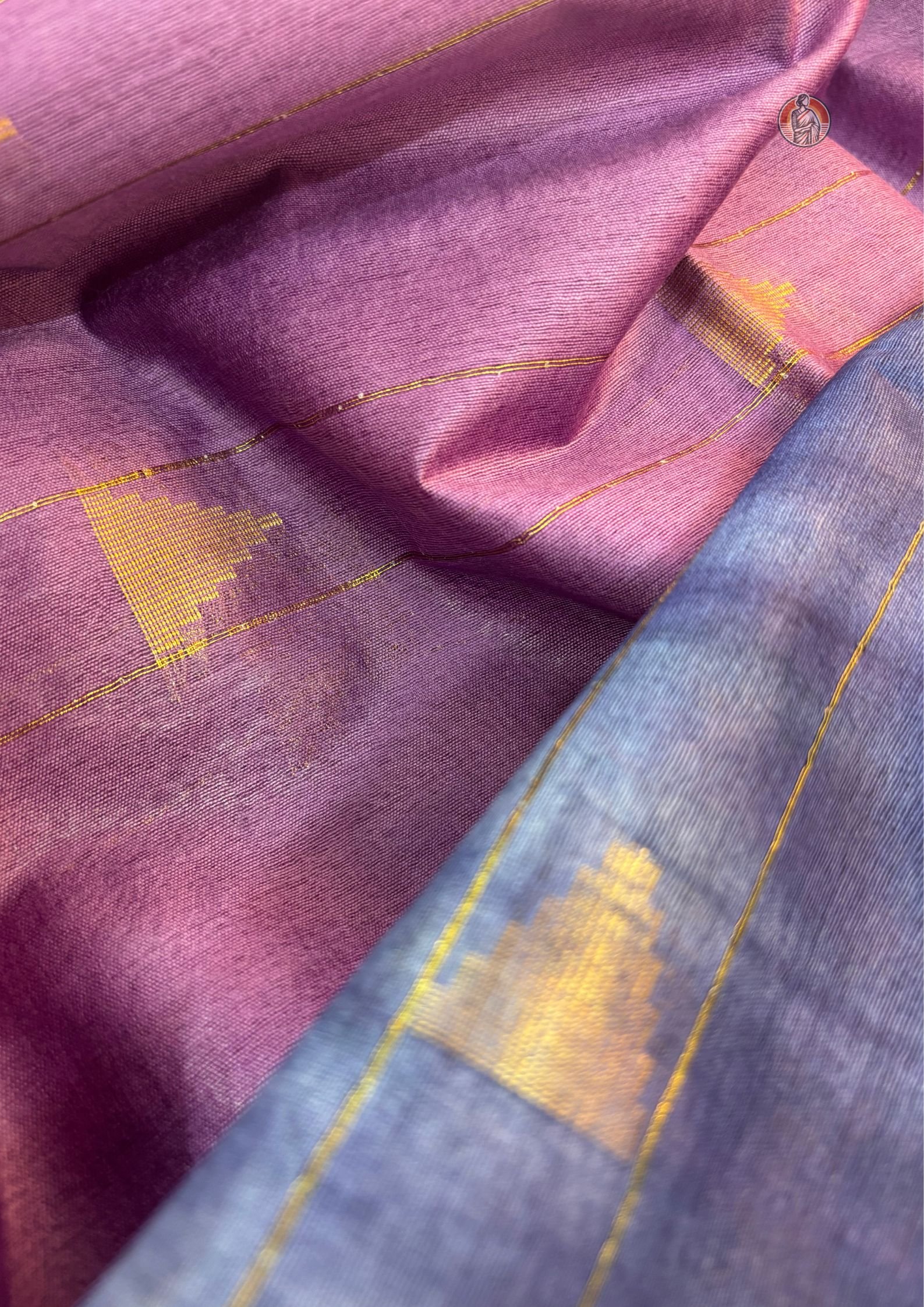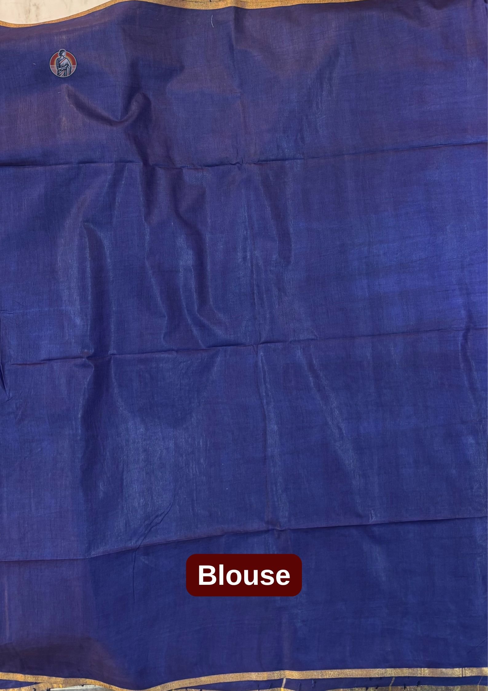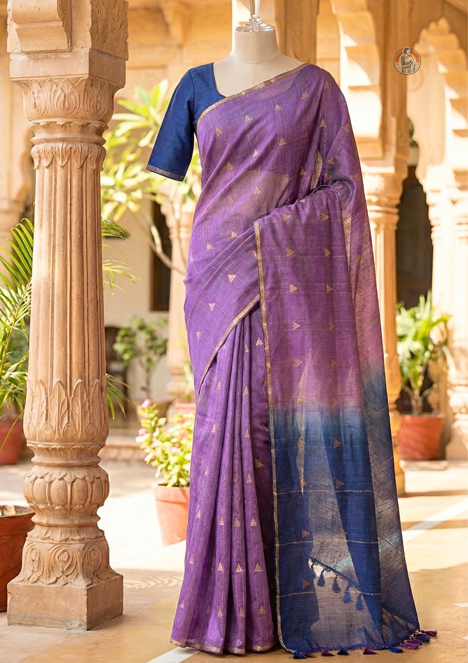This Bhagalpuri saree is made using traditional khaddi weaving, giving it a natural handloom texture and soft drape. The saree comes in a dual-colour combination with a purple body and a navy blue pallu, creating a rich and balanced contrast.