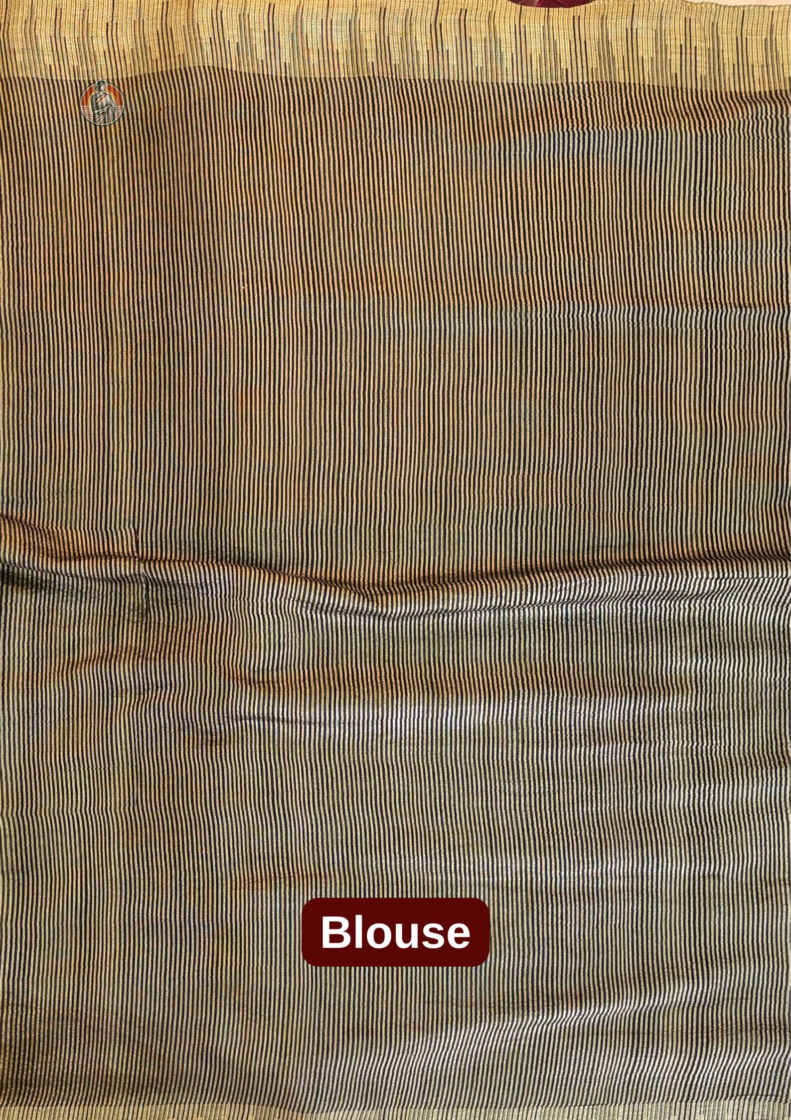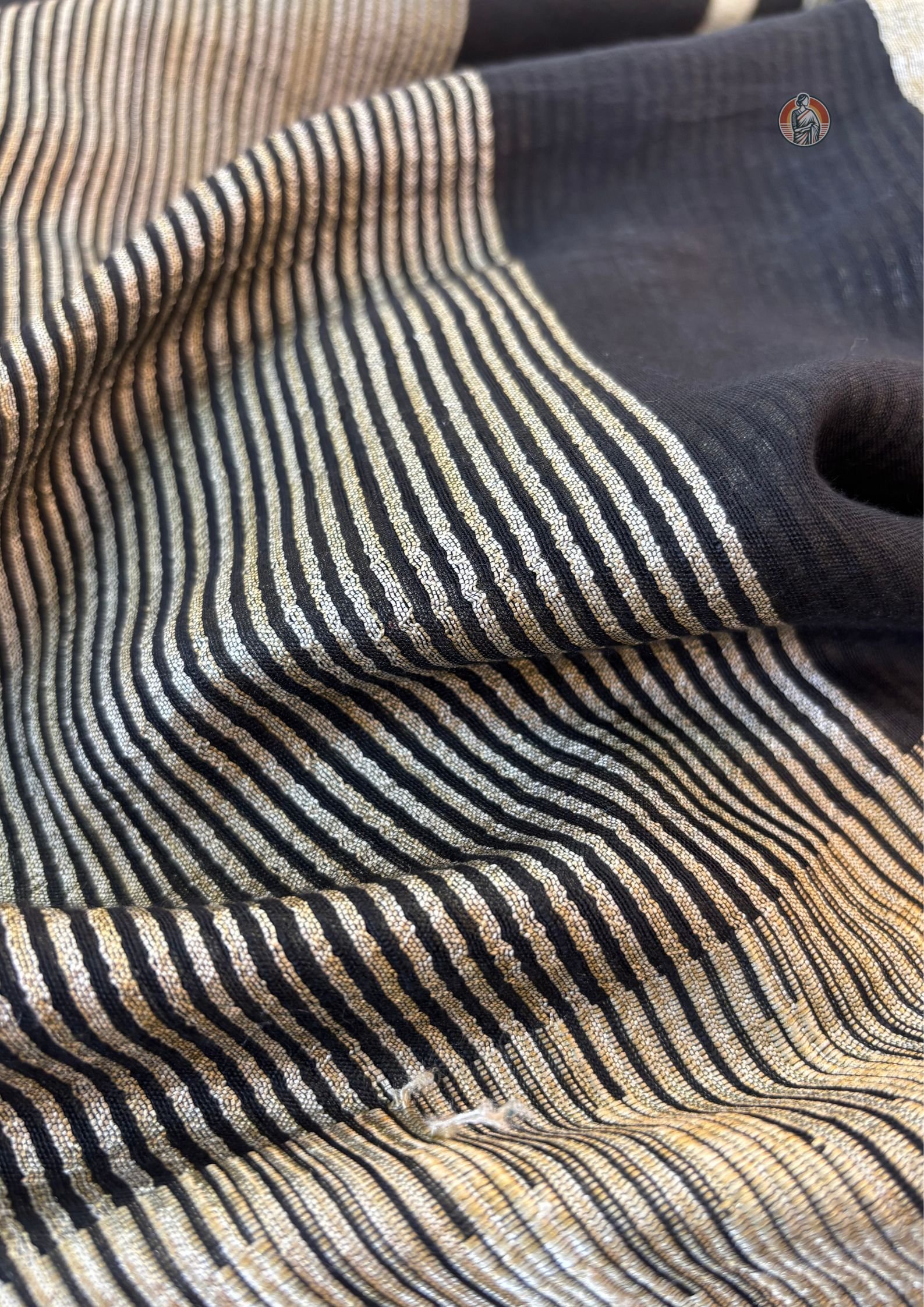 The pallu section features dense fine horizontal stripes in gold and black tones. These thin lines run closely together, forming a striped panel that stands out from the plain body. Wider gold panels appear at intervals, creating block-style sections in the pallu.