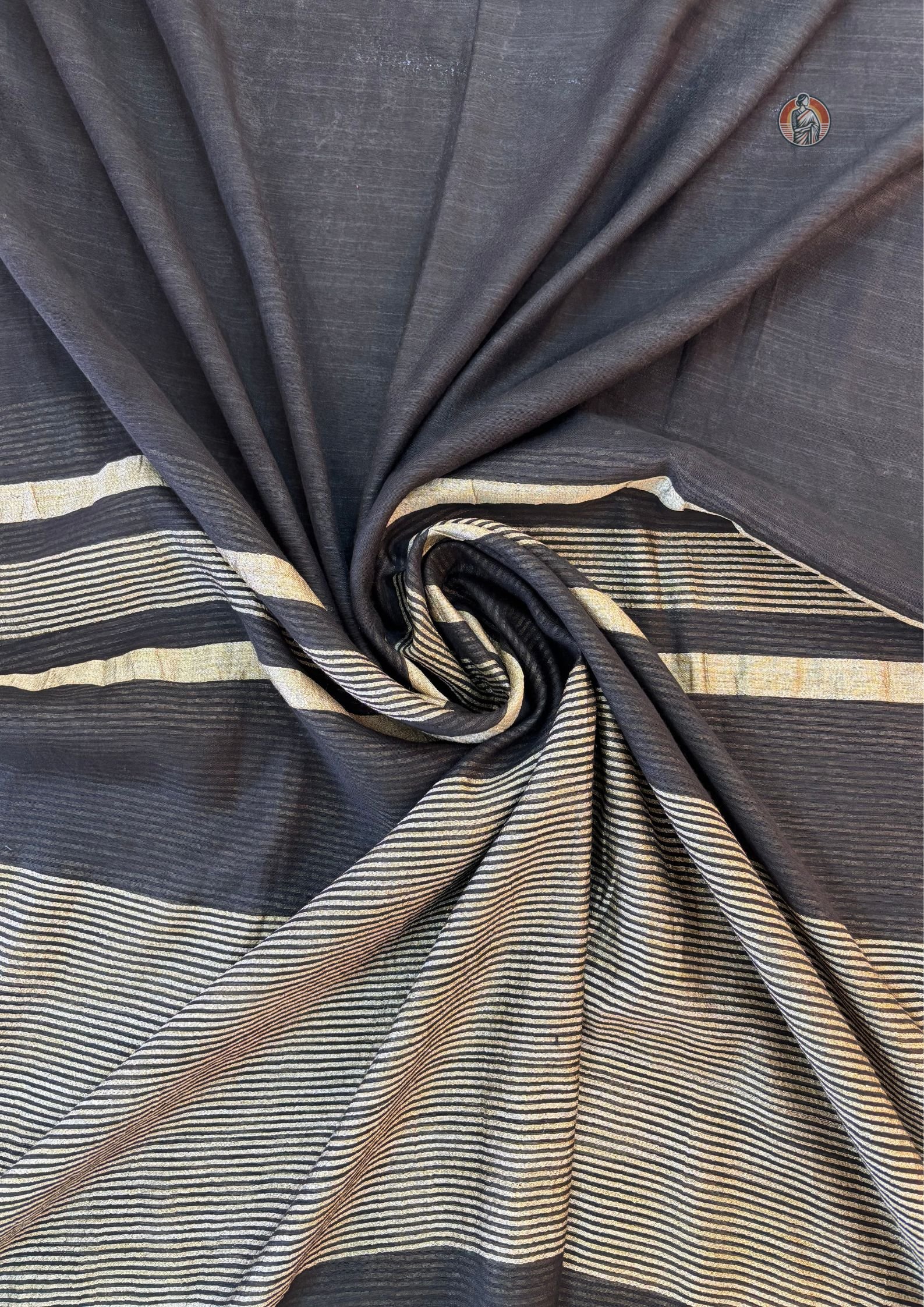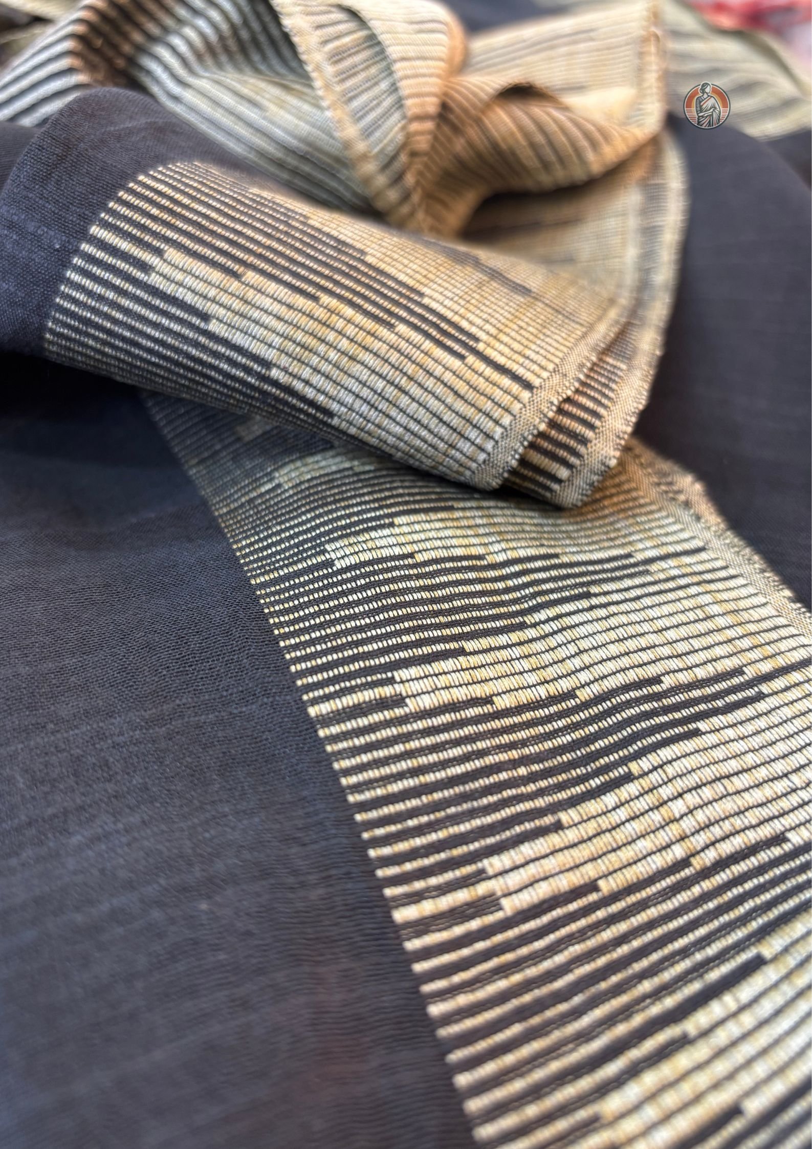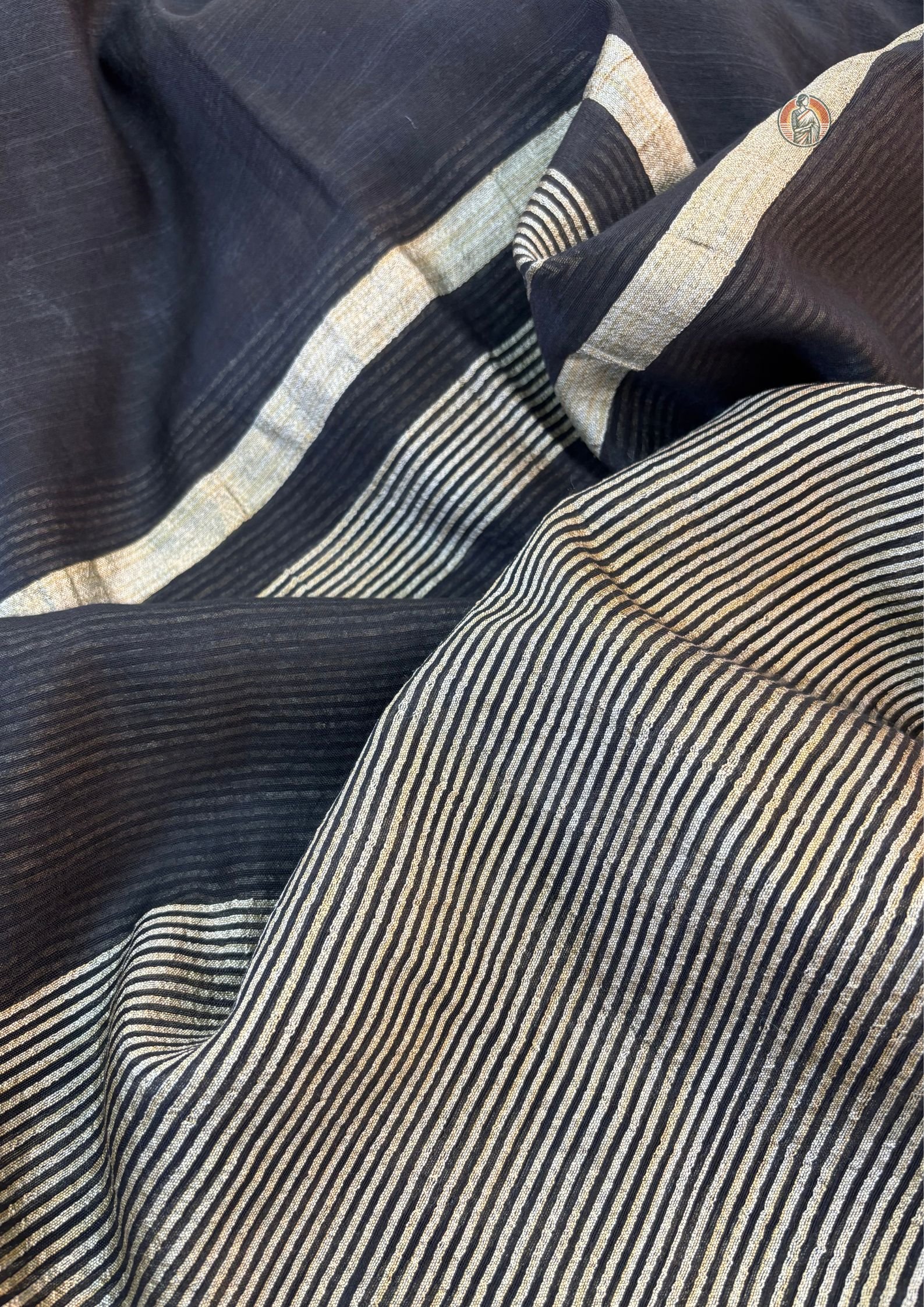 This Bhagalpuri Temple Border Saree comes in a deep black base colour, with a soft natural texture visible across the fabric. The saree body is mostly plain, with fine vertical weave lines that appear naturally in Bhagalpuri silk blend fabric.