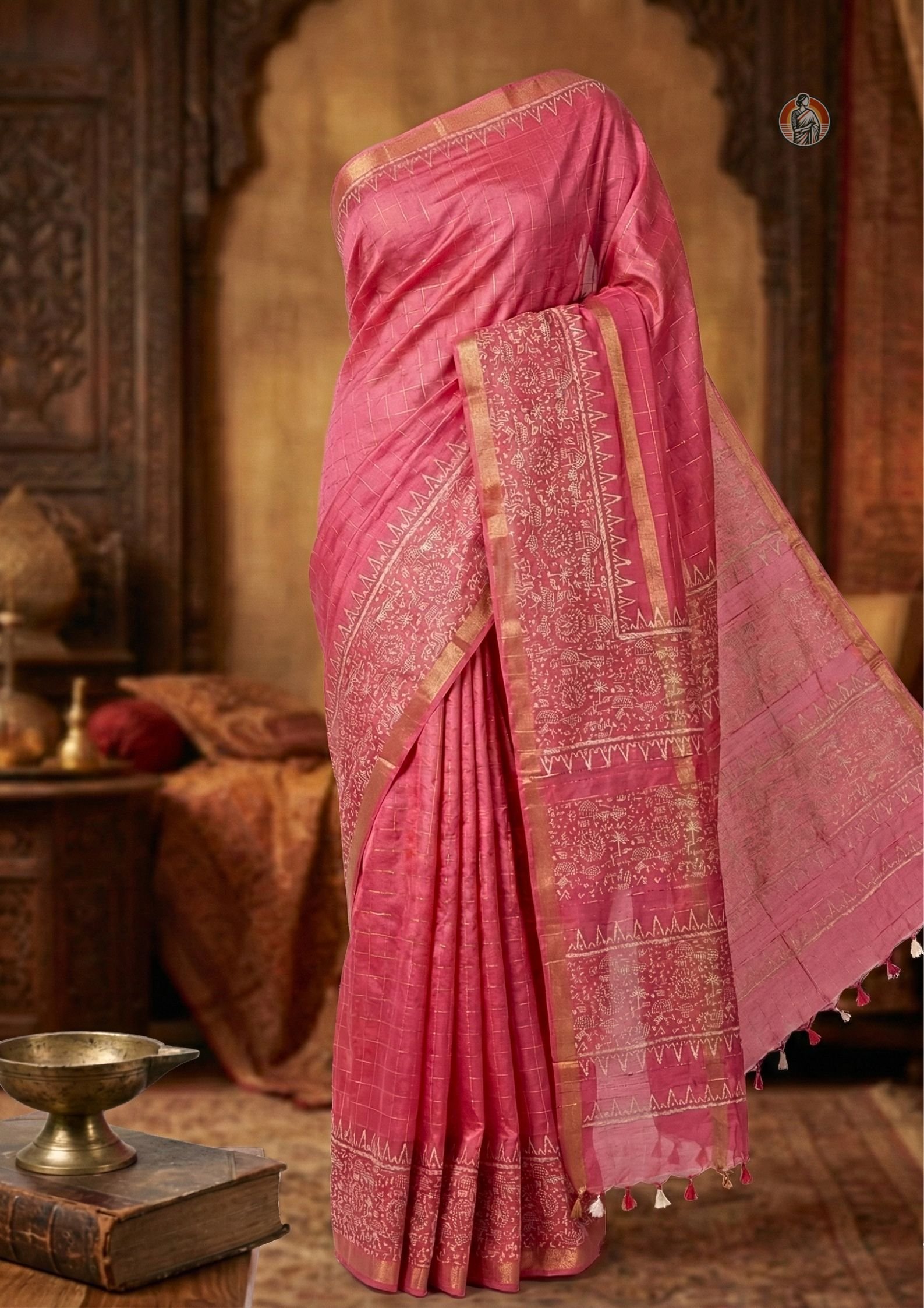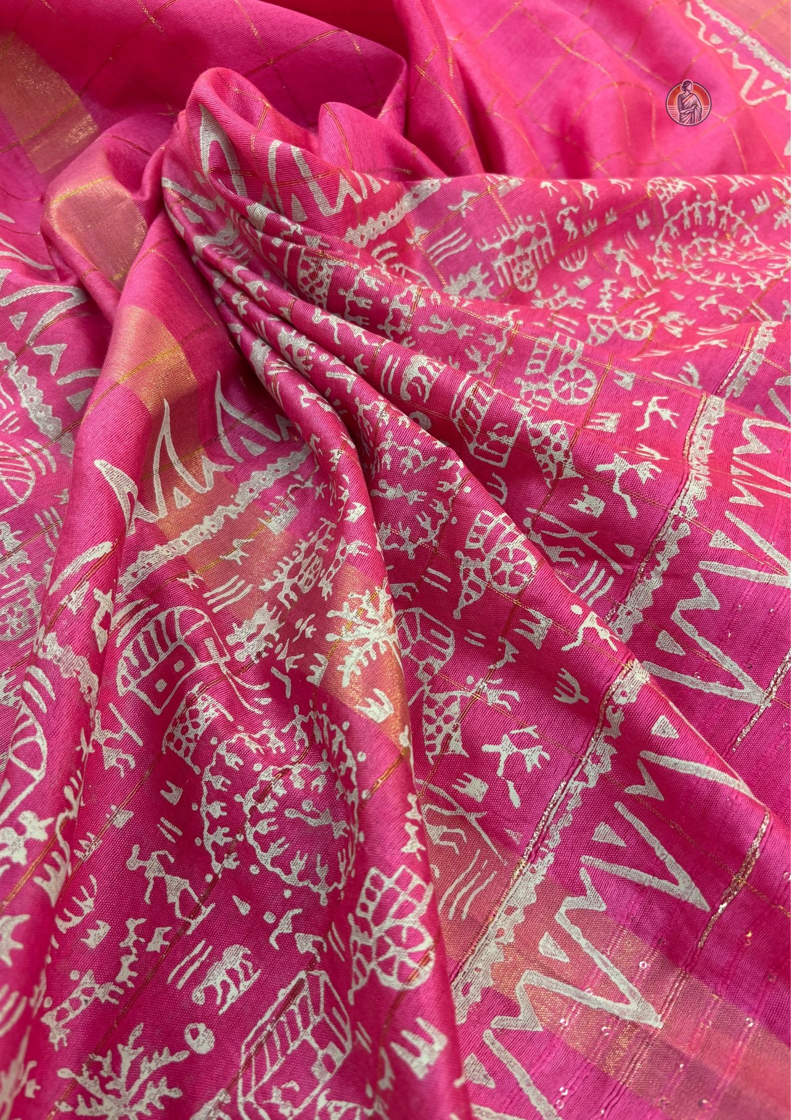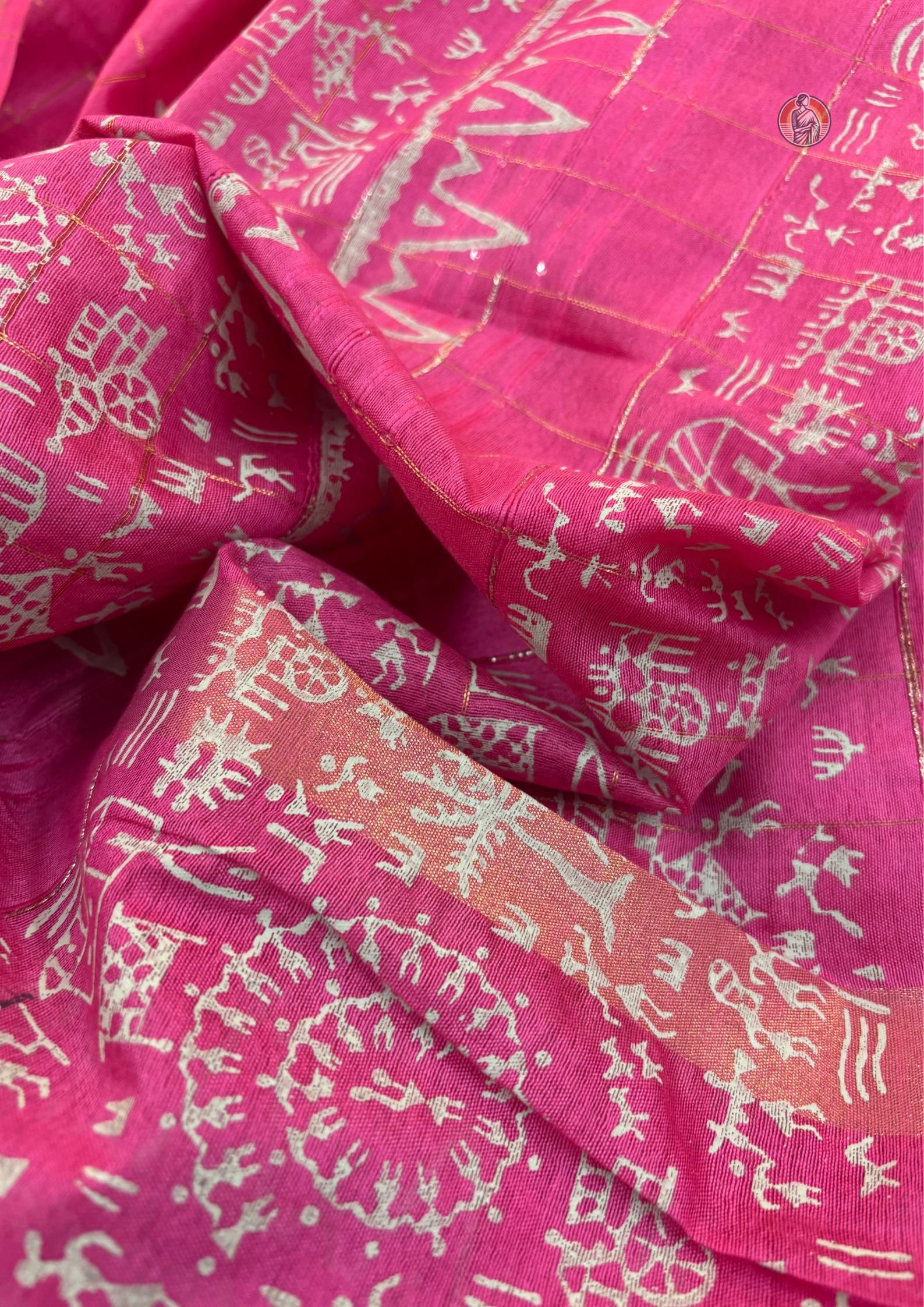 Colour: Deep Pink with Off-White Warli Print and Gold Border