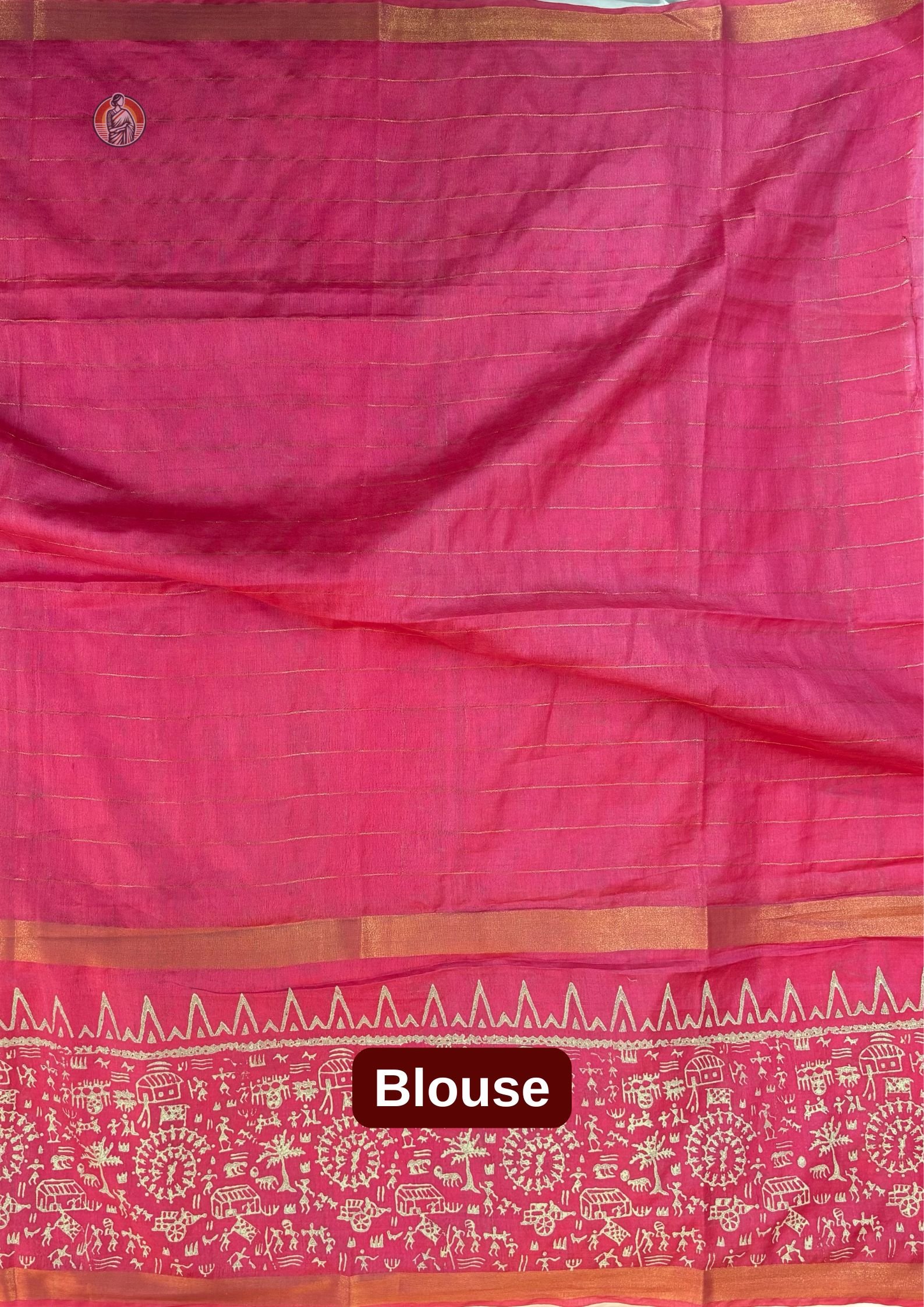 This Bhagalpuri Warli art saree is crafted using a silk and viscose blend, woven in the traditional khaddi style that gives the fabric a natural texture and soft fall. The base colour of the saree is a rich deep pink, highlighted with fine golden thread lines running evenly across the body, adding quiet detail without making it heavy.