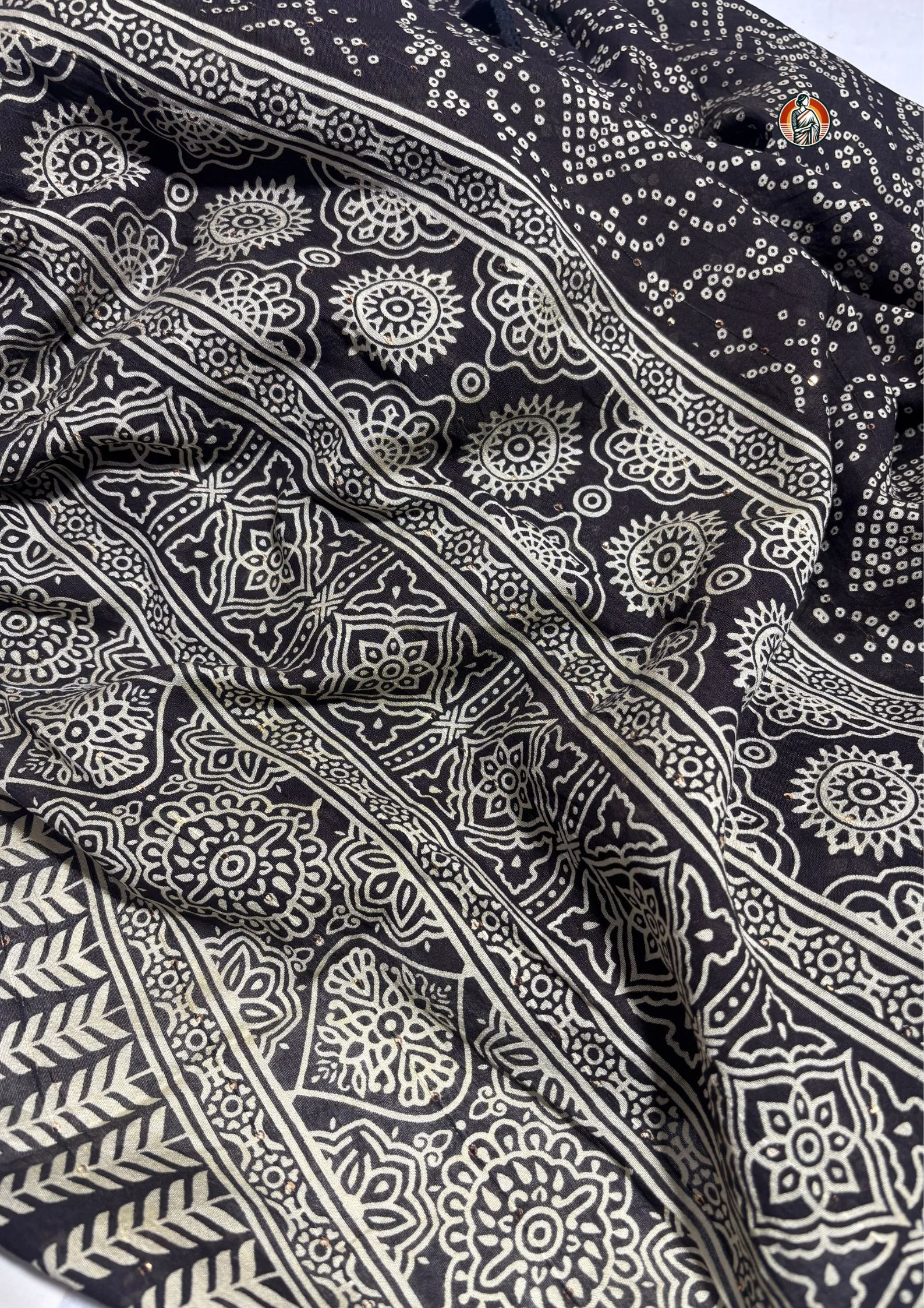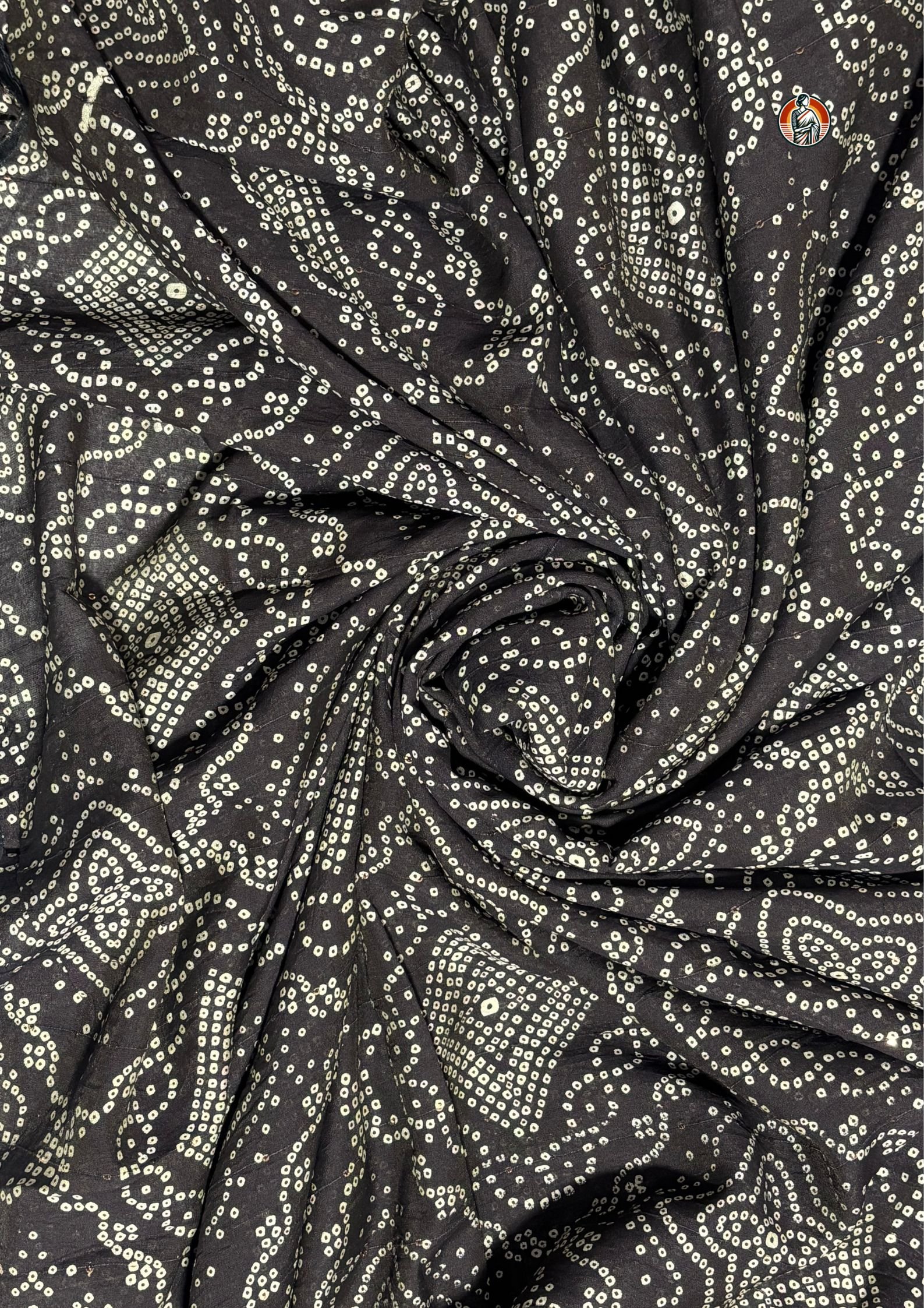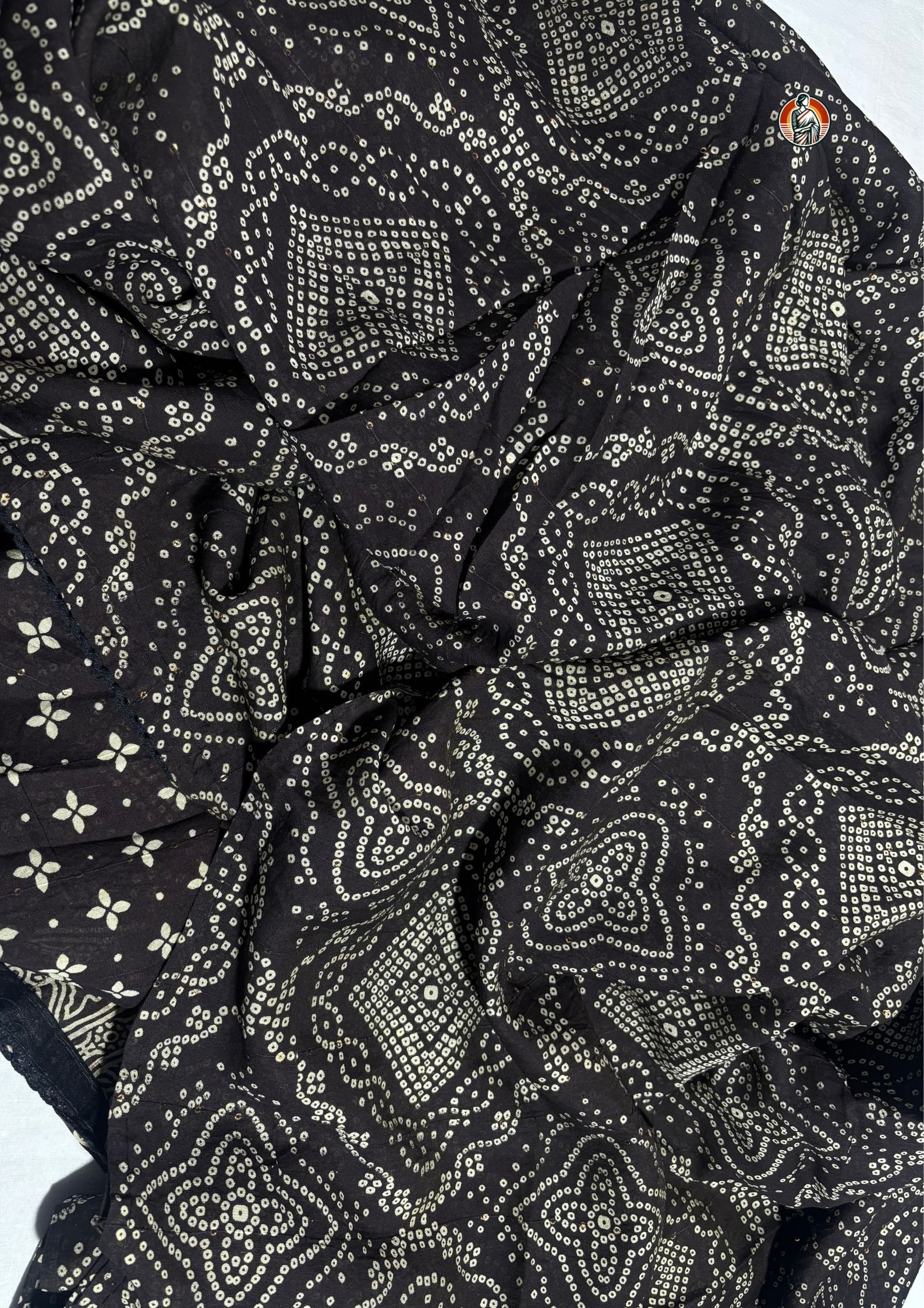 The saree comes in a deep black base colour, giving it a bold and timeless appeal. The body features Bandhani-inspired dotted floral motifs spread evenly across the saree. These small ivory dots form delicate flower-like patterns, arranged in a neat and consistent layout, giving the saree a subtle traditional look.