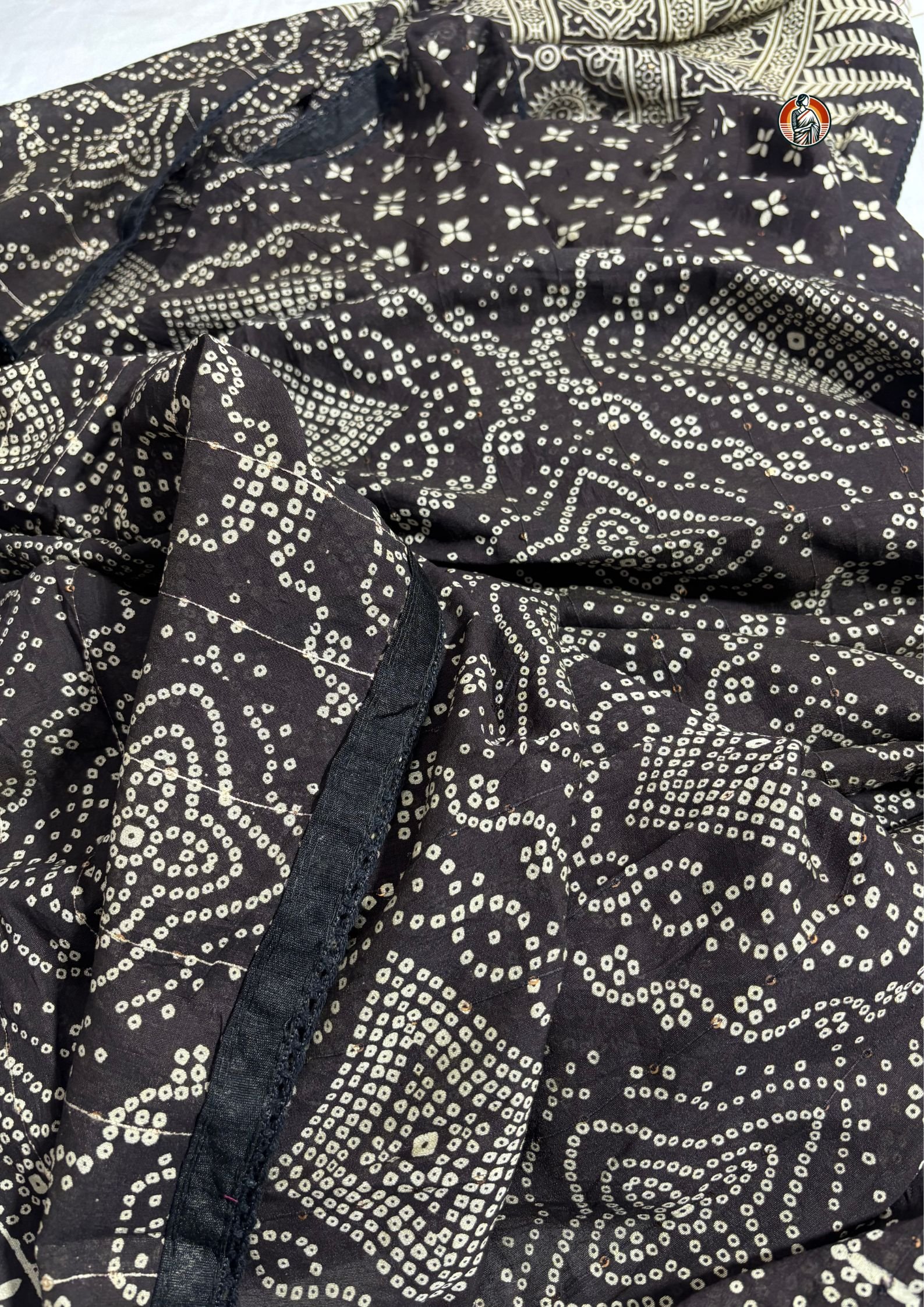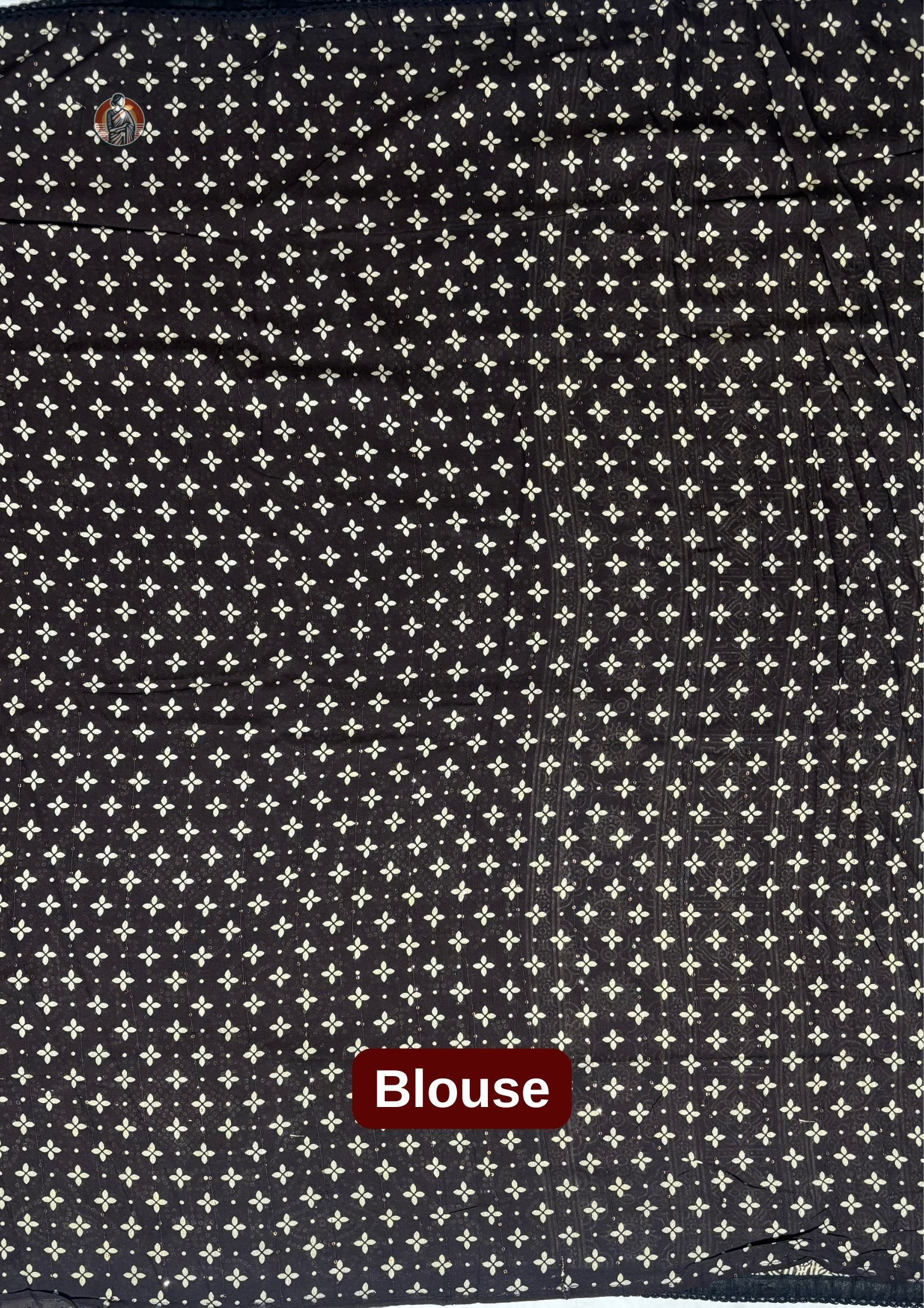 The blouse piece matches the saree perfectly, featuring small Bandhani-style floral dots on a black base, allowing you to stitch a well-coordinated blouse.