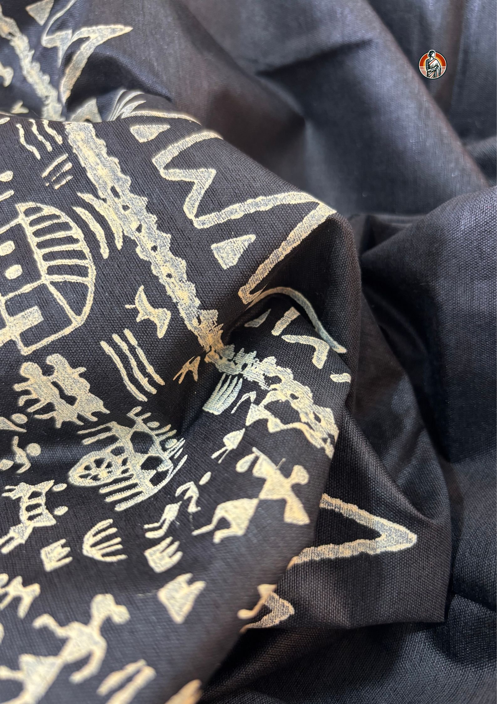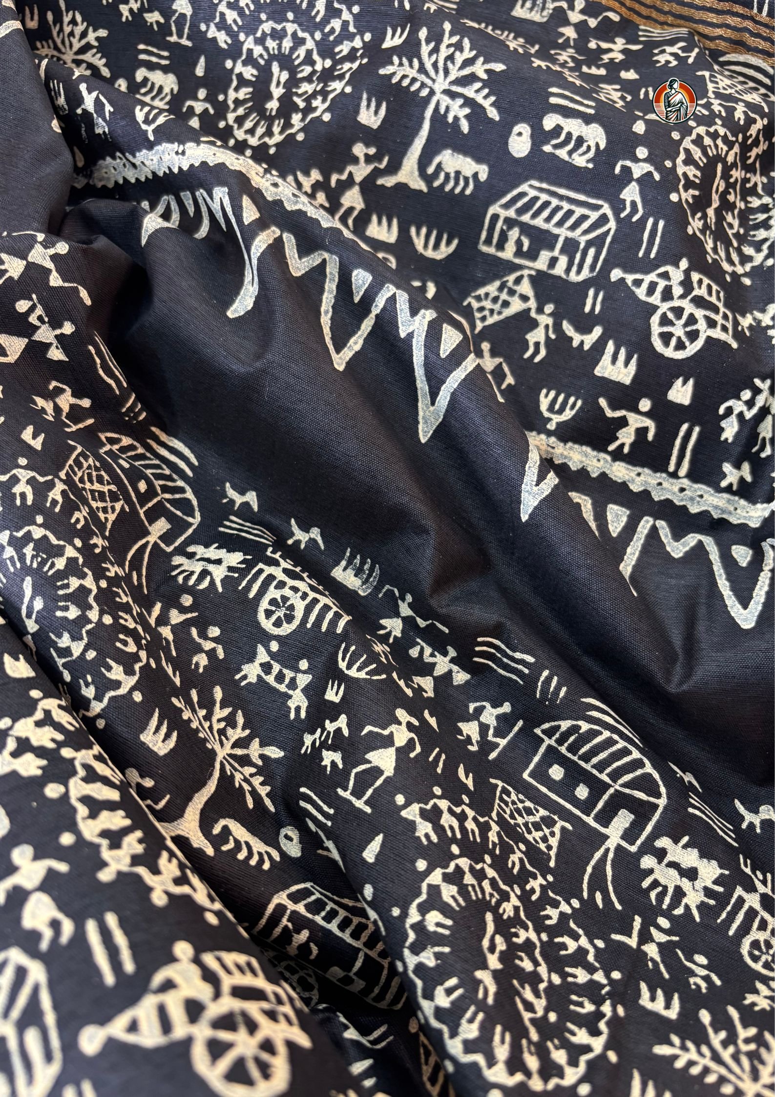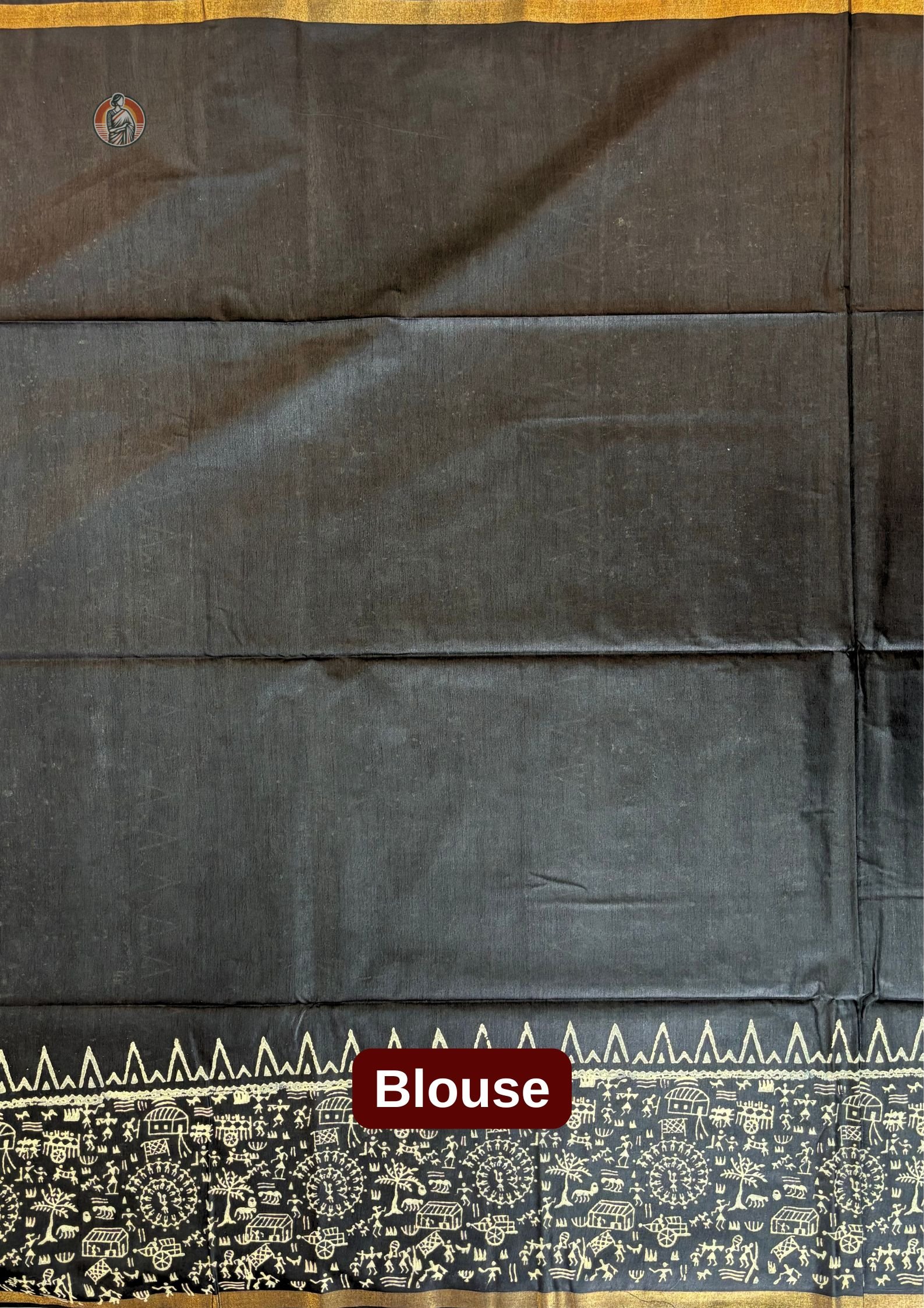 This Bhagalpuri saree comes in a rich black colour that gives it a very elegant and subtle look. The body of the saree is kept plain, while the pallu and lower border are beautifully designed with traditional Warli art block print in an off-white shade. The print showcases village life inspired tribal motifs like human figures, animals, huts, trees and circular chariot-style patterns which reflect authentic folk art.