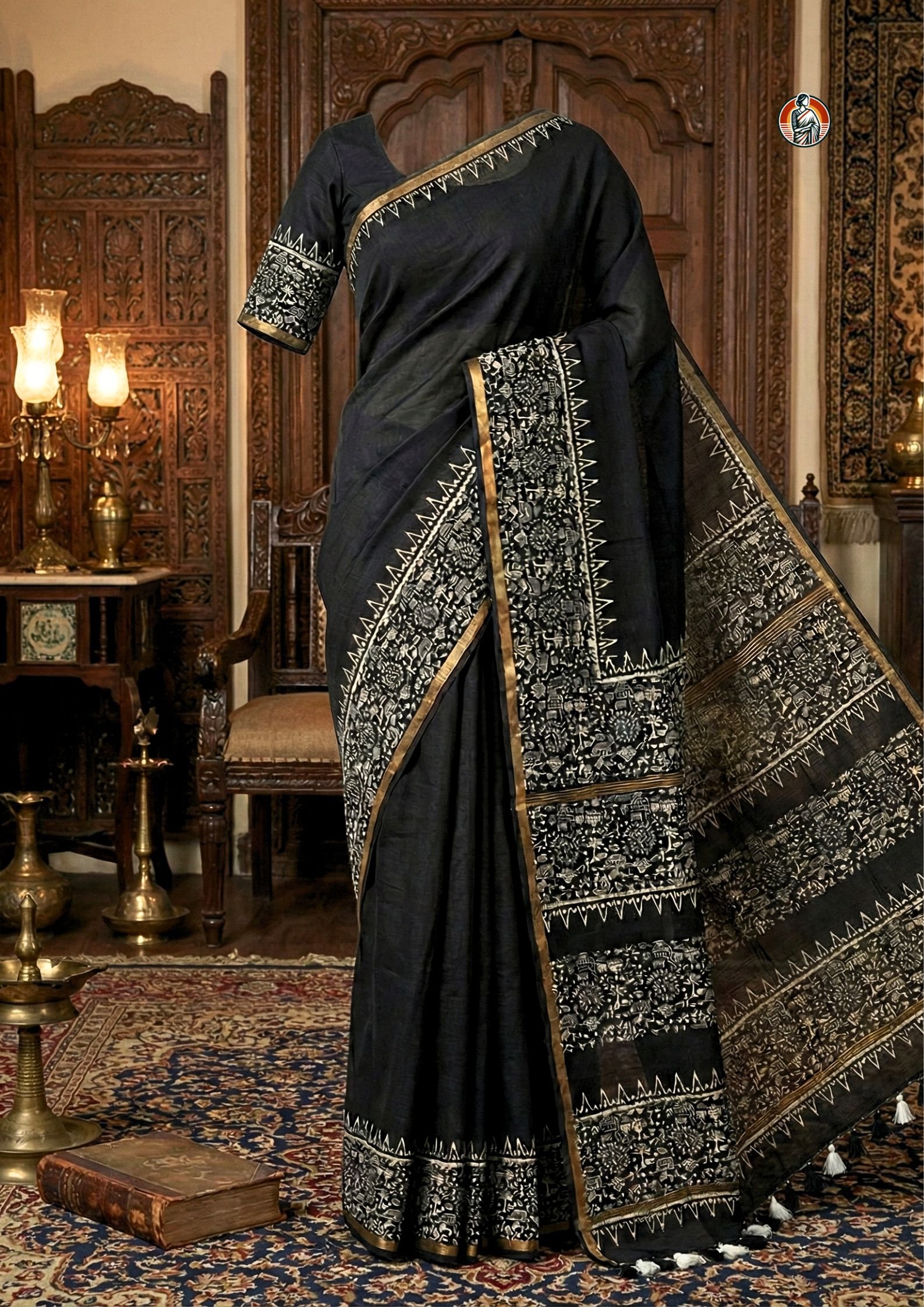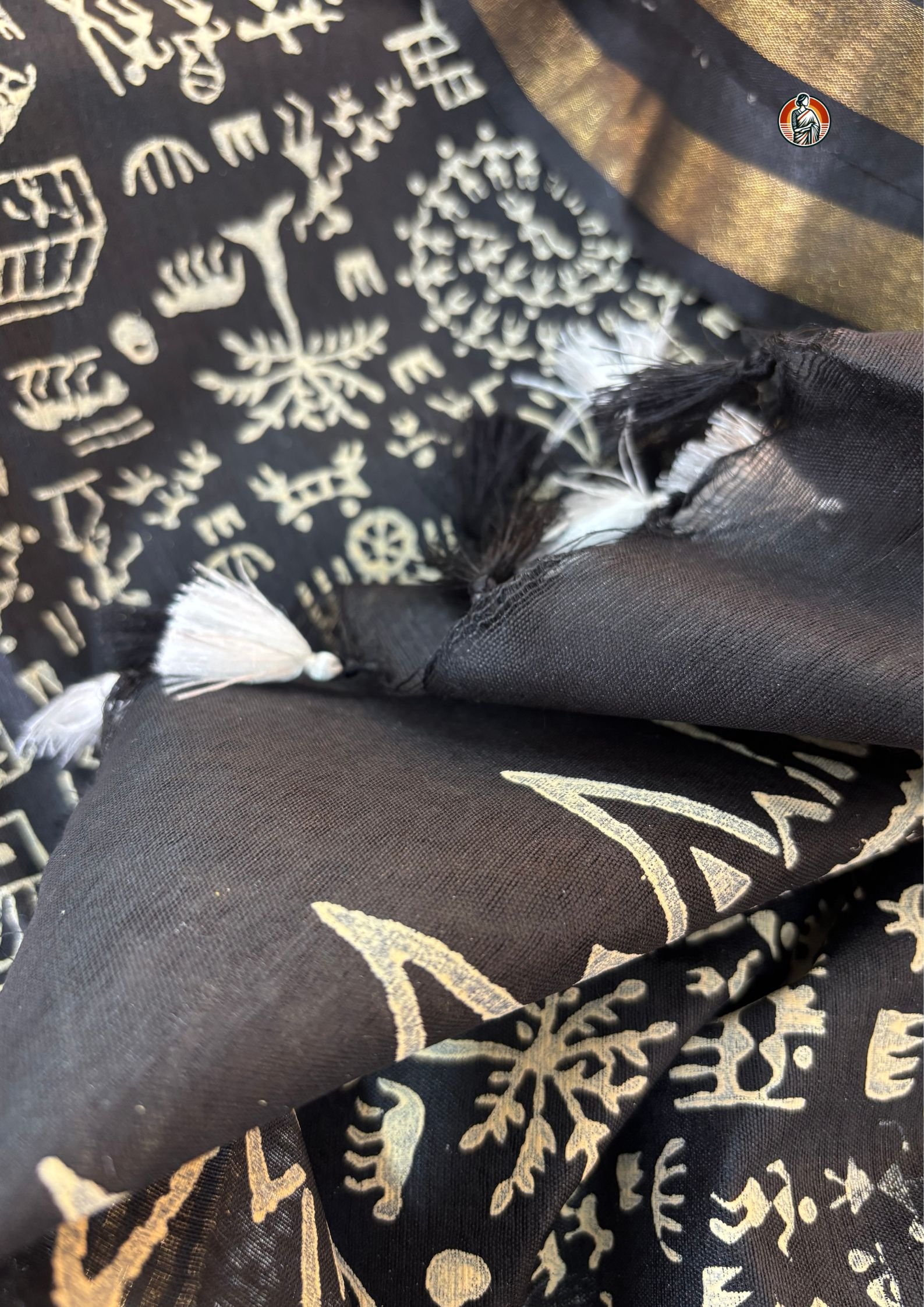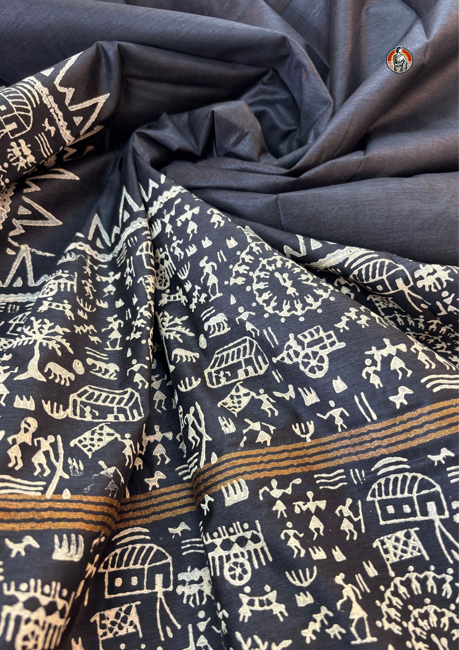 This Bhagalpuri saree comes in a rich black colour that gives it a very elegant and subtle look. The body of the saree is kept plain, while the pallu and lower border are beautifully designed with traditional Warli art block print in an off-white shade. The print showcases village life inspired tribal motifs like human figures, animals, huts, trees and circular chariot-style patterns which reflect authentic folk art.