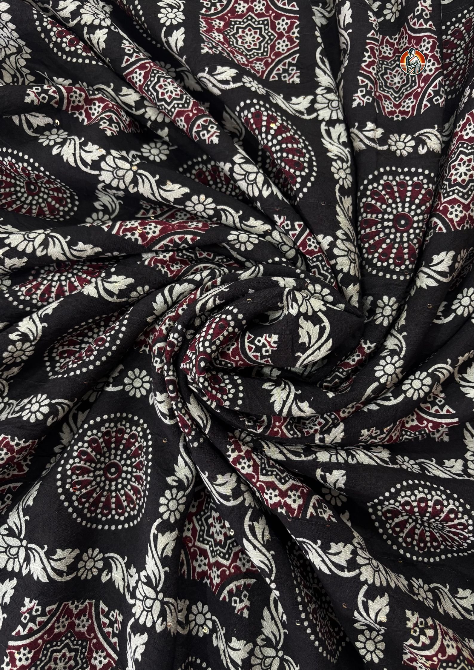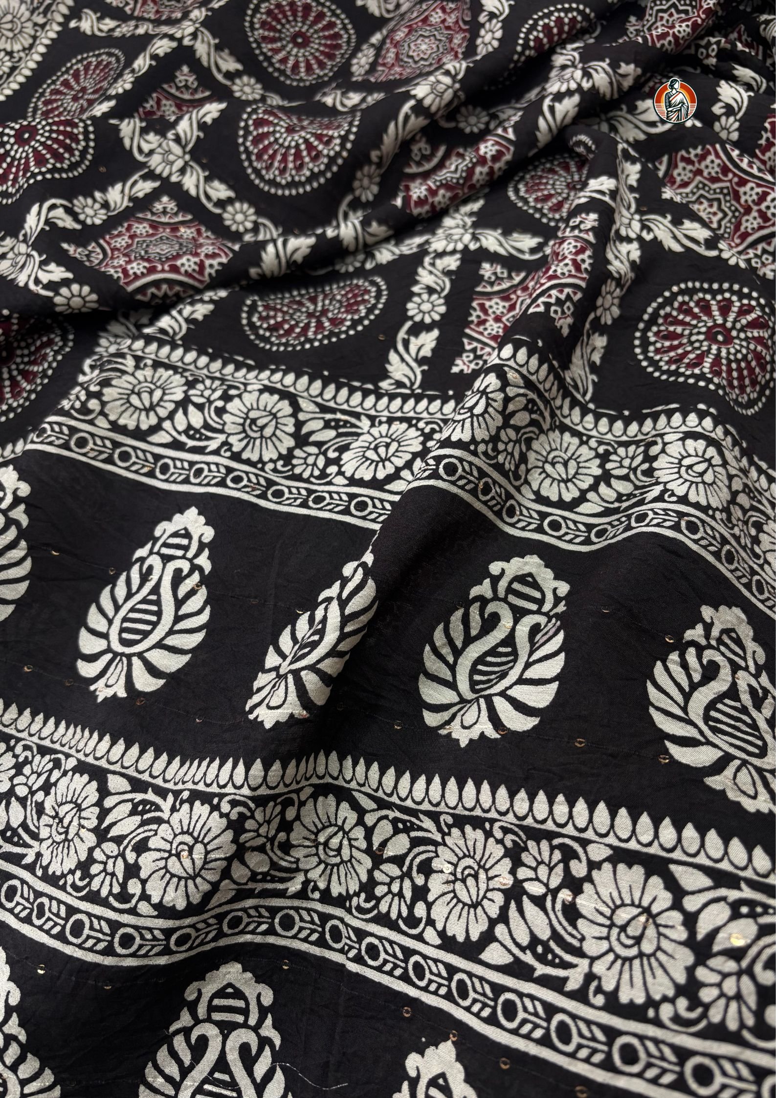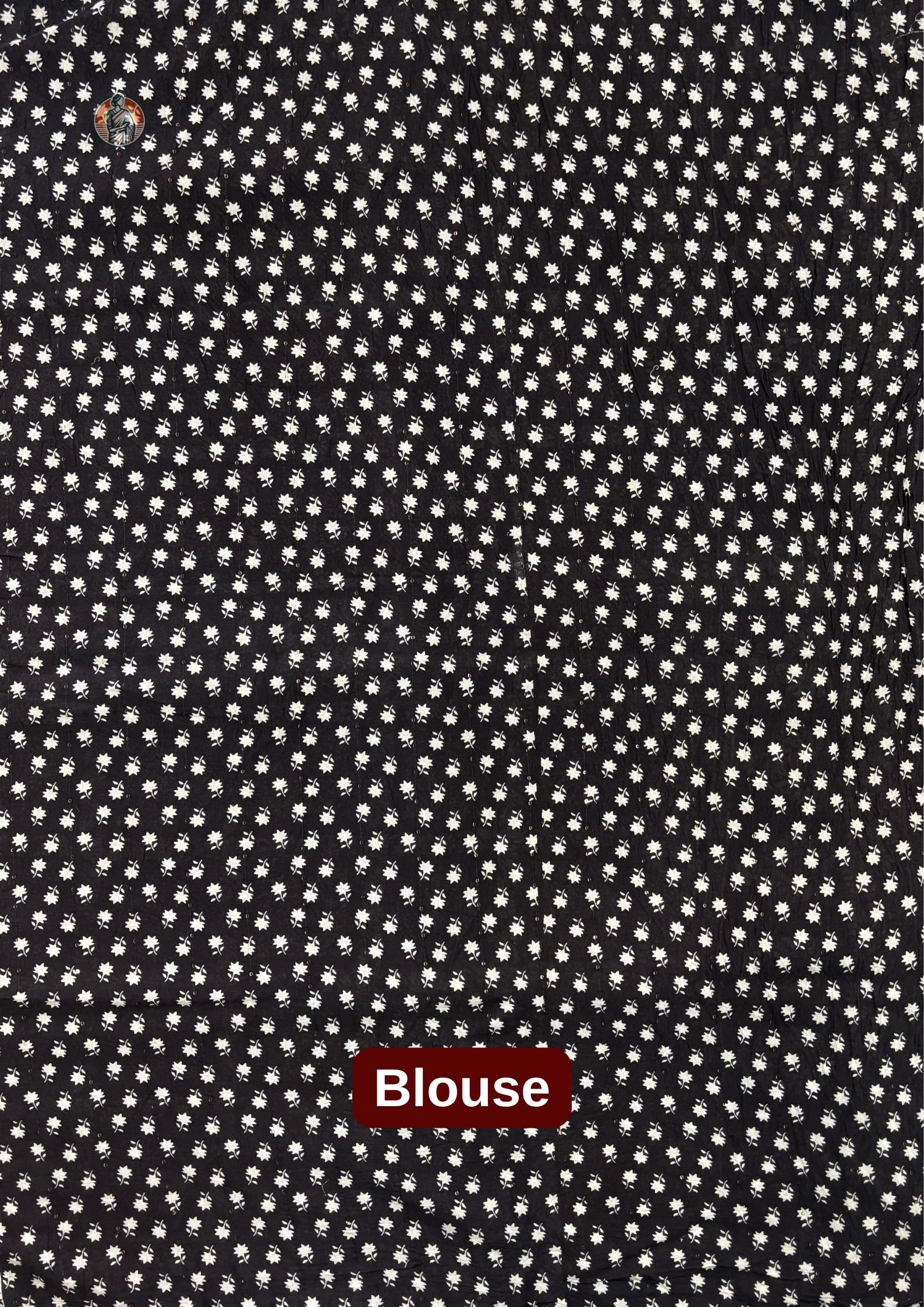 The saree comes in a deep black base colour, which gives it a timeless and versatile appeal. The body is adorned with small ivory floral buti motifs arranged in neat diagonal rows across the saree. These tiny repeated motifs create a simple yet very graceful all-over pattern that looks refined without feeling heavy.