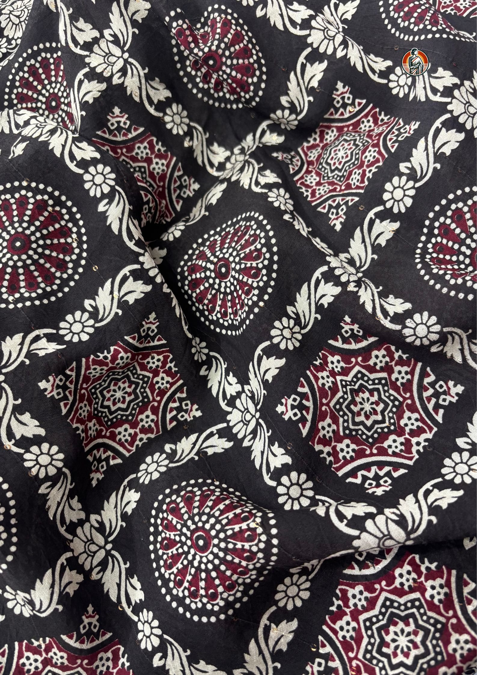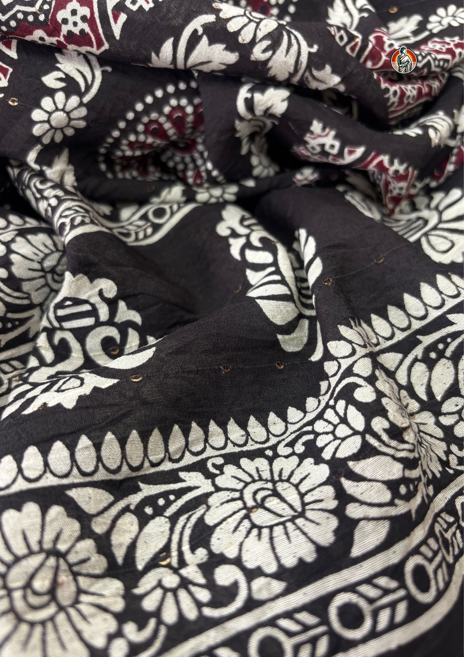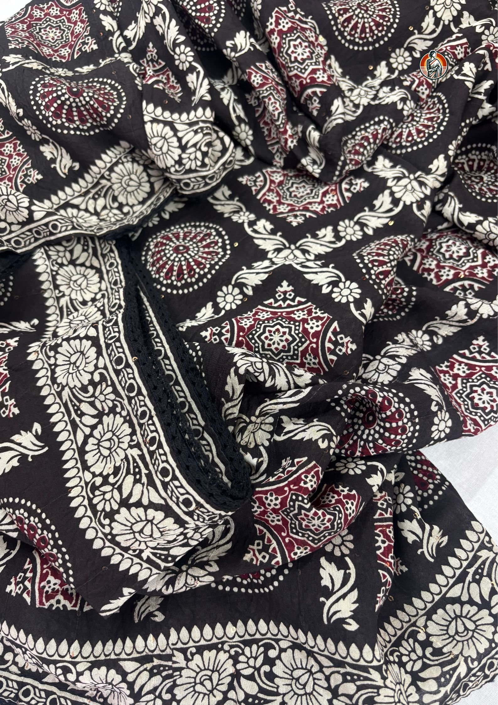 The saree comes in a deep black base colour, which gives it a timeless and versatile appeal. The body is adorned with small ivory floral buti motifs arranged in neat diagonal rows across the saree. These tiny repeated motifs create a simple yet very graceful all-over pattern that looks refined without feeling heavy.