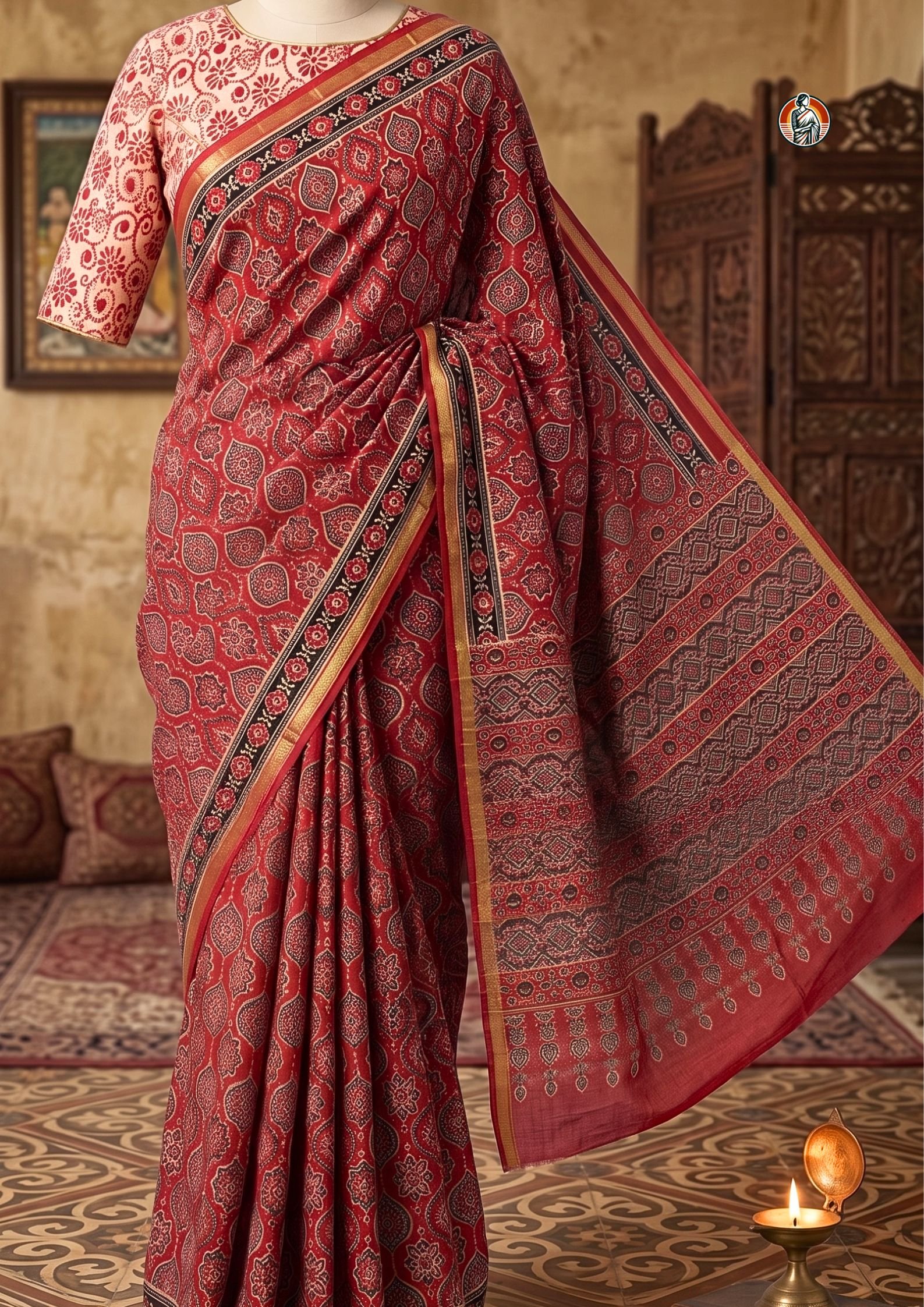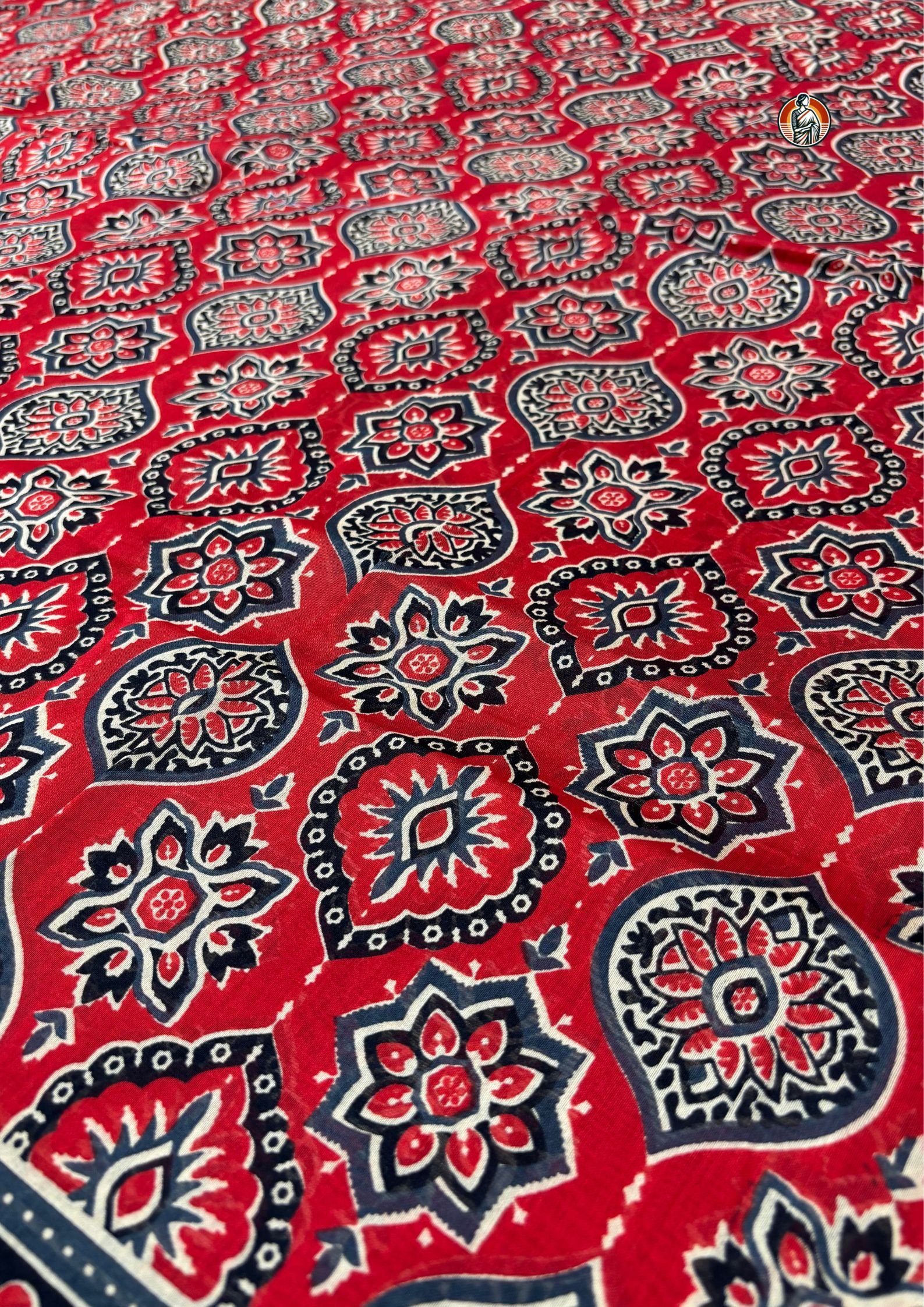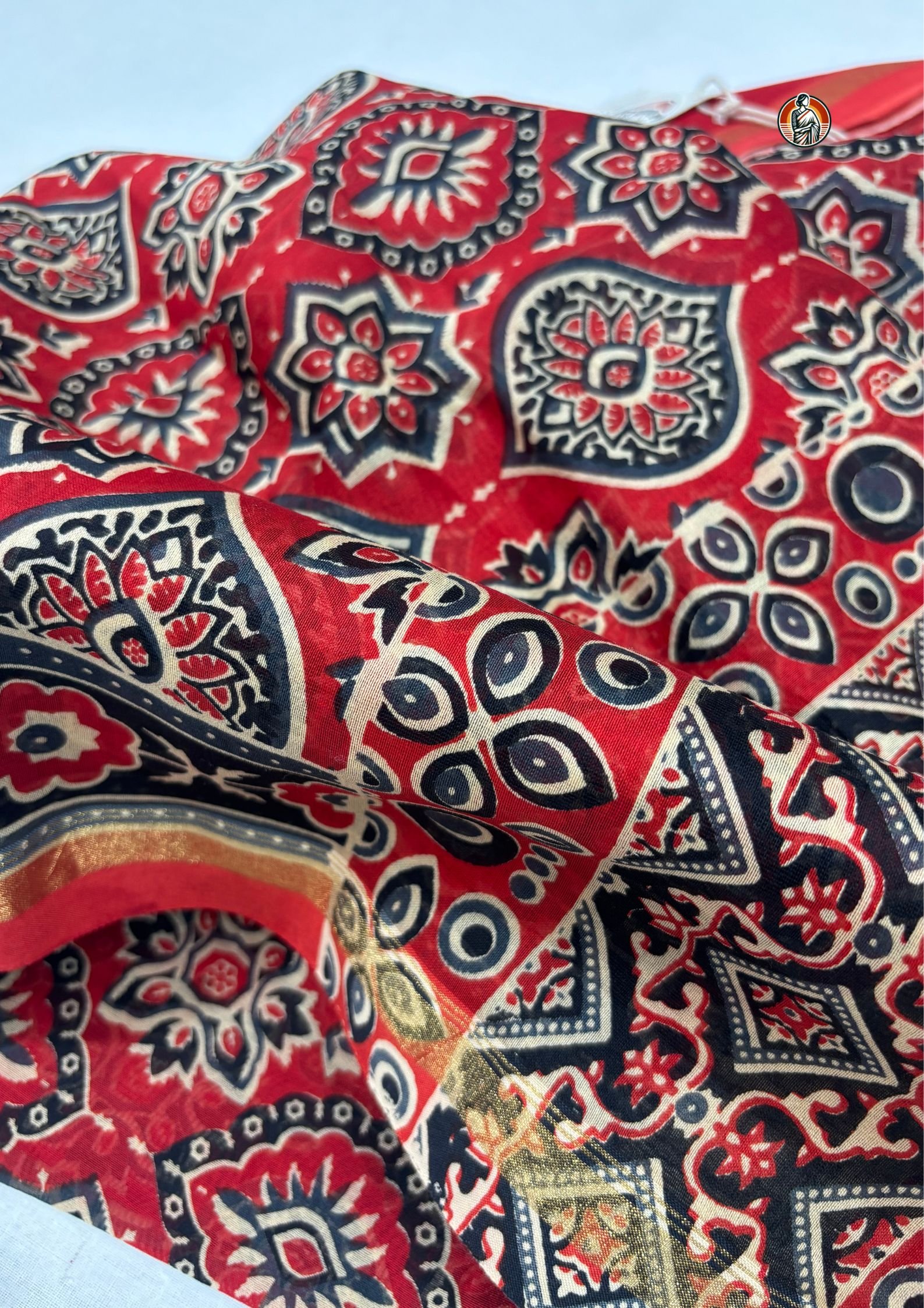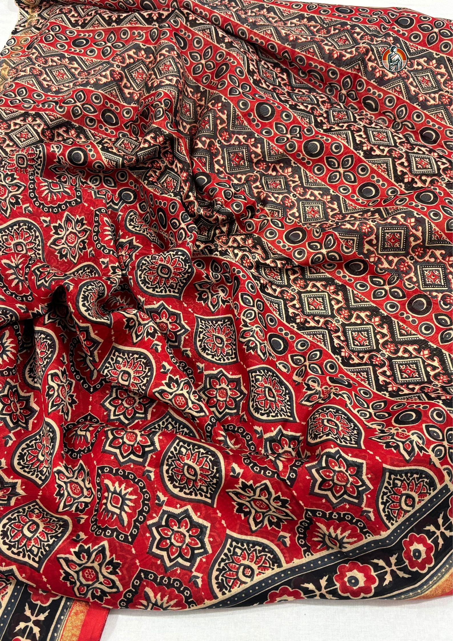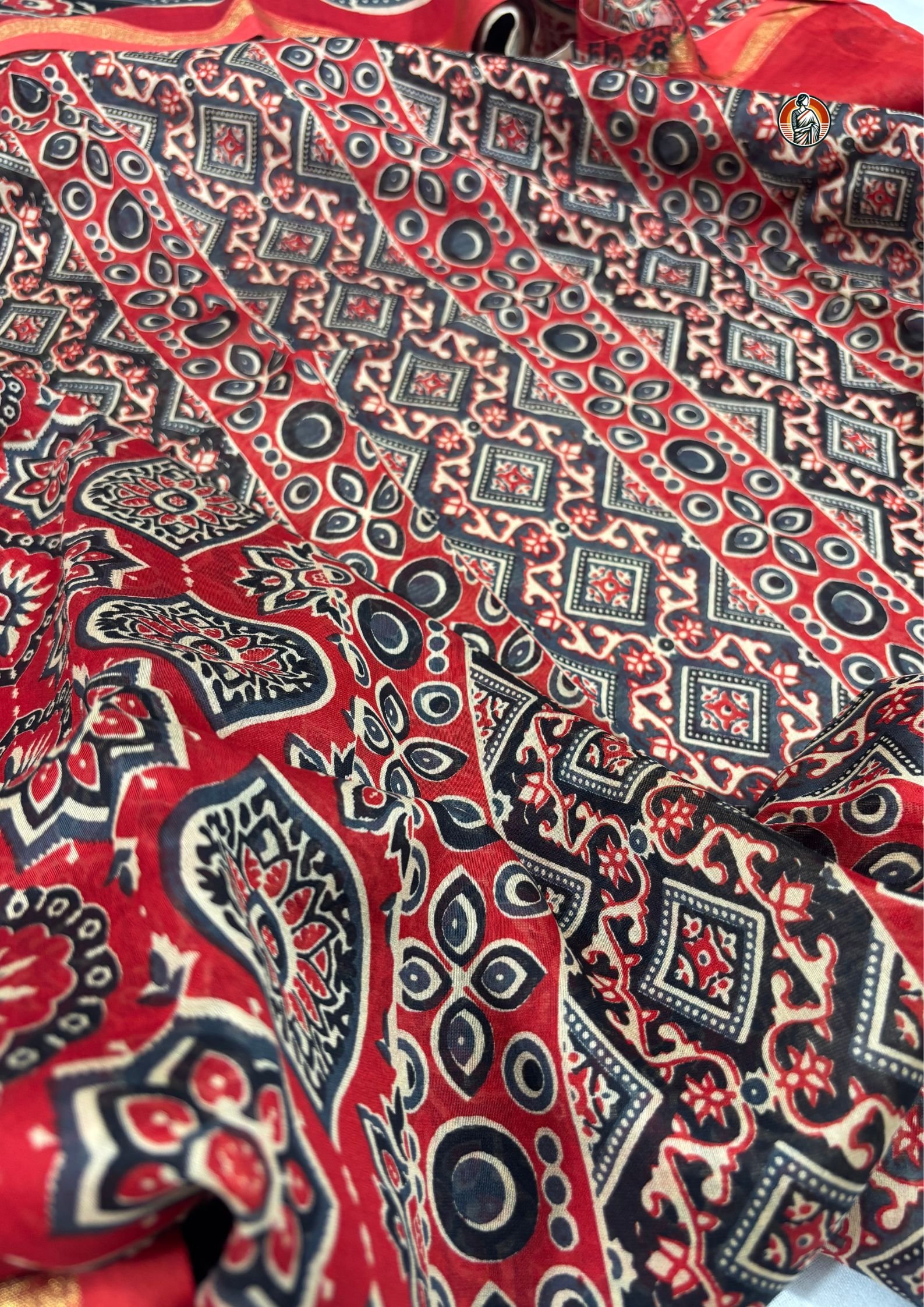 The body of the saree is filled with detailed Ajrakh-inspired motifs, arranged in a neat repeating pattern. You’ll notice a mix of floral and geometric elements in black and off-white tones, which stand out sharply against the red base and give the saree a rich, handcrafted look.