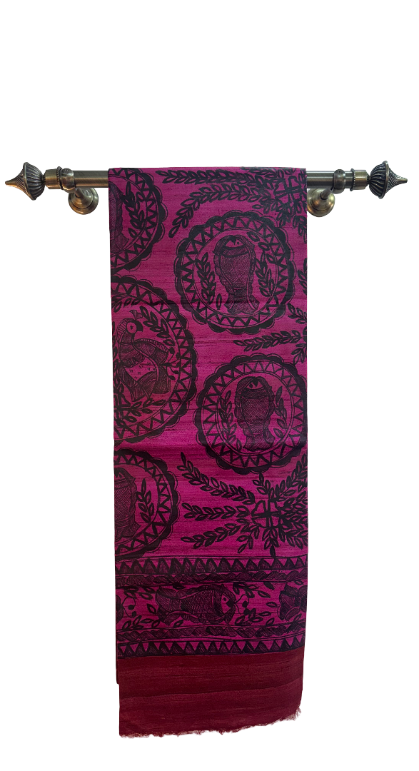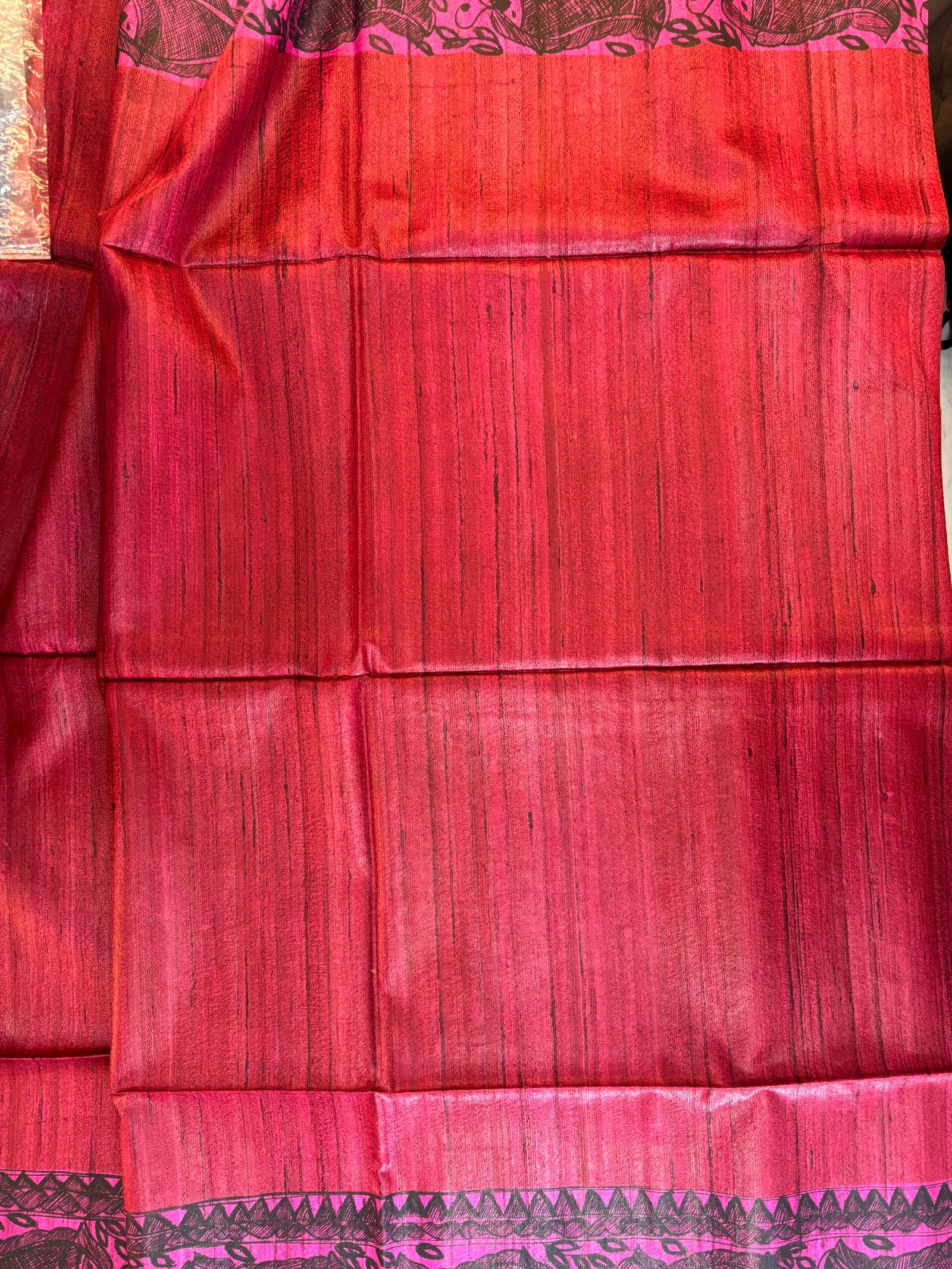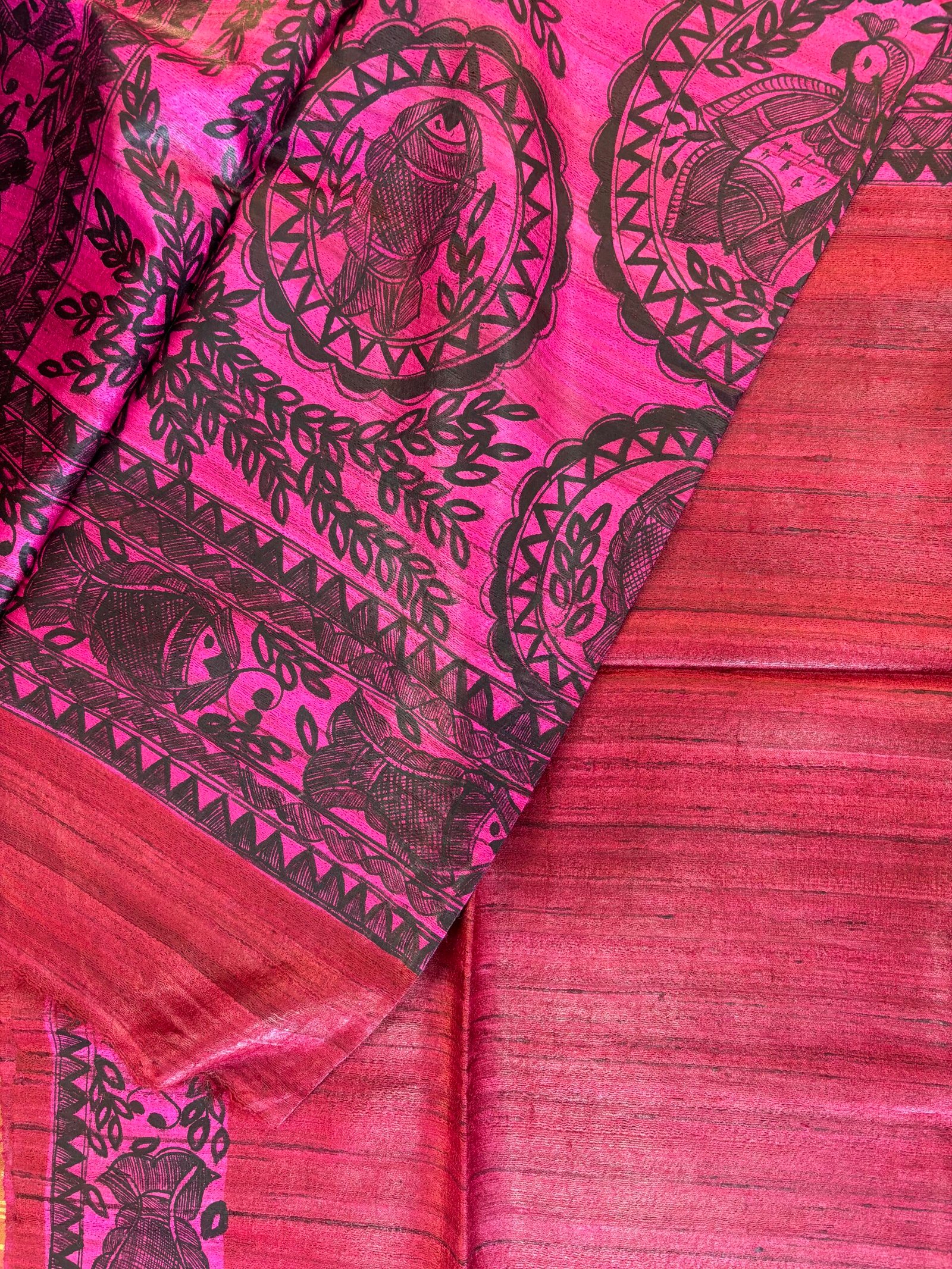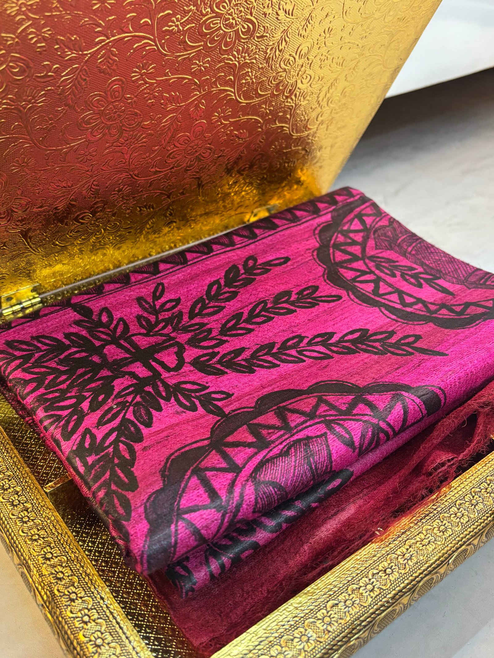 This exquisite saree is crafted from pure hand-woven Ghicha silk, known for its rich slub texture, natural shine, and earthy elegance. The saree comes in a vibrant magenta–pink base with a contrasting deep maroon pallu and border, giving it a luxurious dual-tone look.