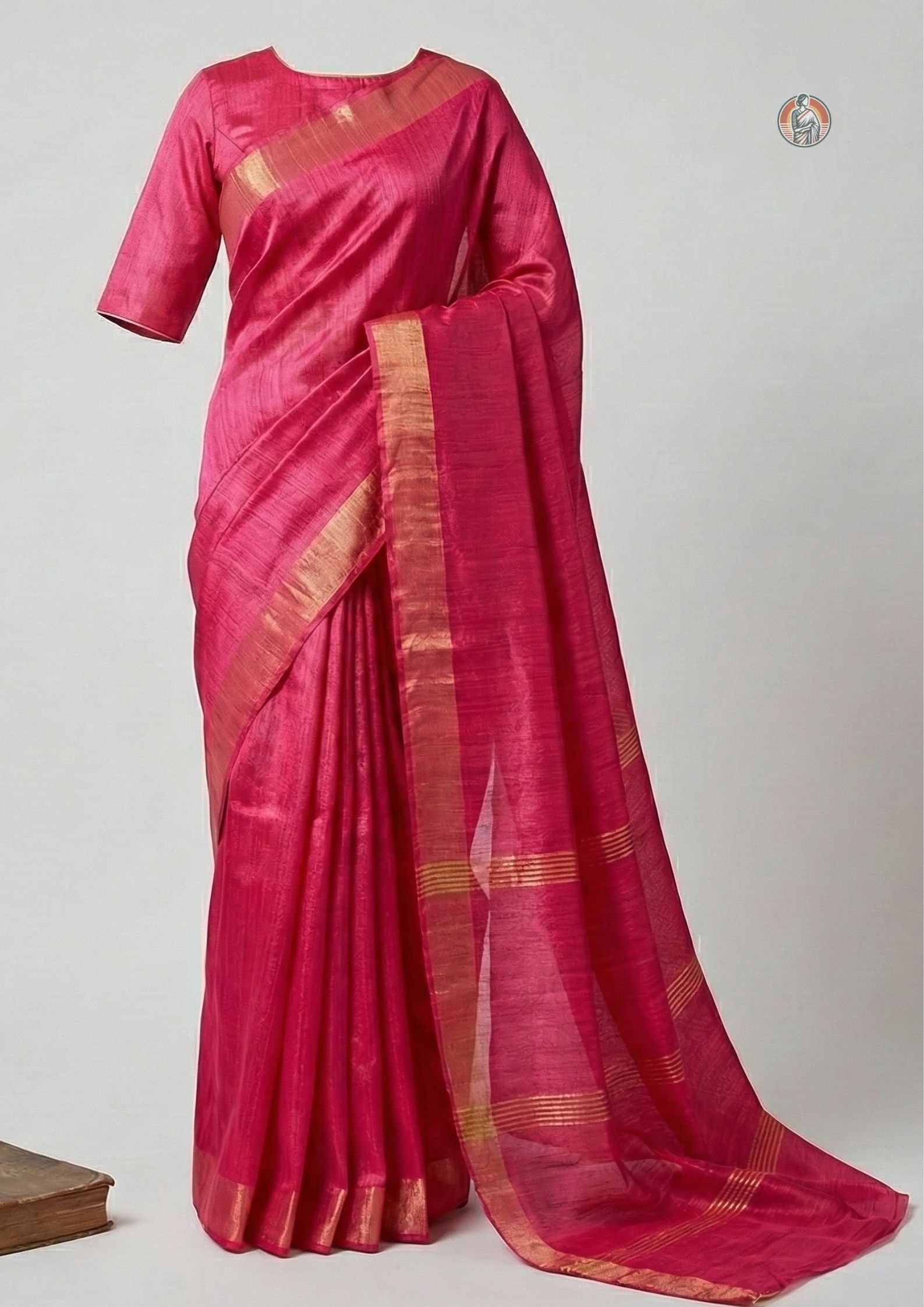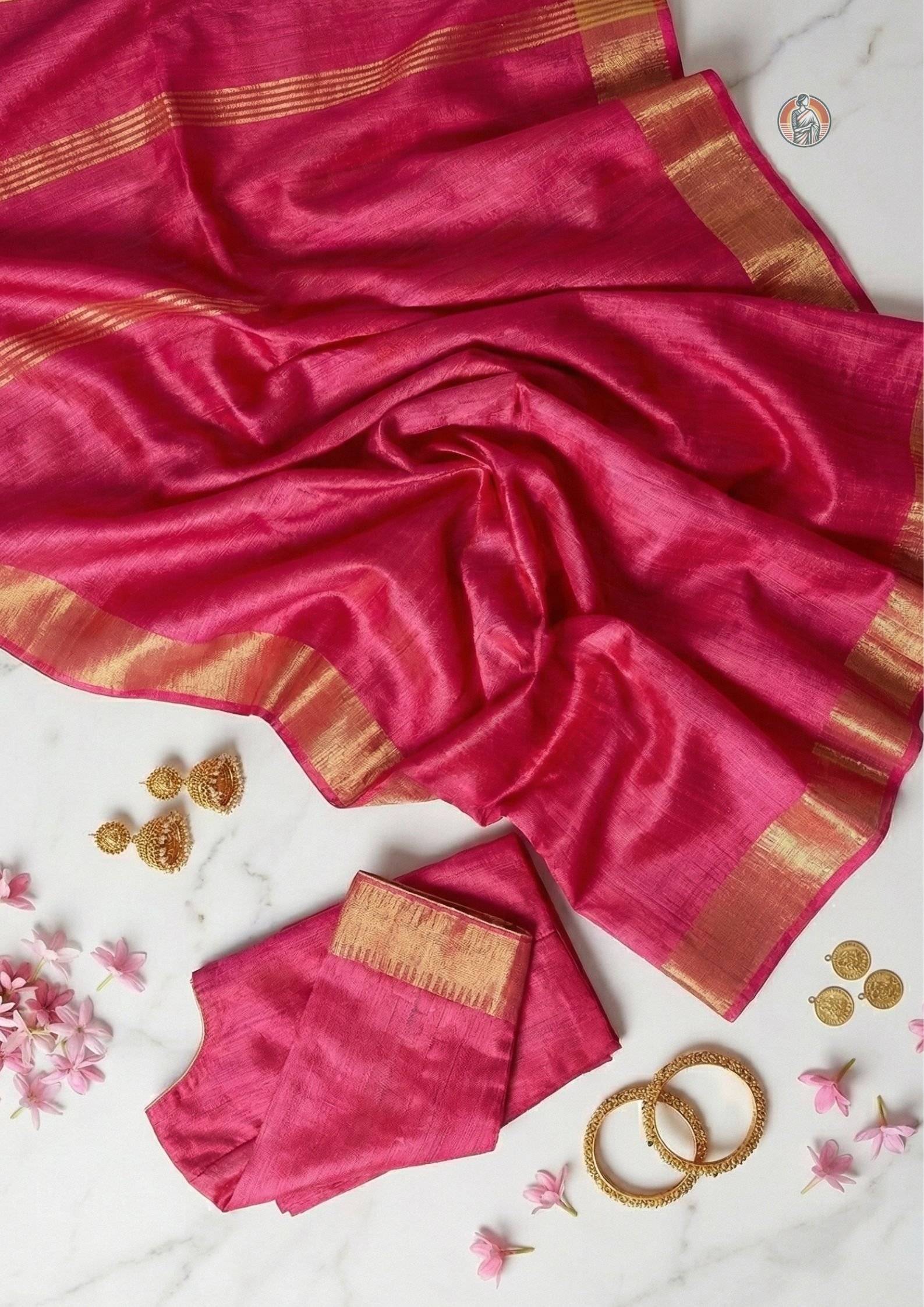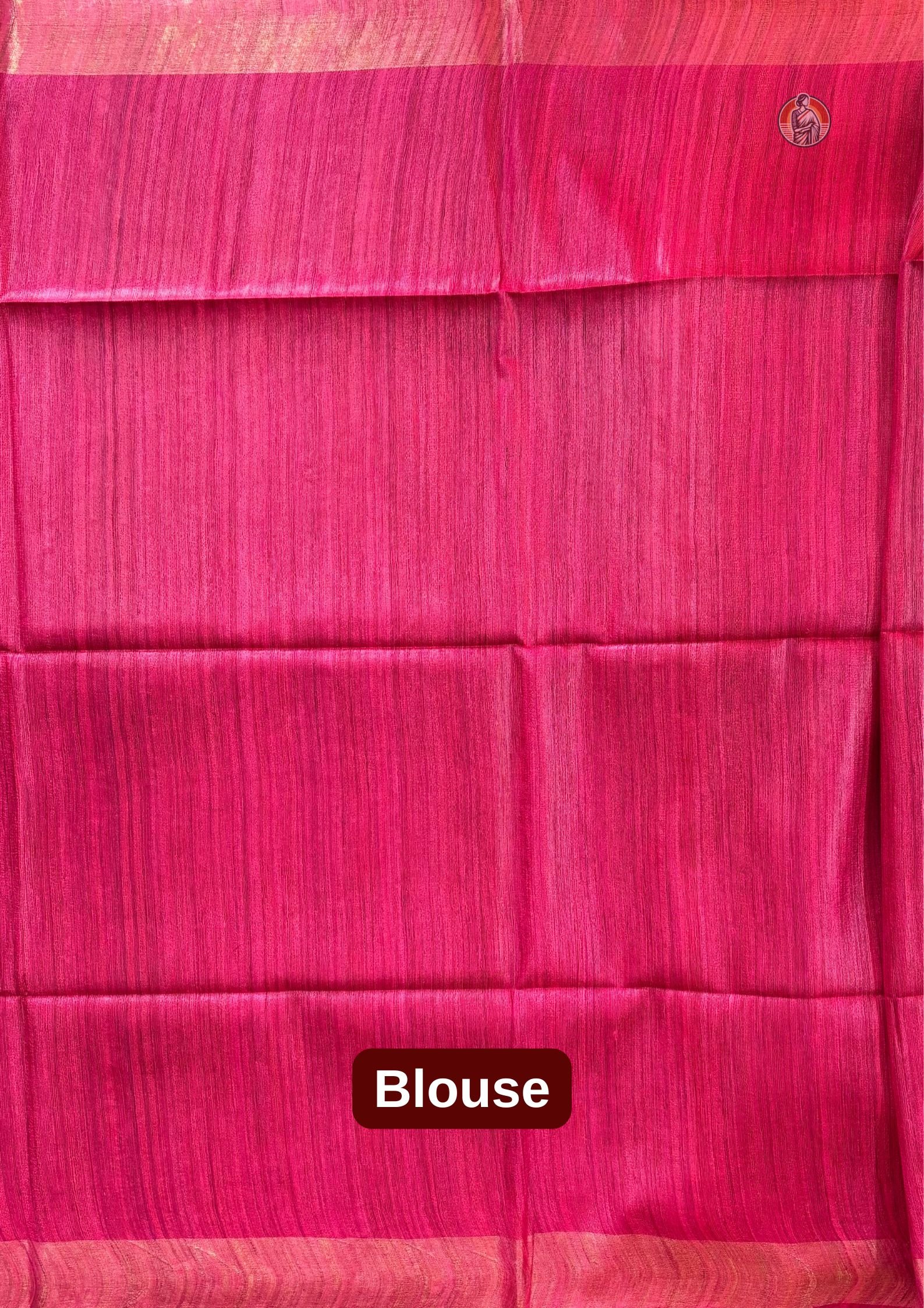 A matching blouse piece is included within the total length. The blouse fabric is in the same rani pink colour, making it easy to stitch a coordinated blouse.