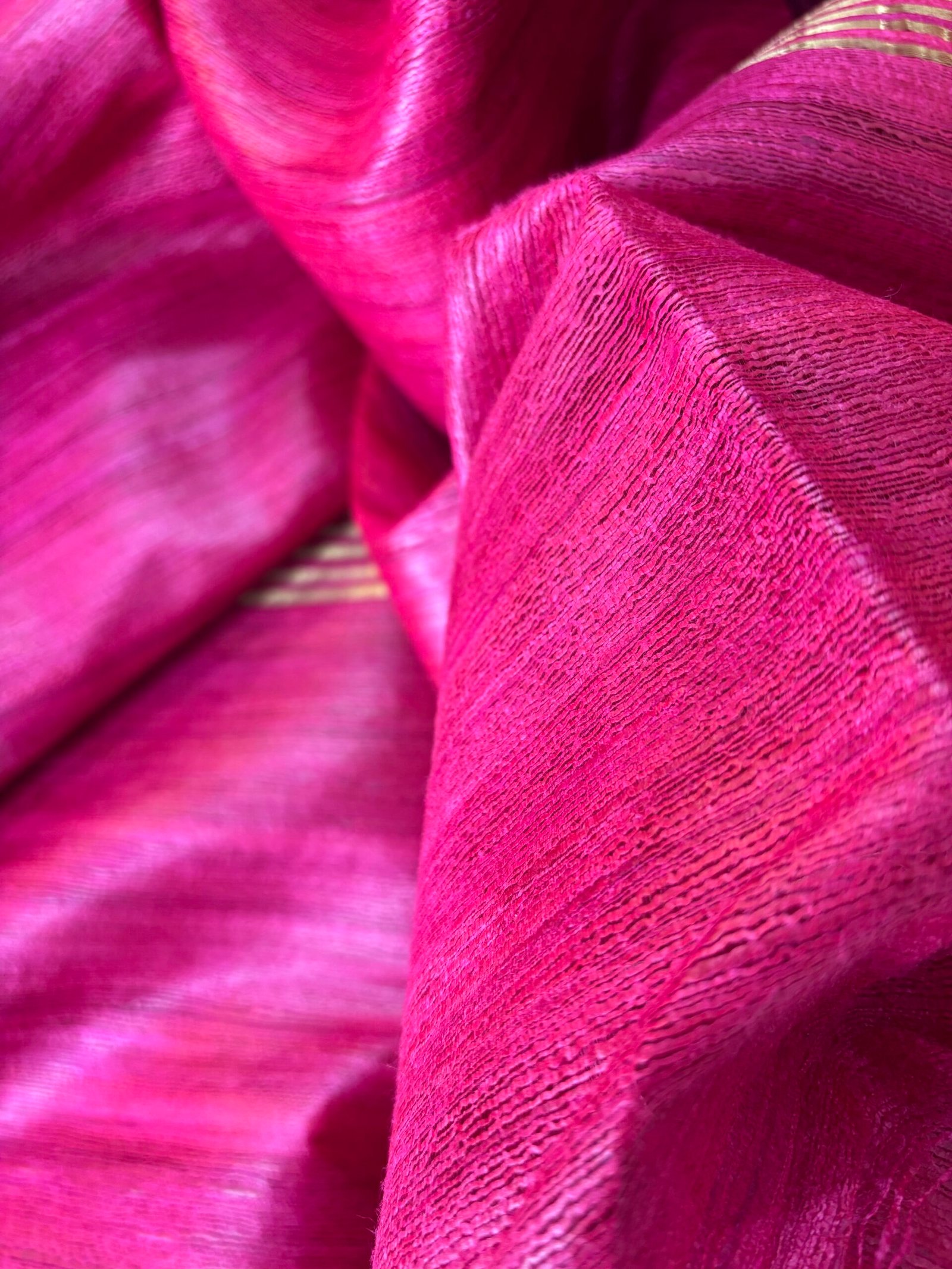 This Ghicha Silk Saree is seen in a bright rani pink colour, with slight tone variations that come naturally from ghicha silk yarn. The saree body is mostly plain, without heavy designs, allowing the raw silk texture to be clearly visible. Fine horizontal lines appear across the fabric due to the natural weave of ghicha silk, giving it a handcrafted look.