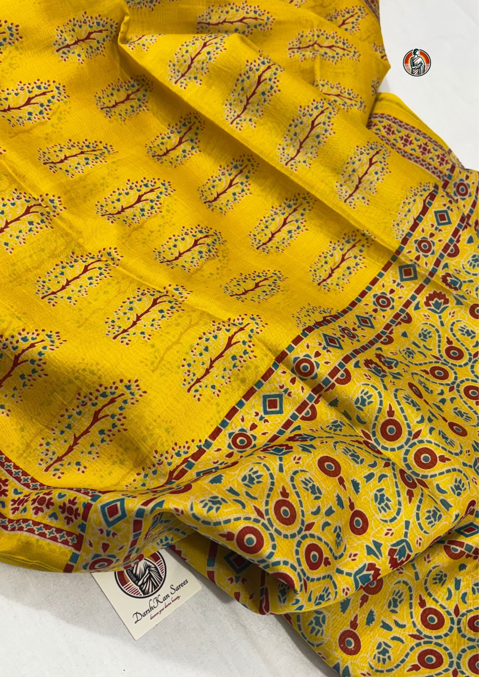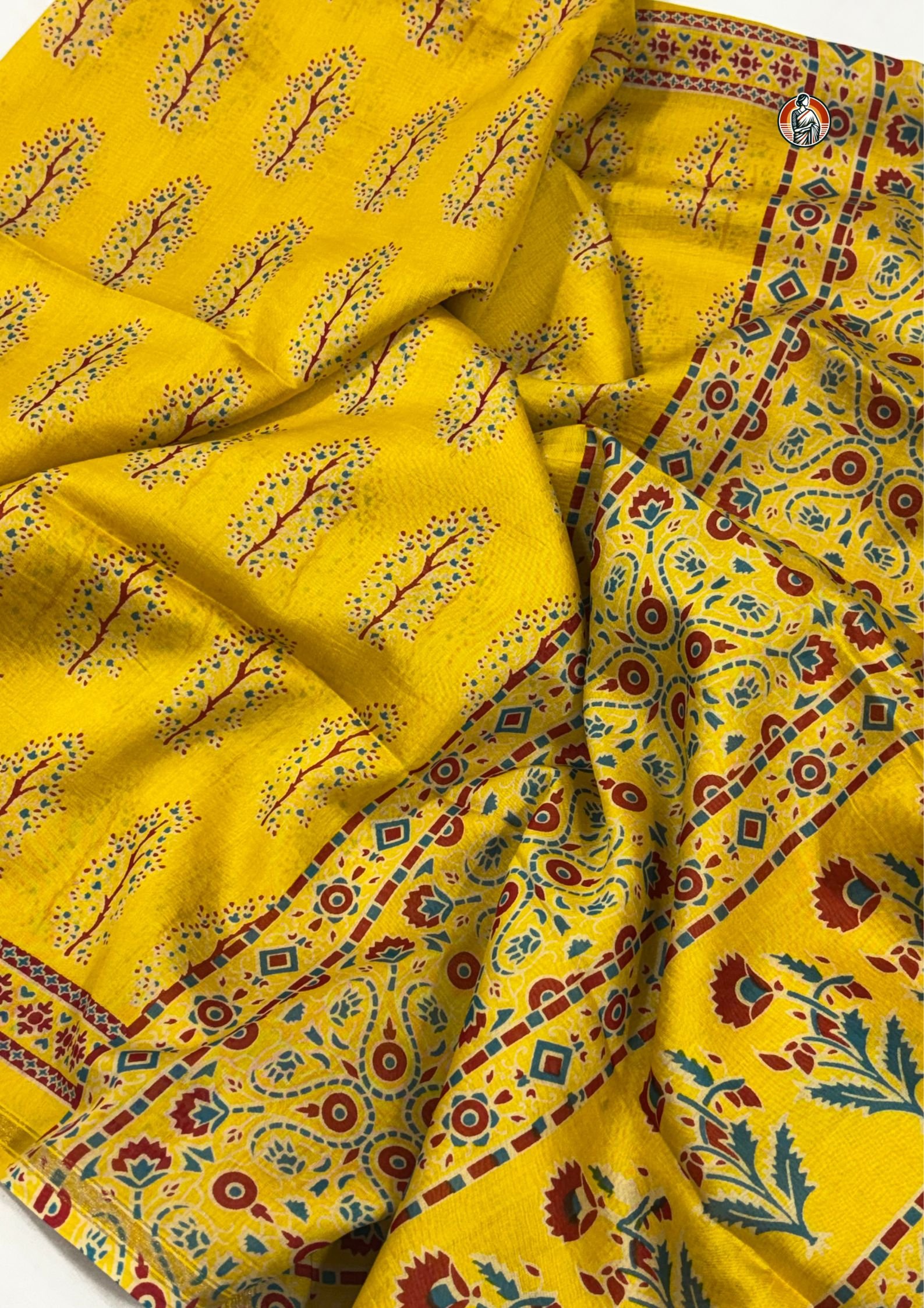 The body of the saree is decorated with small tree-inspired motifs, arranged neatly in rows. These are printed in soft multicolor tones, adding a gentle contrast without overpowering the bright yellow base.