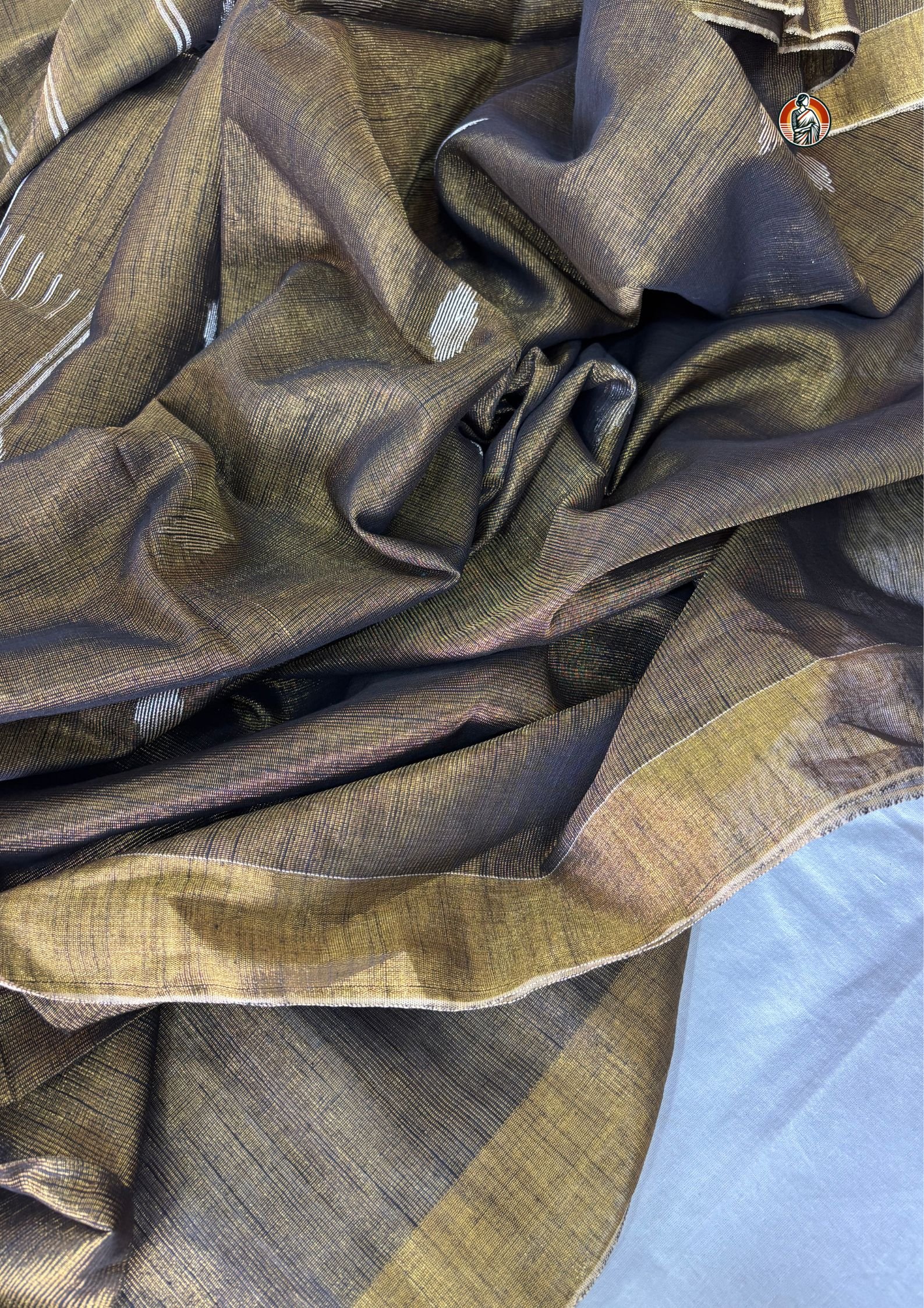 This beautiful saree is made from Tissue Linen fabric, which combines the light texture of linen with the soft sheen of tissue weave. The fabric has a gentle shine that gives the saree a refined and graceful look while still feeling light and comfortable.