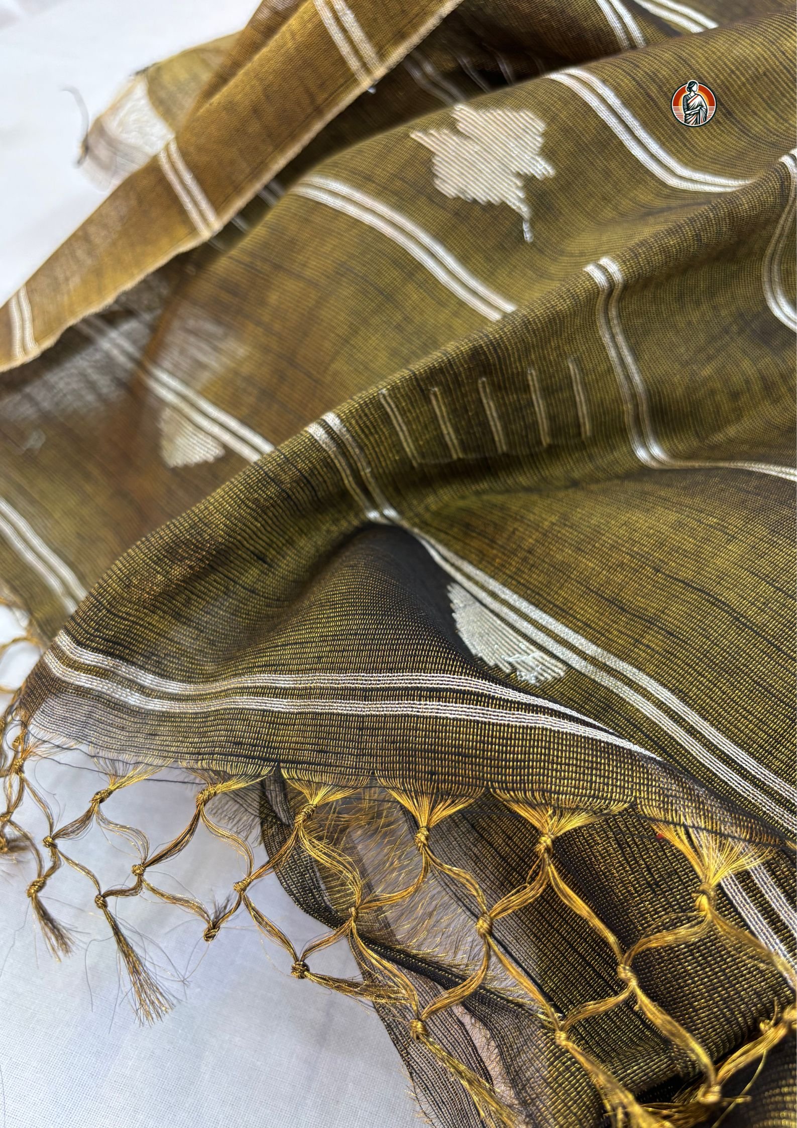 The saree comes in a warm antique gold and brown shade, which creates a slightly metallic appearance because of the tissue weave. The colour shifts subtly under light, giving the saree a rich handcrafted look.