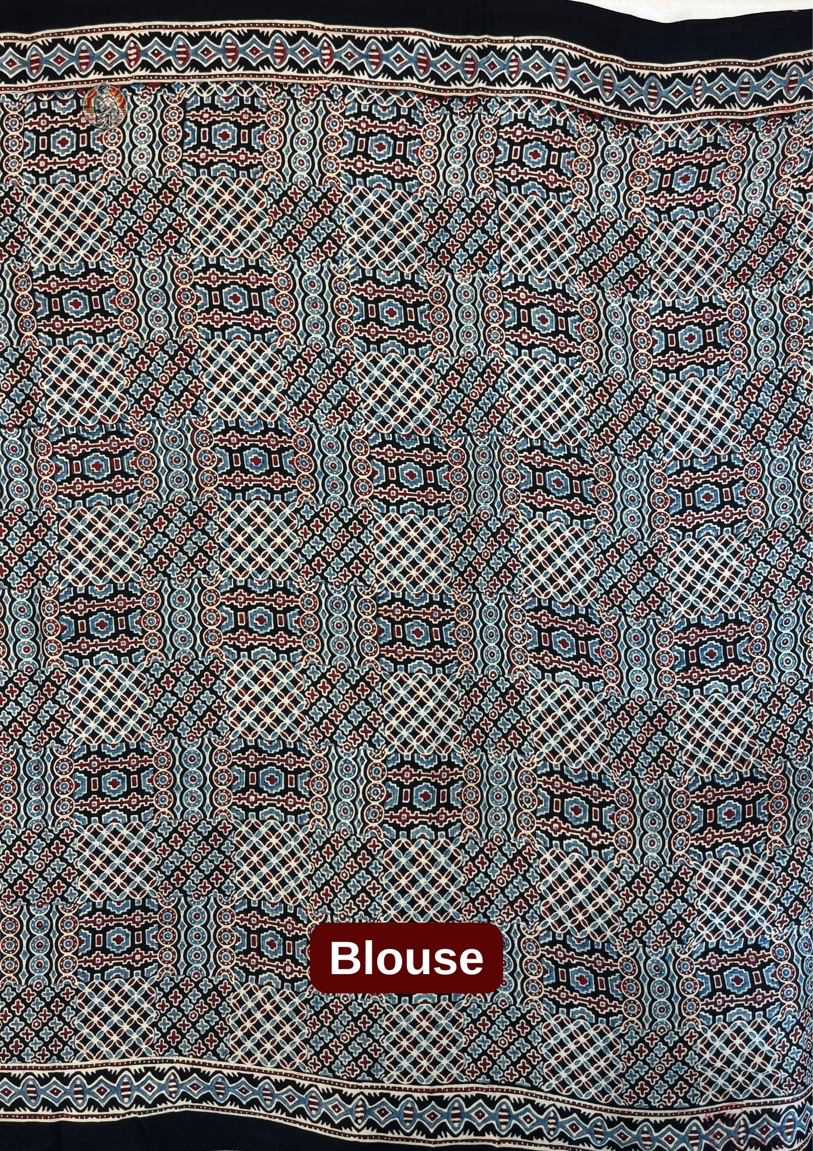 The saree also includes a matching blouse piece with detailed Ajrakh geometric print, allowing it to be stitched into a coordinated blouse.