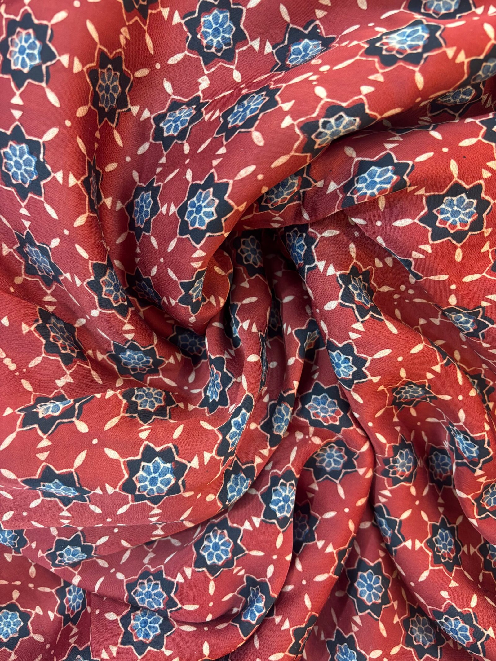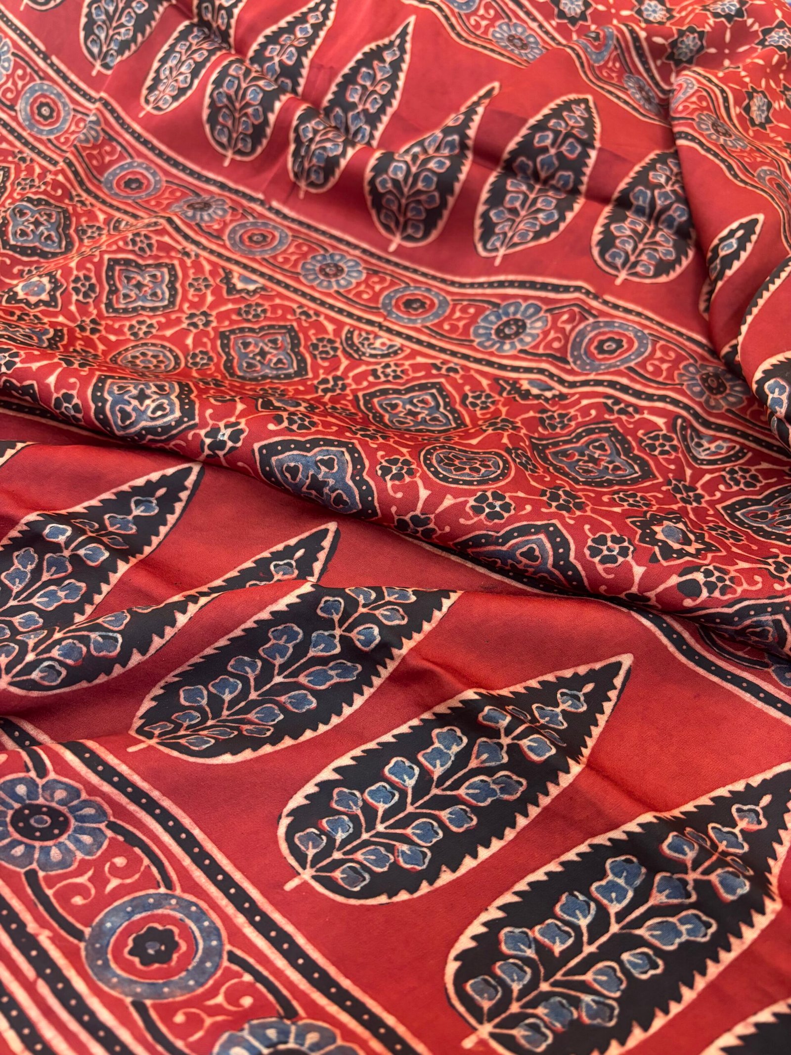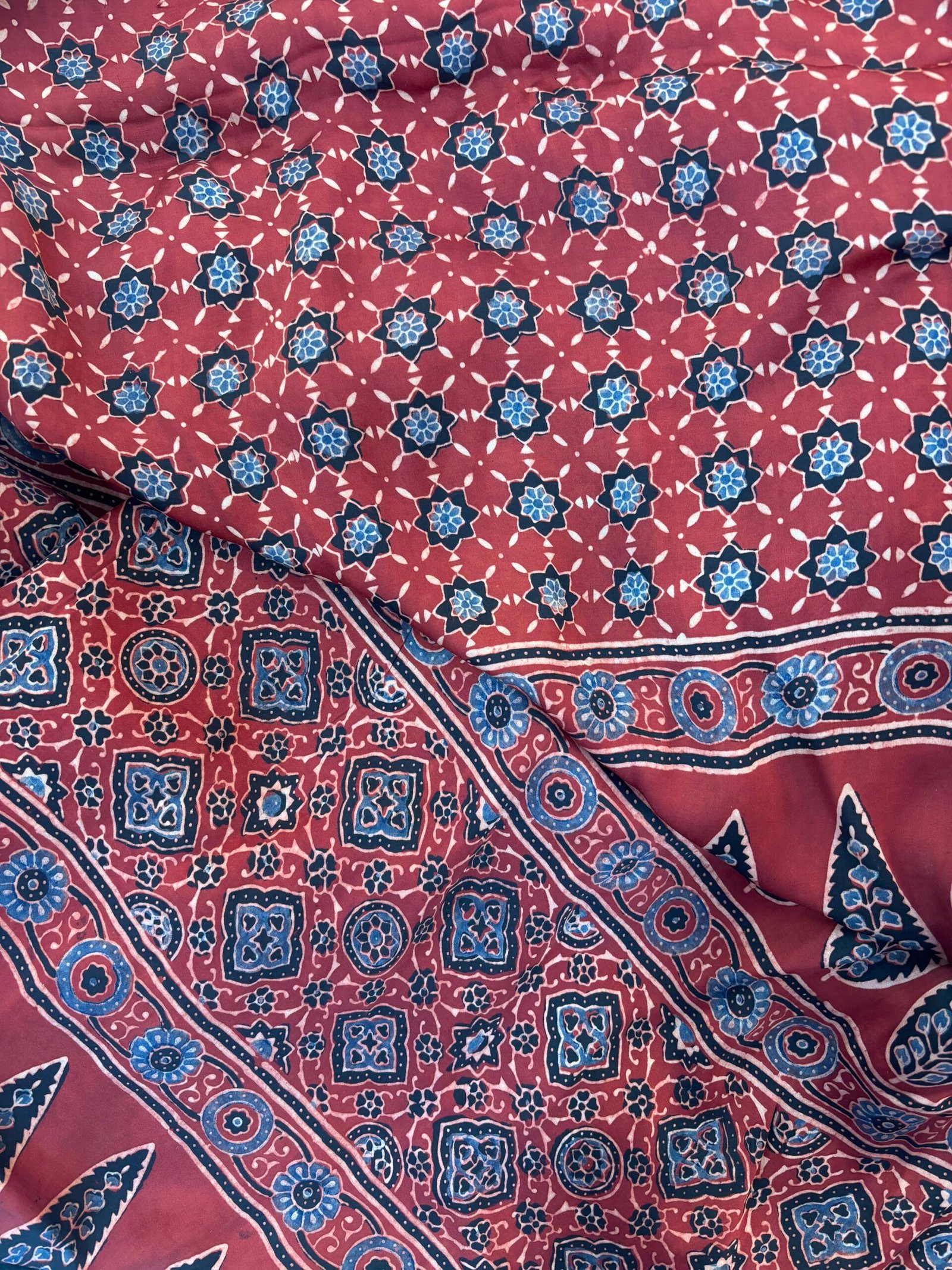 This Modal Silk Ajrak Print Saree comes in a deep rust red / maroon red base, giving it a bold yet classic traditional look. The saree body is adorned with small, evenly repeated geometric floral motifs, arranged uniformly across the fabric. These motifs are printed in indigo blue and off-white, creating a beautiful contrast against the red background and maintaining the authentic Ajrak aesthetic.