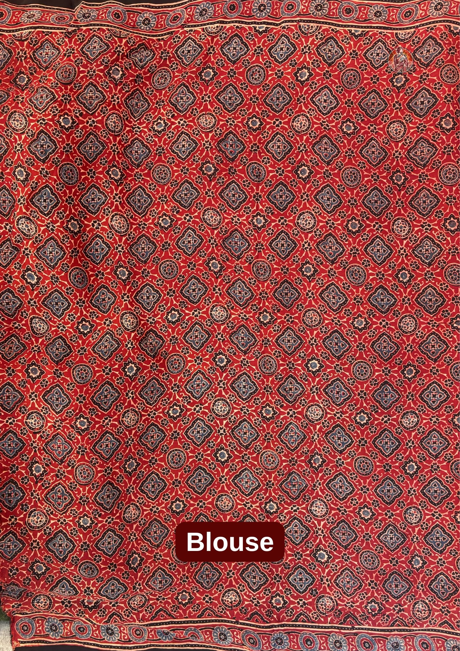 The saree includes a matching printed blouse piece within the total length, designed in coordinating Ajrak patterns to complement the overall look.