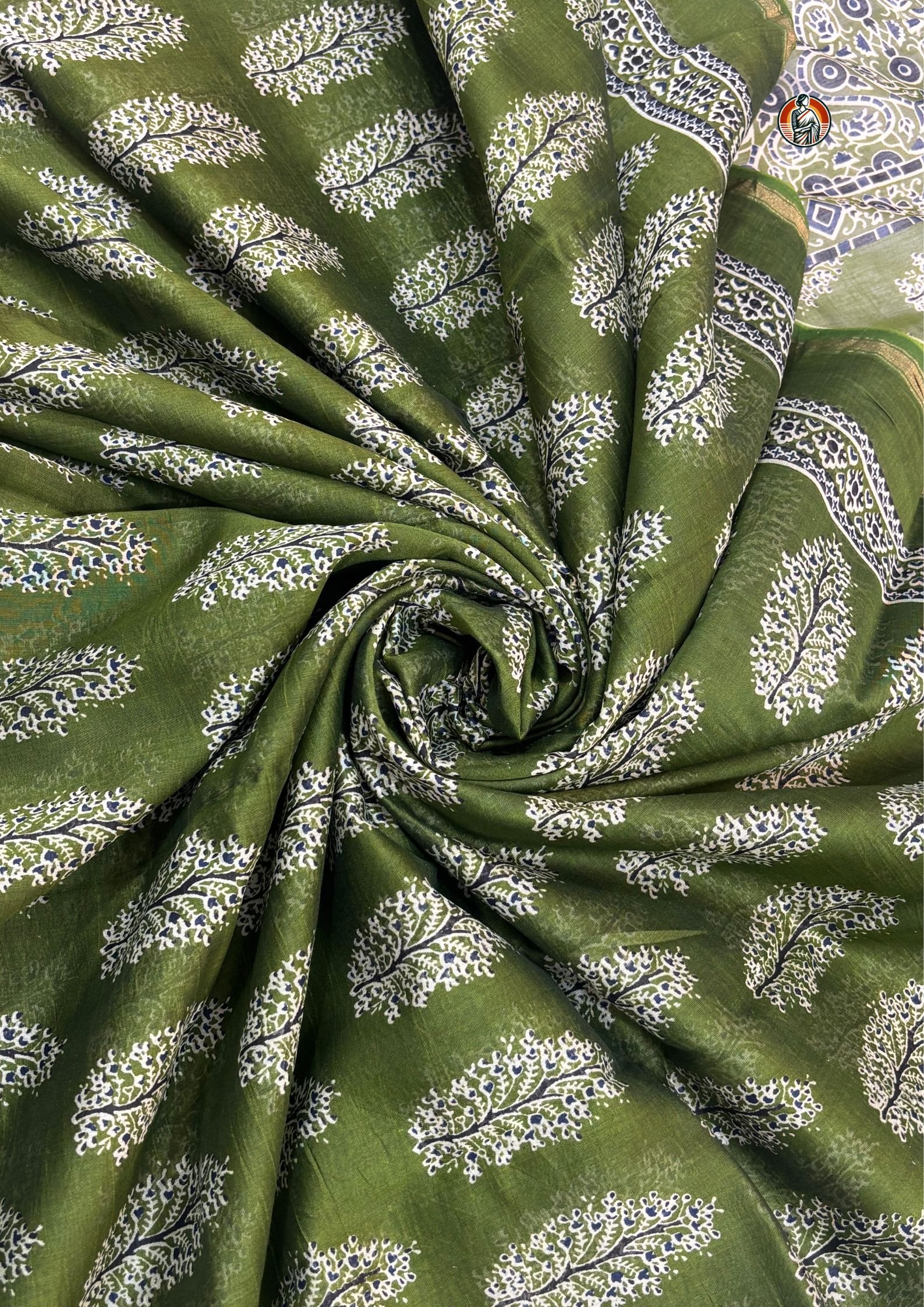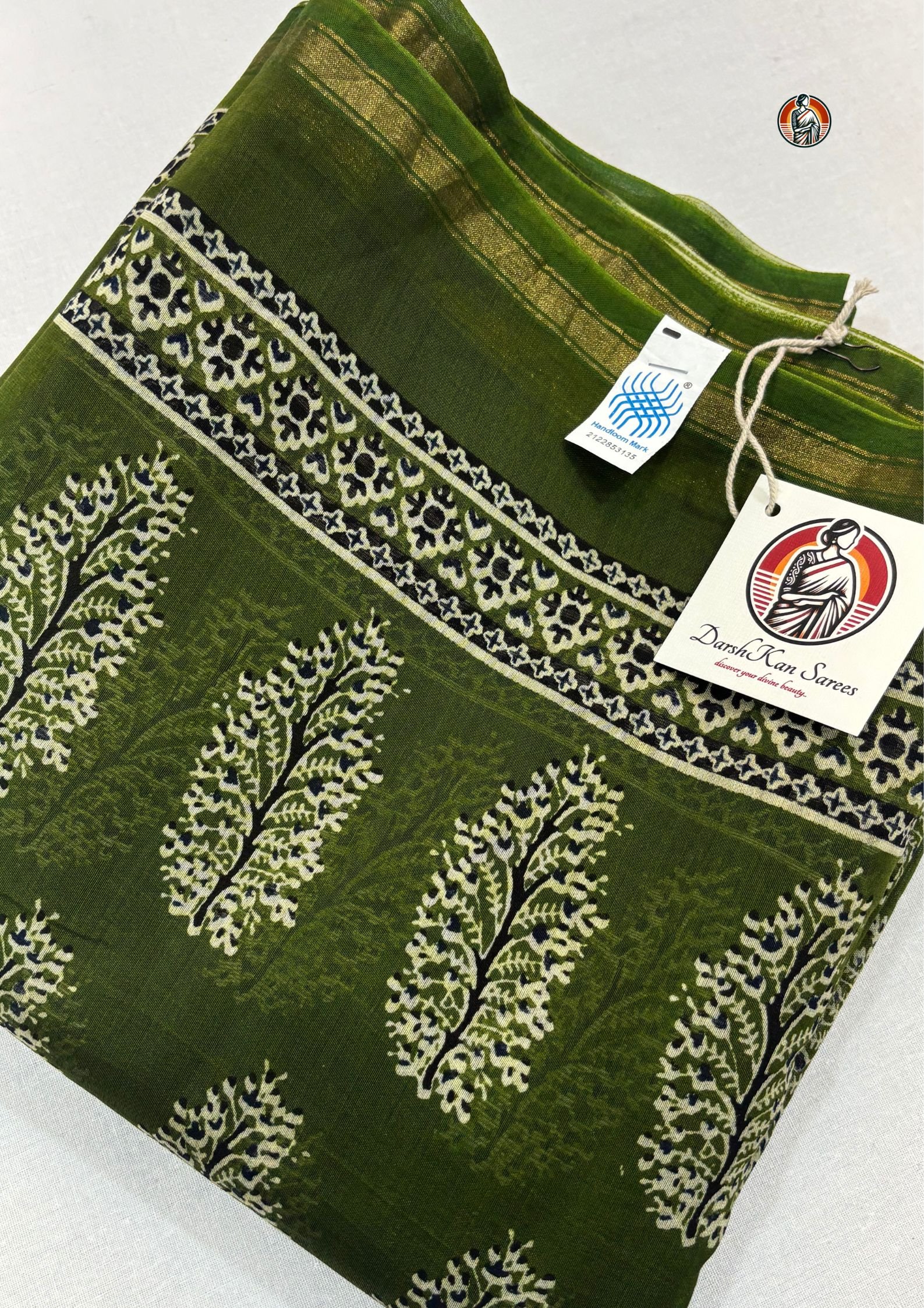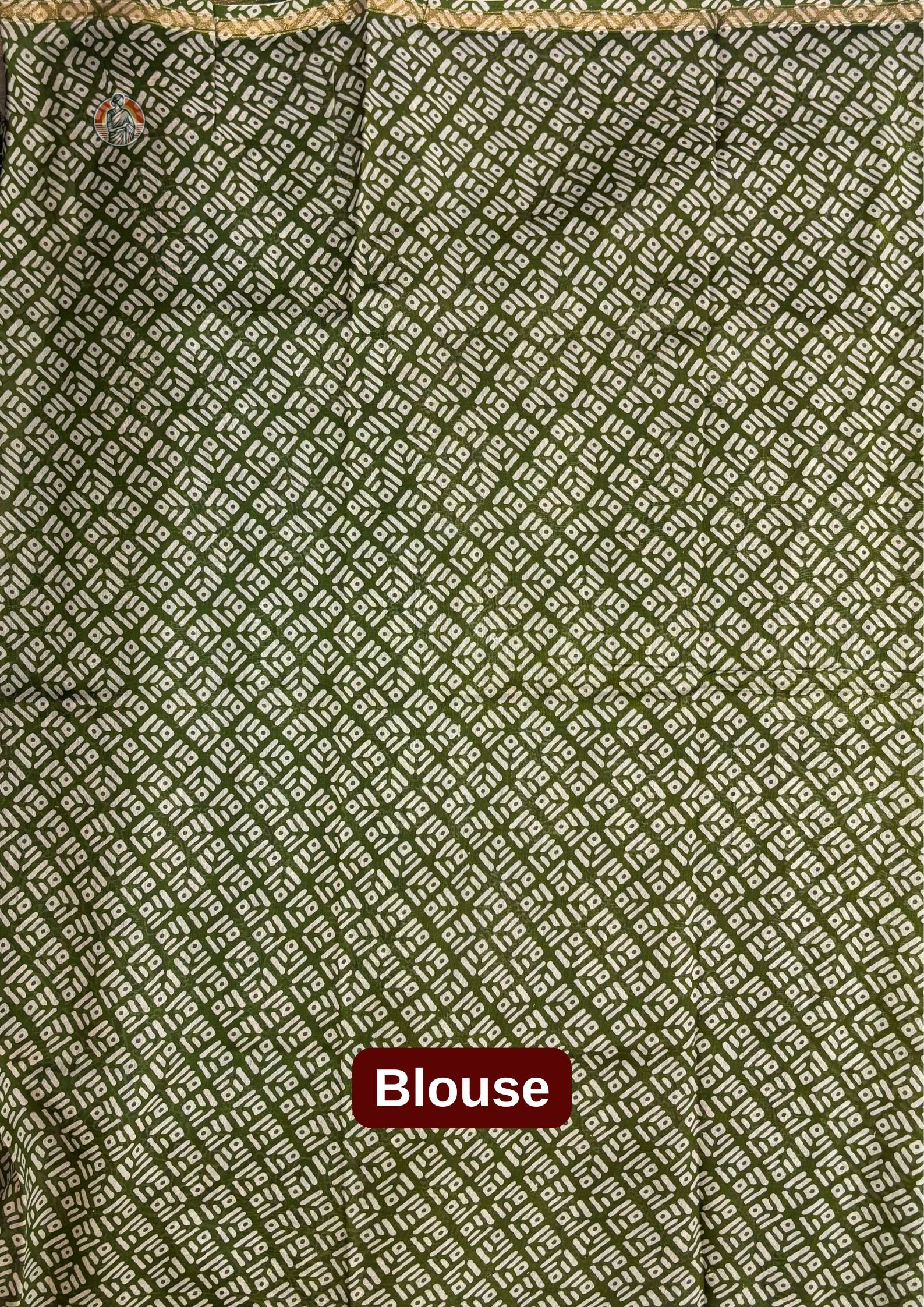 This Chanderi handloom saree has a lovely olive green base with a natural sheen that comes beautifully through in the weave. The saree is decorated with neat handblock prints in off-white and deep blue, giving it a very traditional yet easy-to-wear look. The body has small repeated leaf-inspired motifs arranged in an even all-over pattern, while the lower part of the saree features a more detailed pallu design with floral and geometric borders. The border is finished with a mix of traditional motifs that add character without making the saree look heavy. The blouse piece is also coordinated in the same olive green tone with matching handblock-style patterning, so the whole set feels complete and balanced. This is the kind of saree that looks elegant without trying too hard — soft, classic, and rooted in handloom charm.