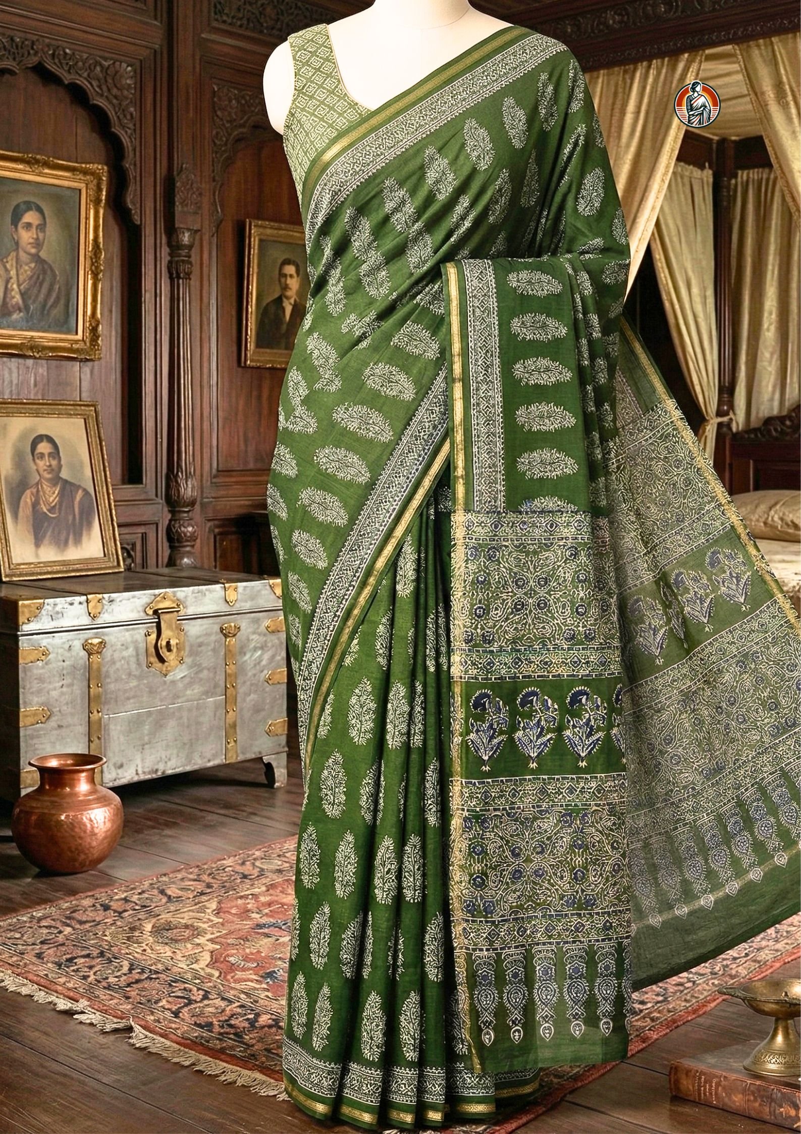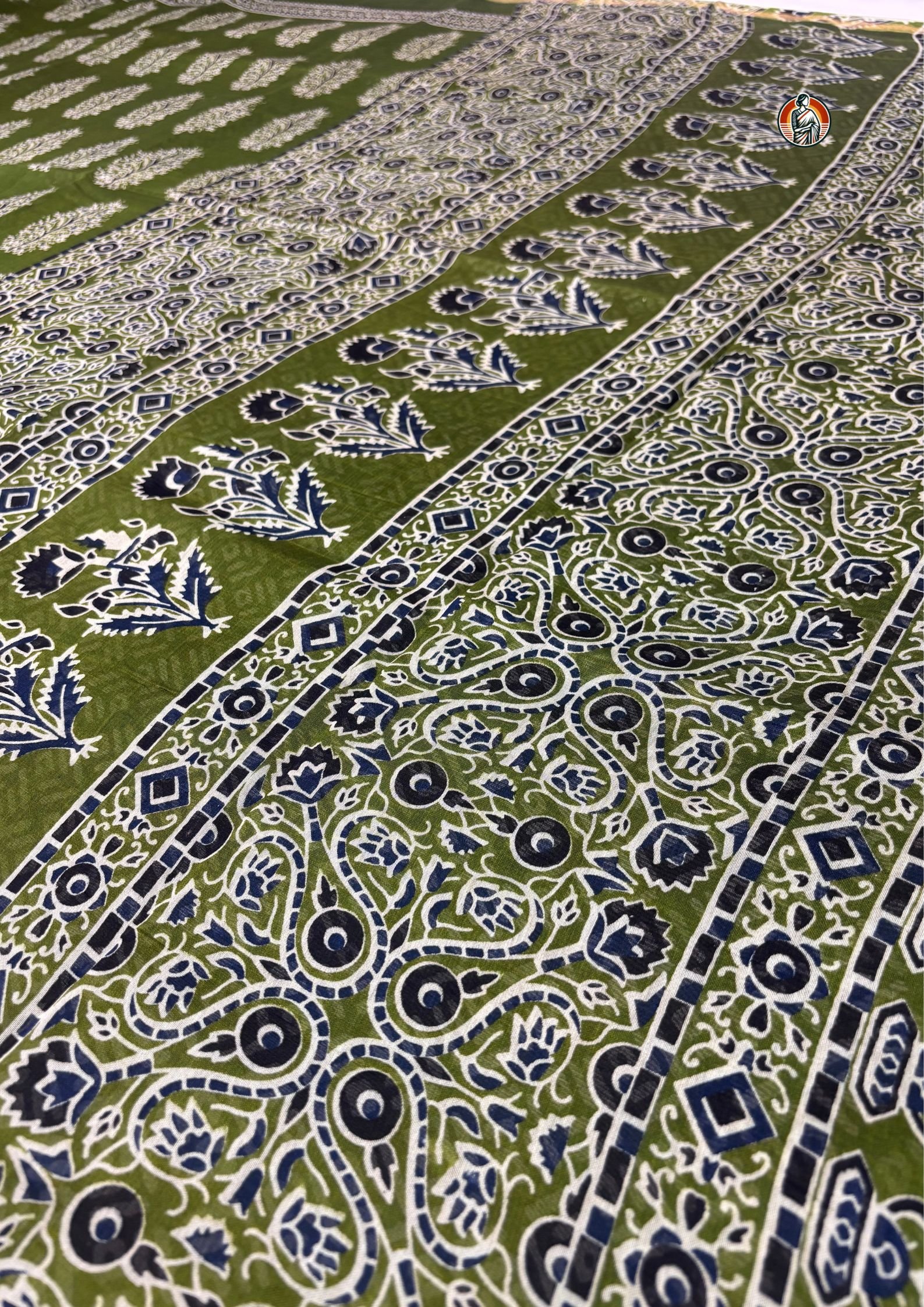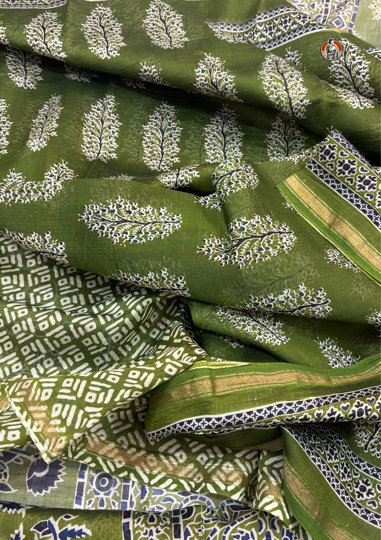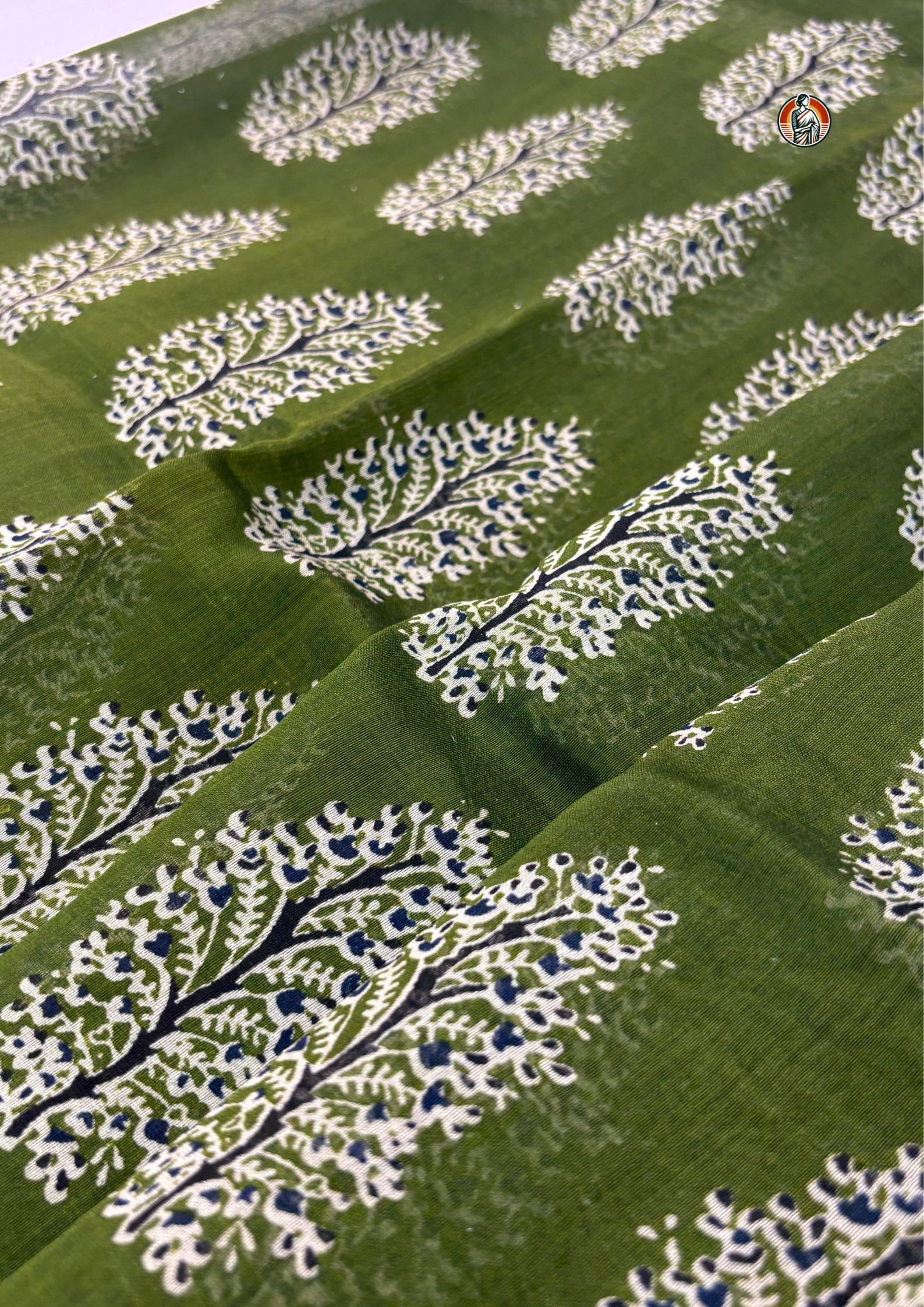 This Chanderi handloom saree has a lovely olive green base with a natural sheen that comes beautifully through in the weave. The saree is decorated with neat handblock prints in off-white and deep blue, giving it a very traditional yet easy-to-wear look. The body has small repeated leaf-inspired motifs arranged in an even all-over pattern, while the lower part of the saree features a more detailed pallu design with floral and geometric borders. The border is finished with a mix of traditional motifs that add character without making the saree look heavy. The blouse piece is also coordinated in the same olive green tone with matching handblock-style patterning, so the whole set feels complete and balanced. This is the kind of saree that looks elegant without trying too hard — soft, classic, and rooted in handloom charm.