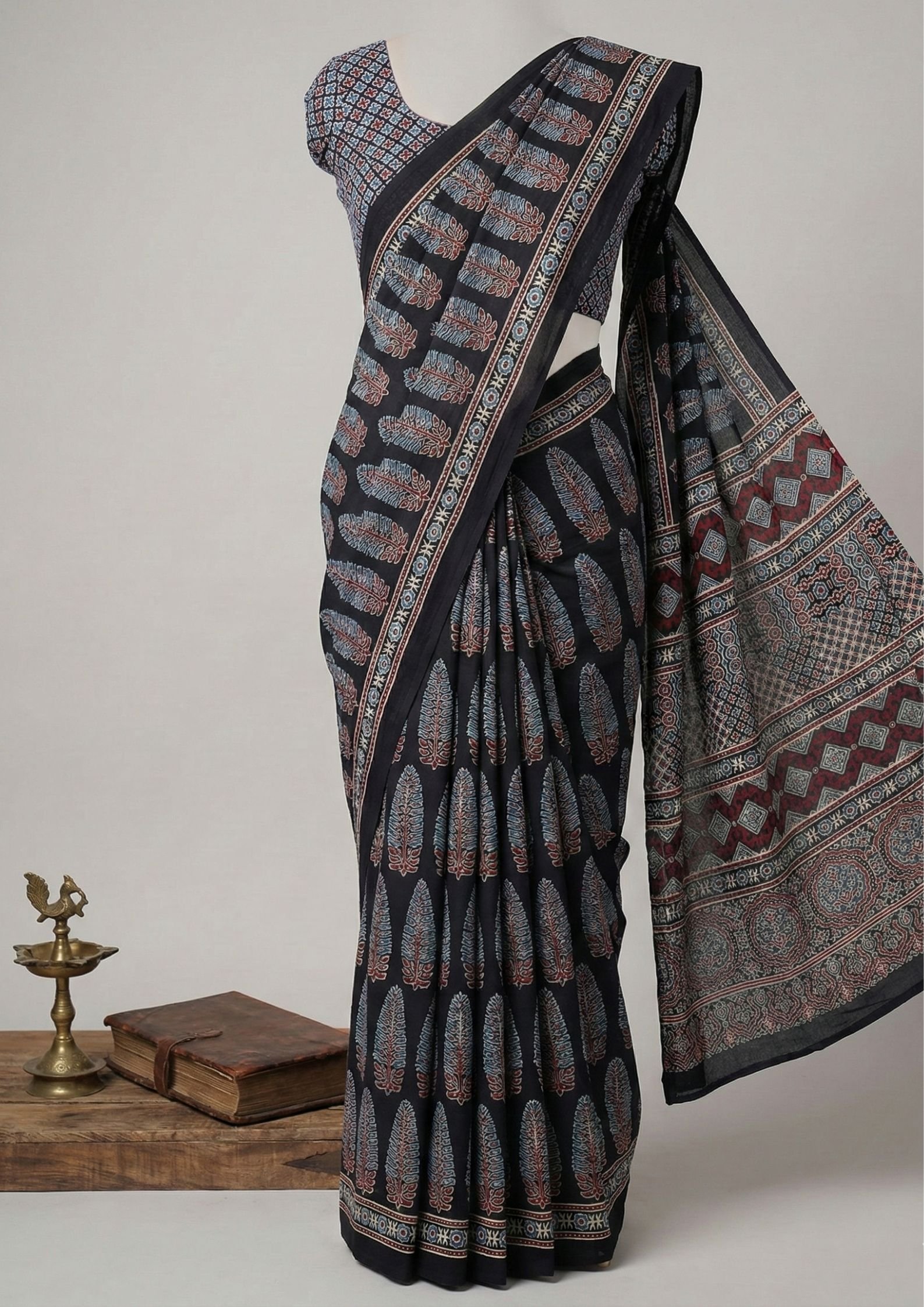Be the first to review “Pure Modal Silk Ajrakh Saree in Black with Traditional Leaf Motif Block Print”