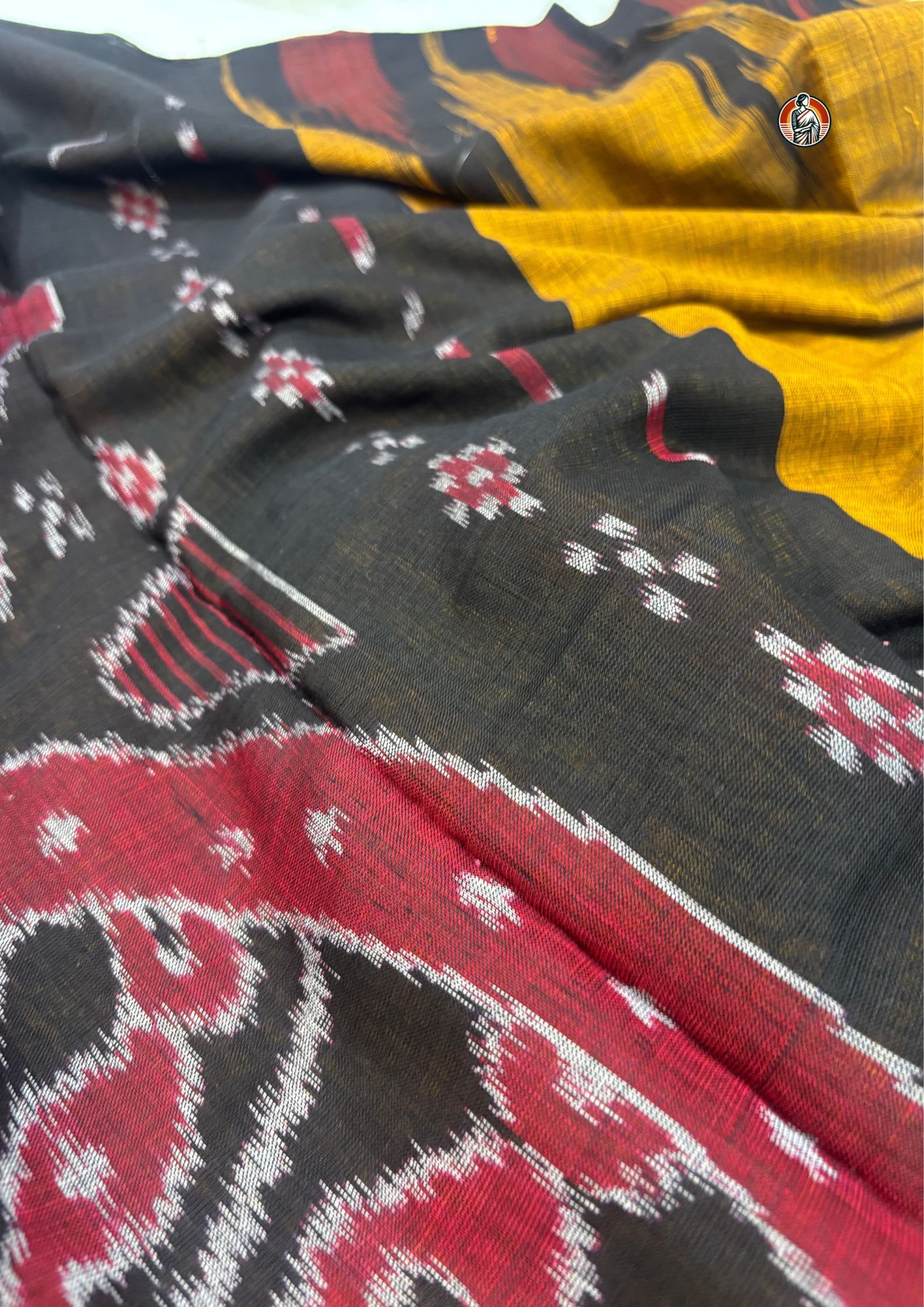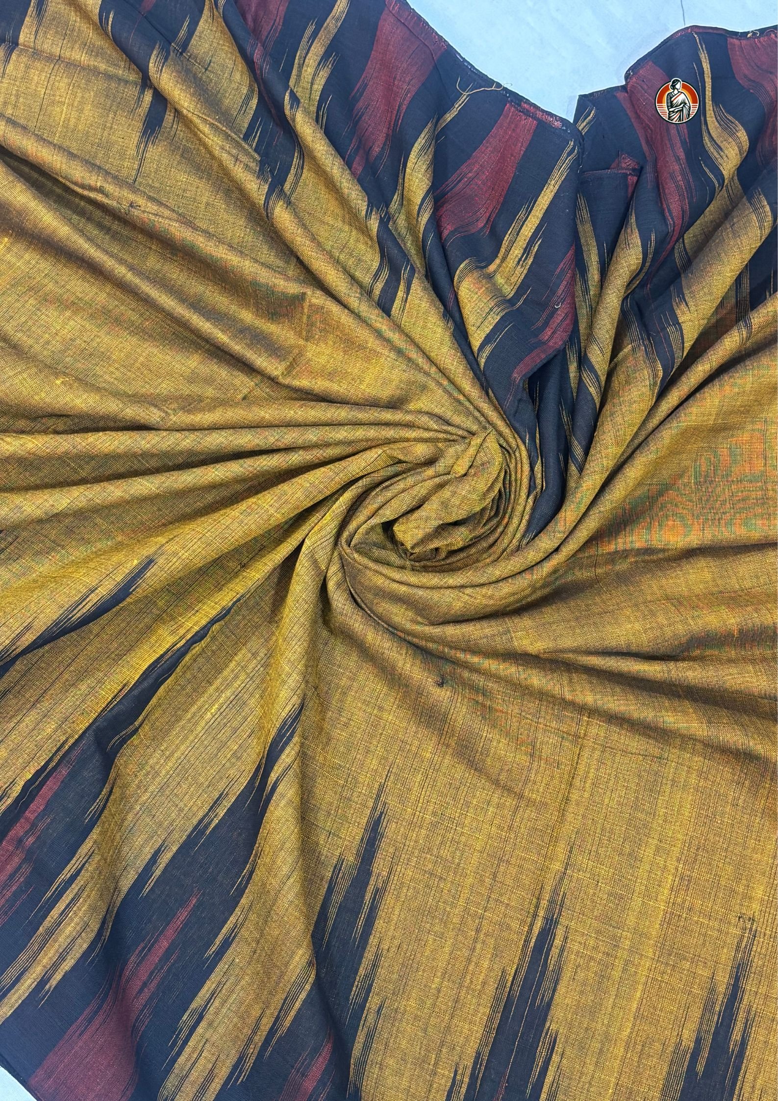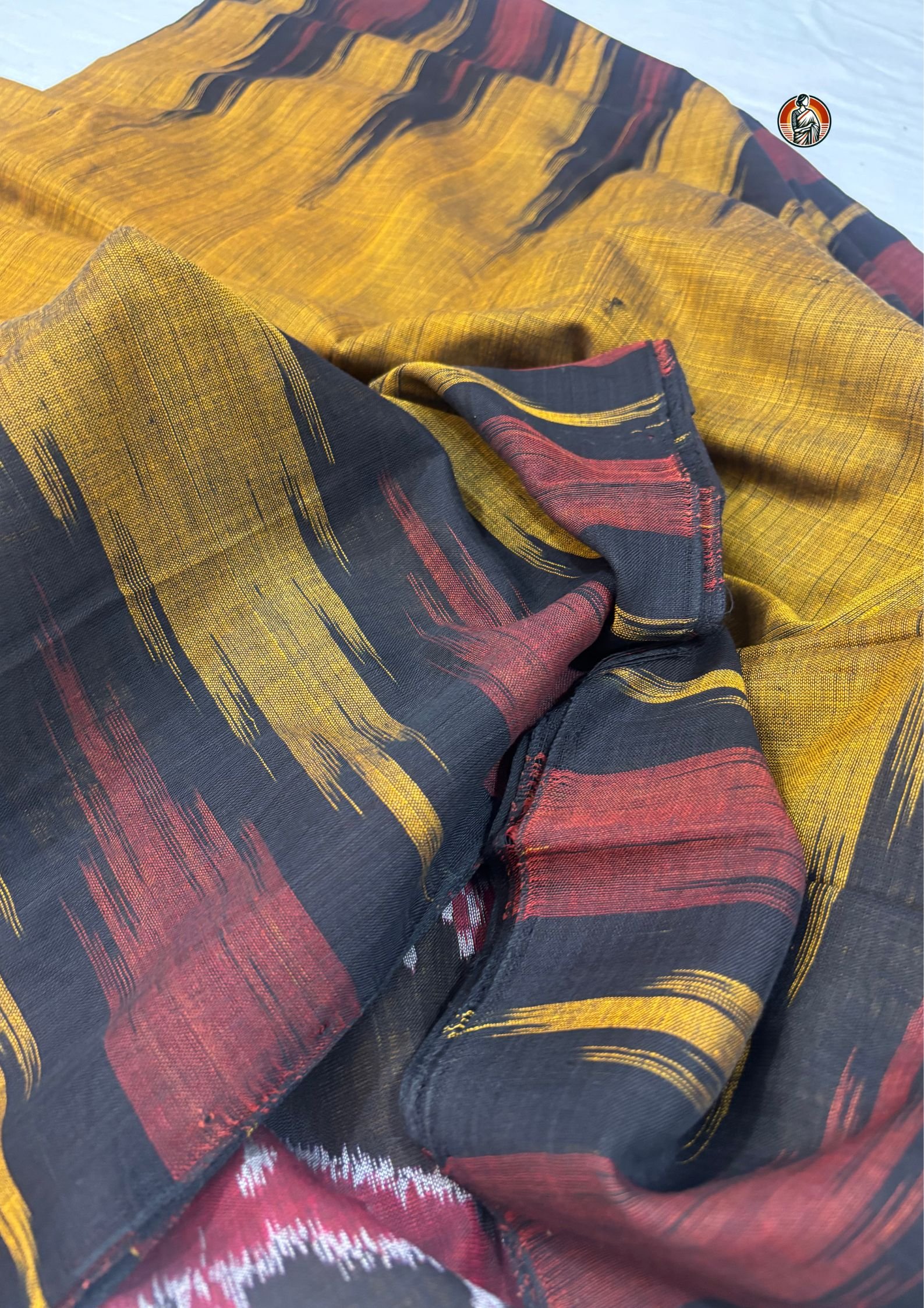 This Sambalpuri ikat handloom saree has a very rich and earthy feel. The main body comes in a mustard yellow to golden yellow shade, with a soft handloom texture that gives it a natural woven finish. The edges of the saree have bold black ikat-style jagged motifs with touches of deep maroon, which create a strong contrast and give the saree its signature Sambalpuri look.