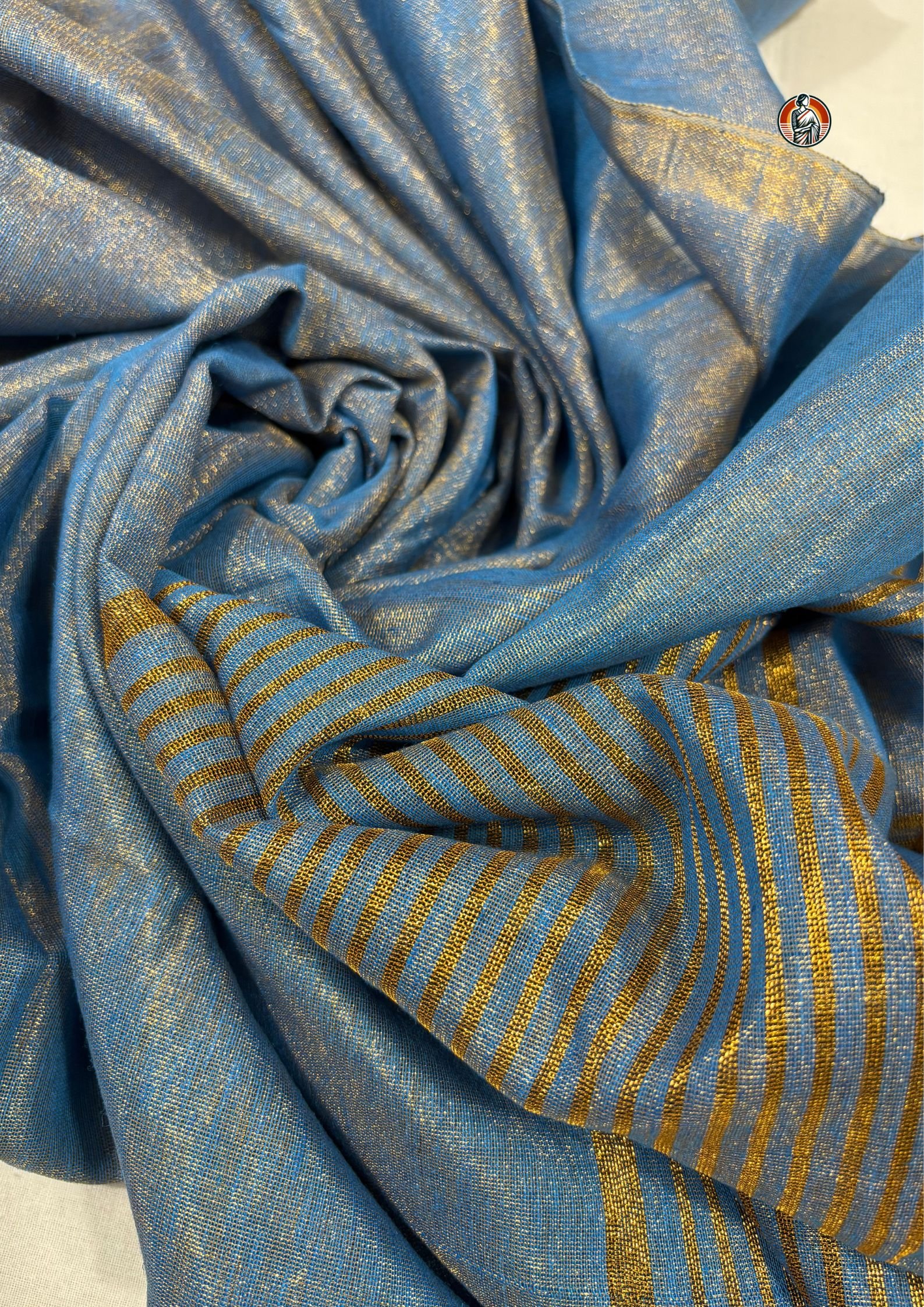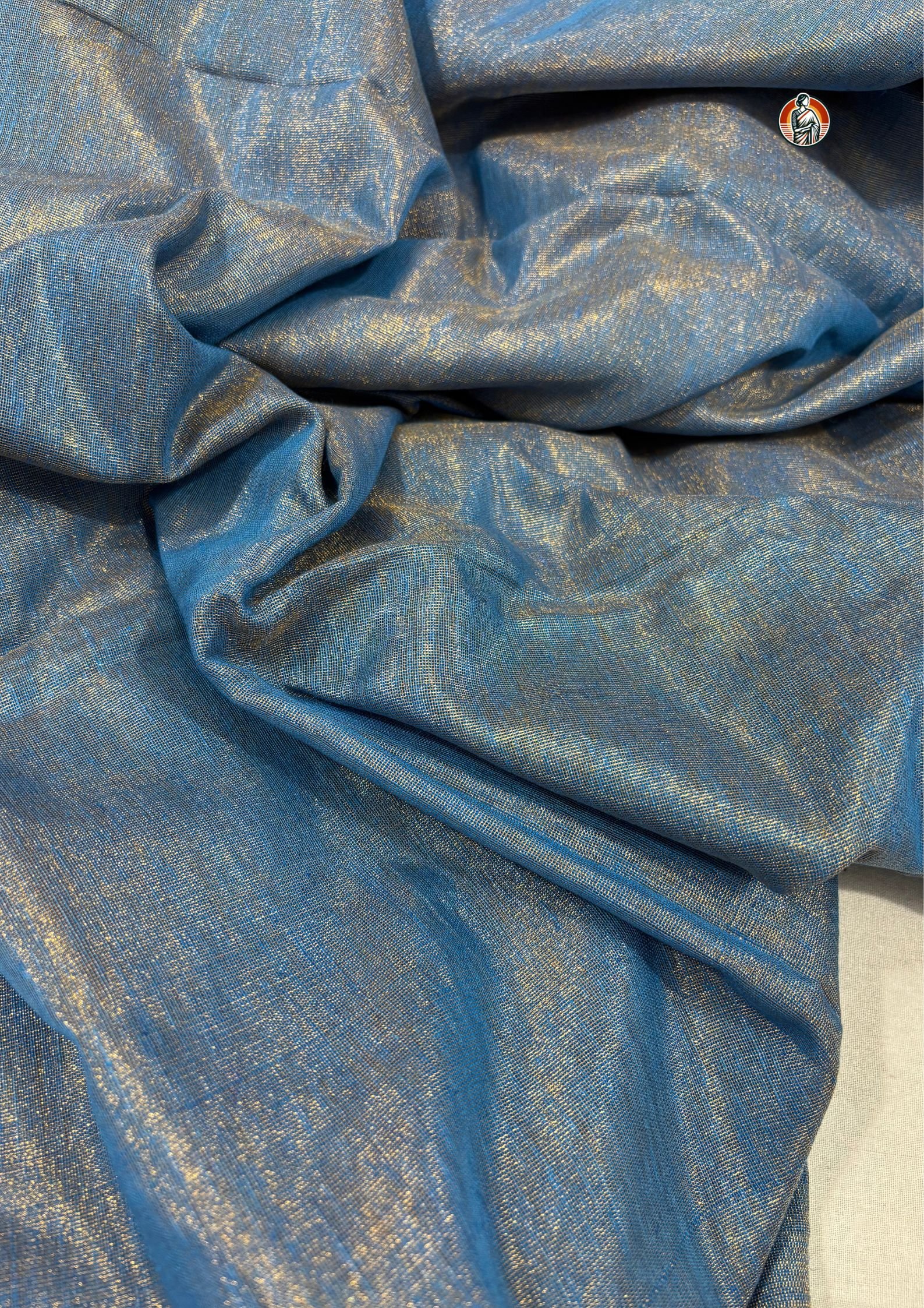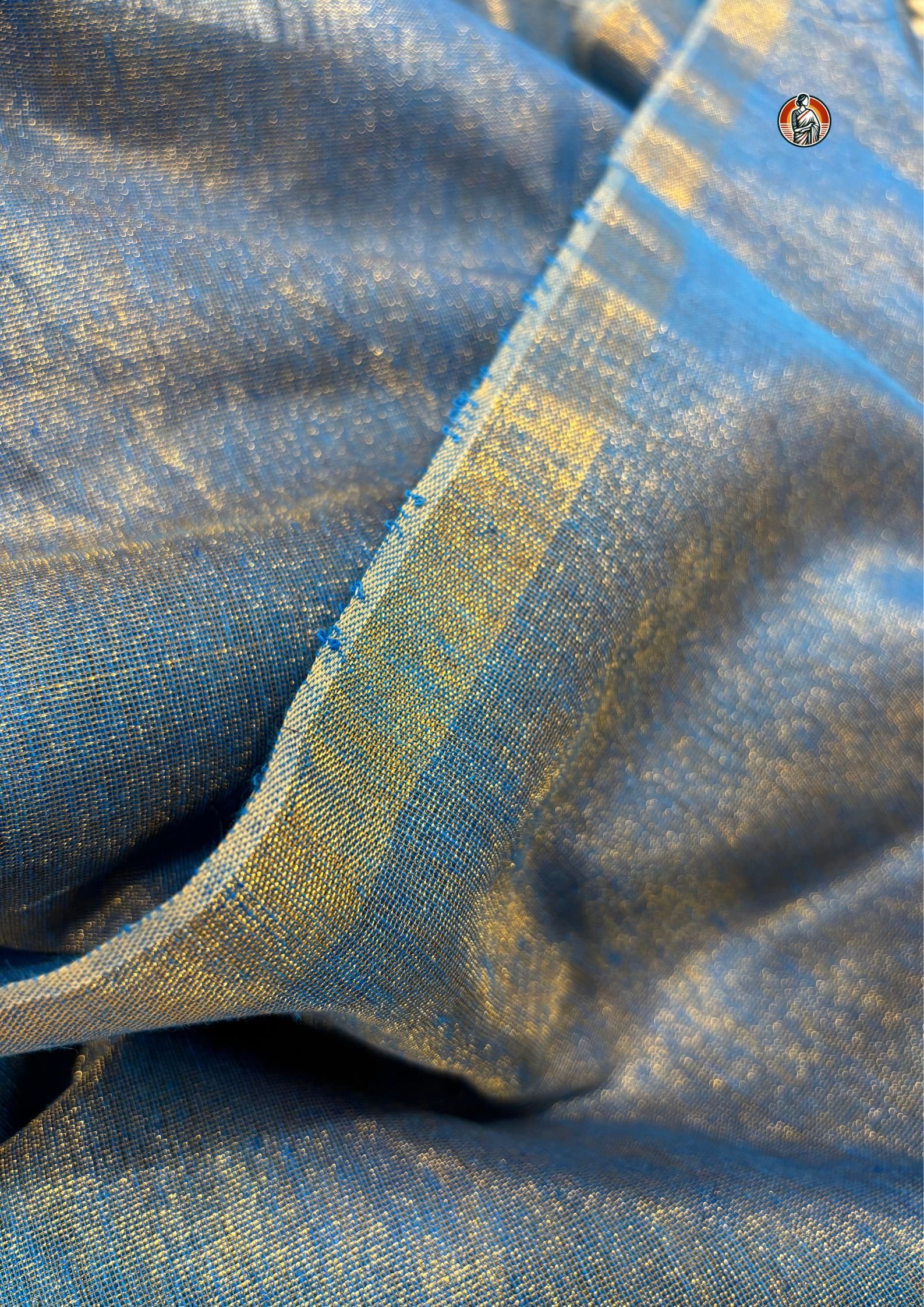 The standout feature of this saree is its dual-tone colour effect, where sky blue blends beautifully with a soft golden sheen. As the light falls on the fabric, it reflects a subtle shimmer, creating a rich and elegant look without being too heavy.