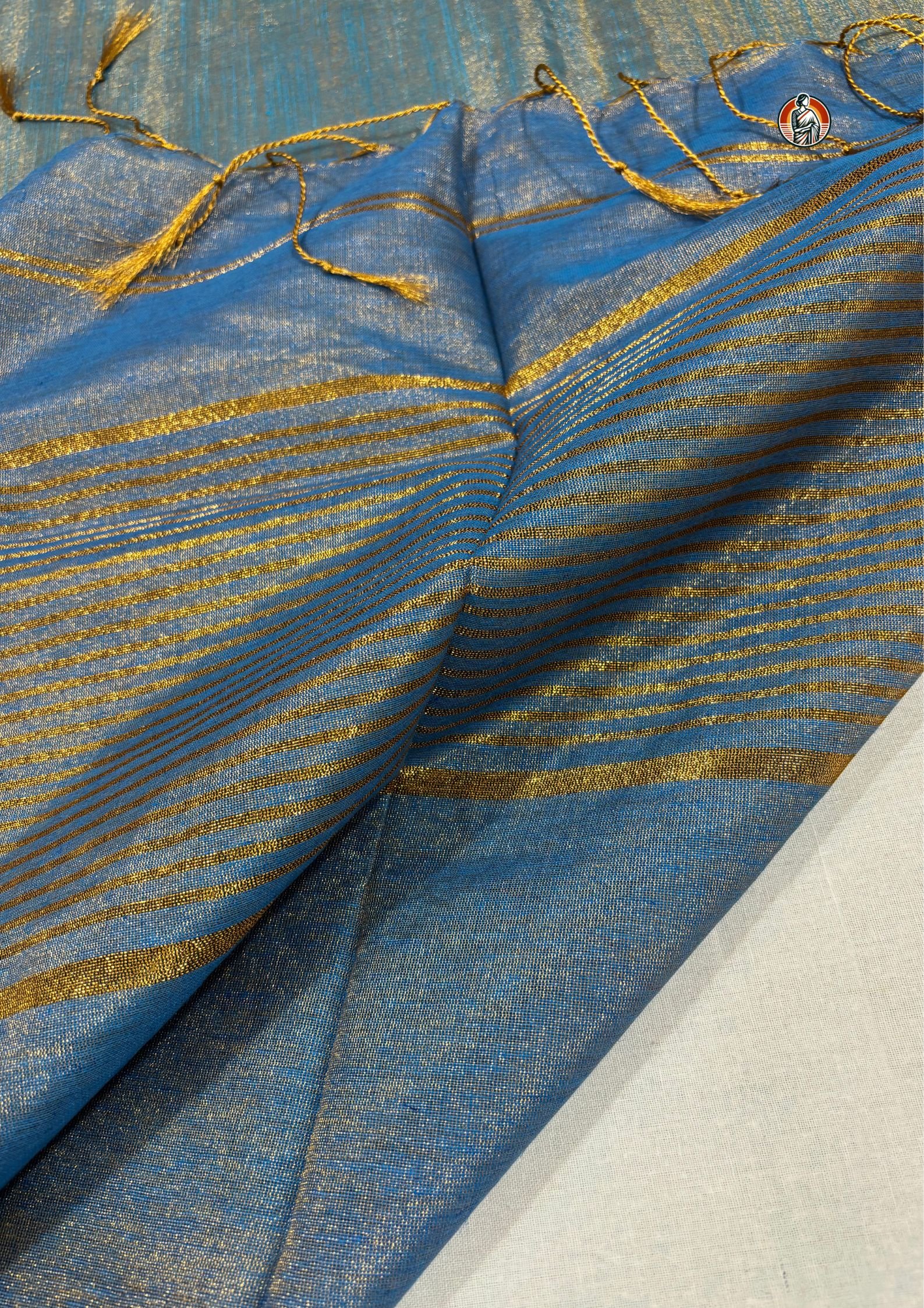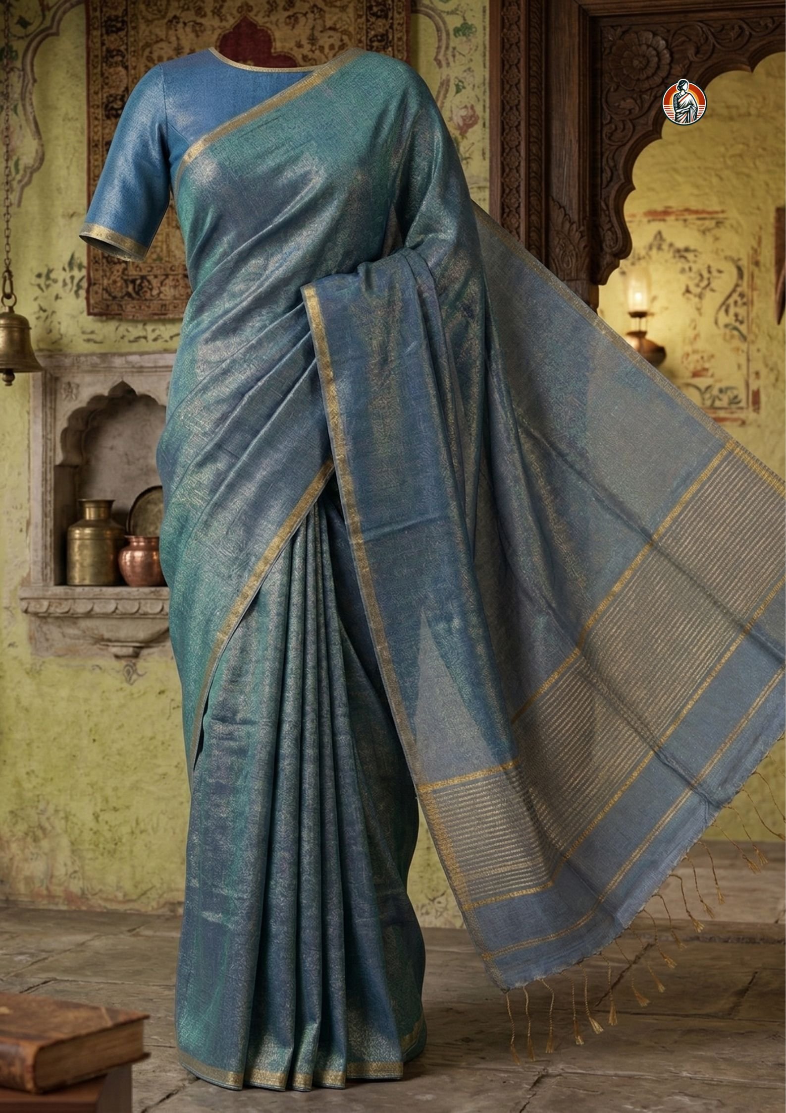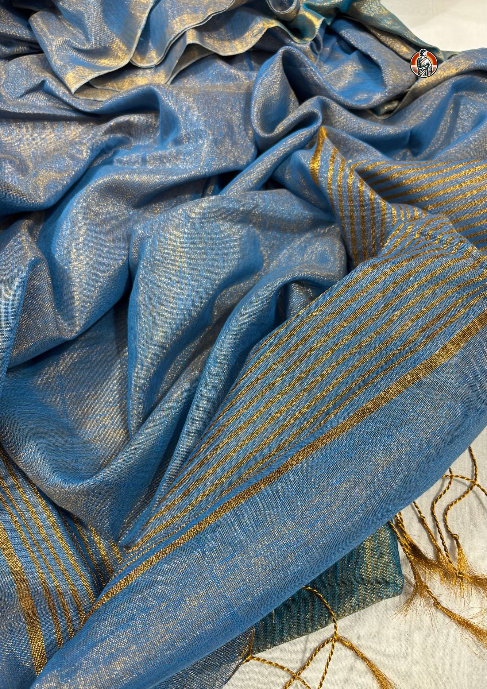 The standout feature of this saree is its dual-tone colour effect, where sky blue blends beautifully with a soft golden sheen. As the light falls on the fabric, it reflects a subtle shimmer, creating a rich and elegant look without being too heavy.