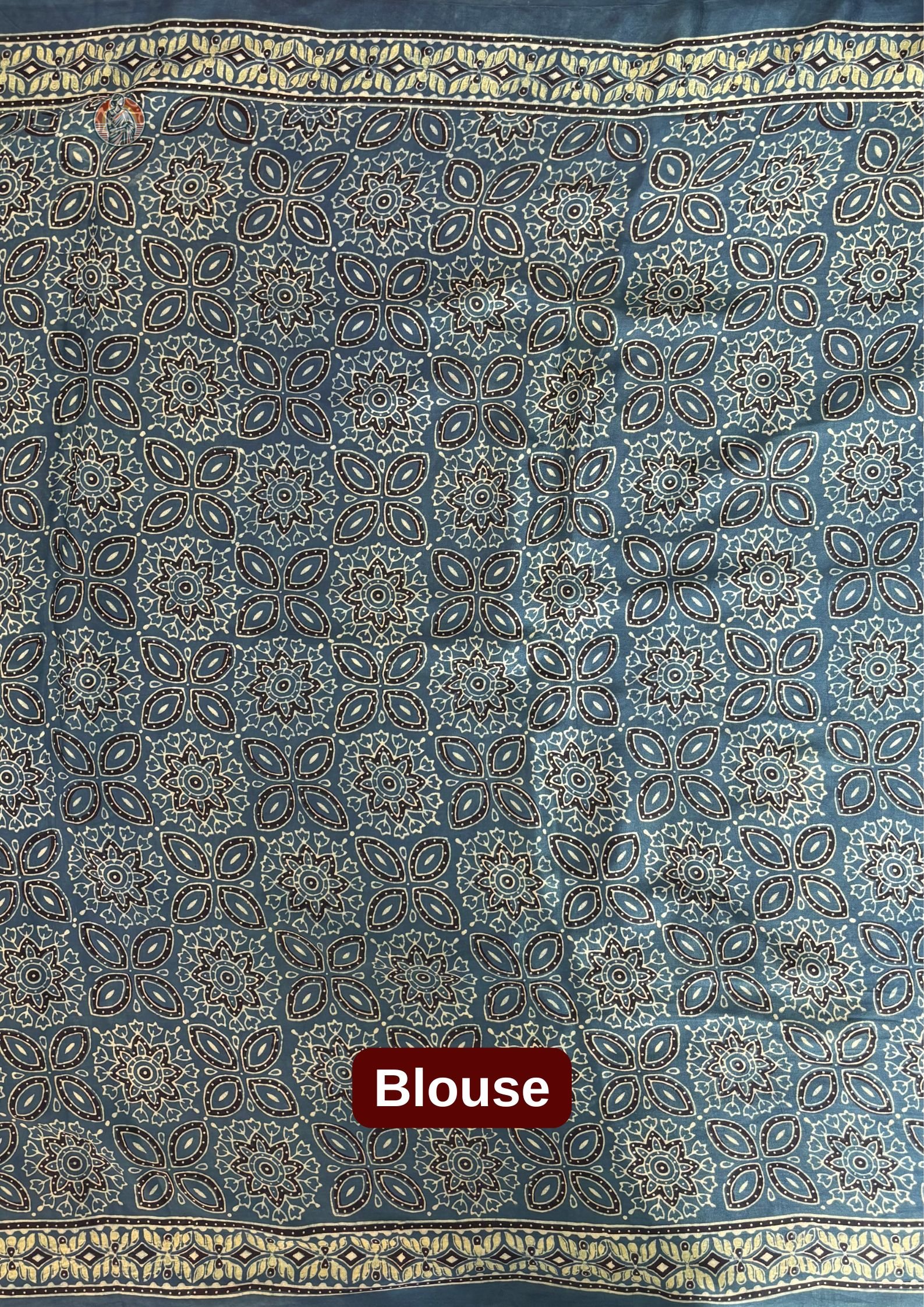 The saree includes a matching blouse piece with the same Ajrakh print style, allowing it to be stitched into a coordinated blouse.