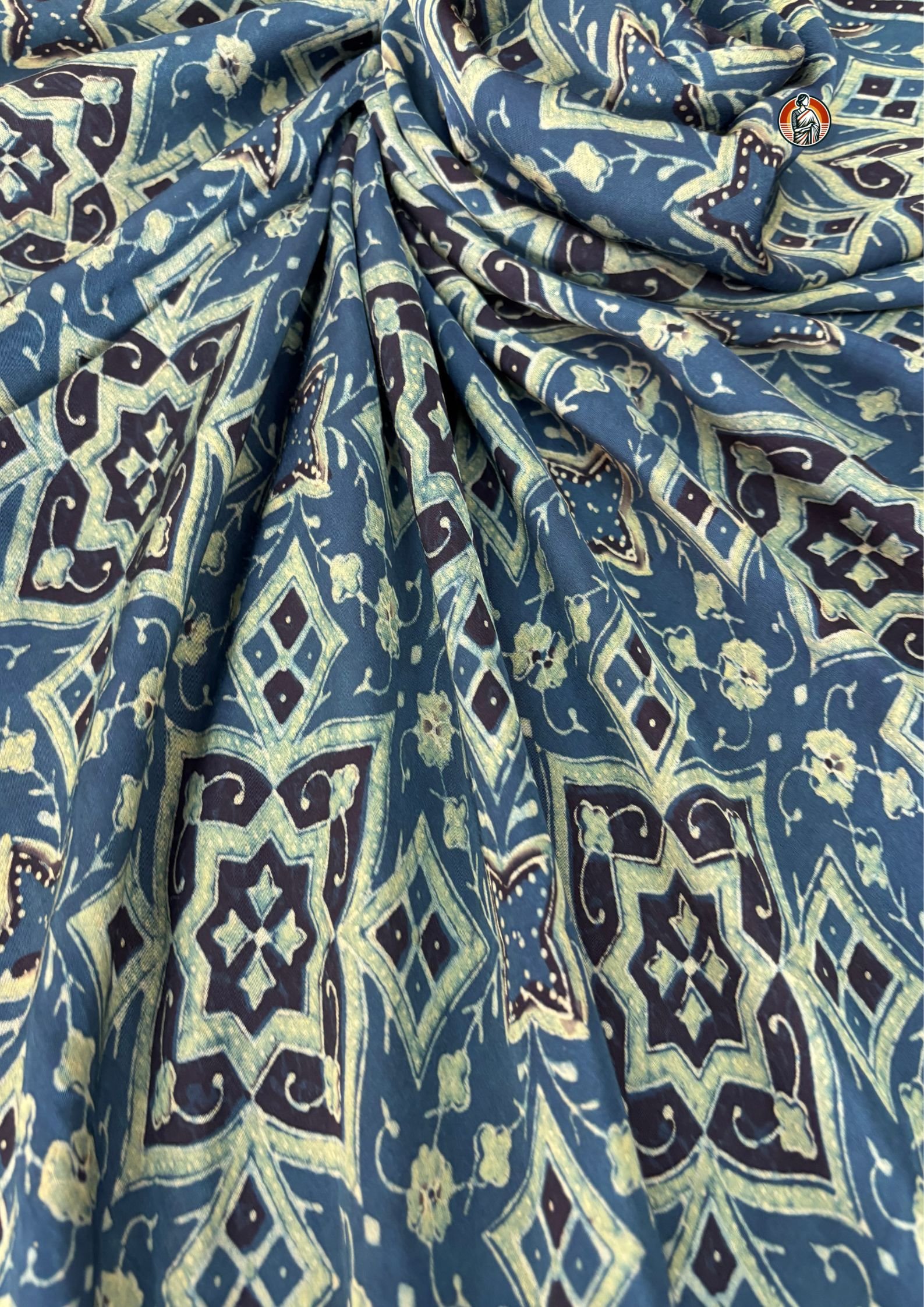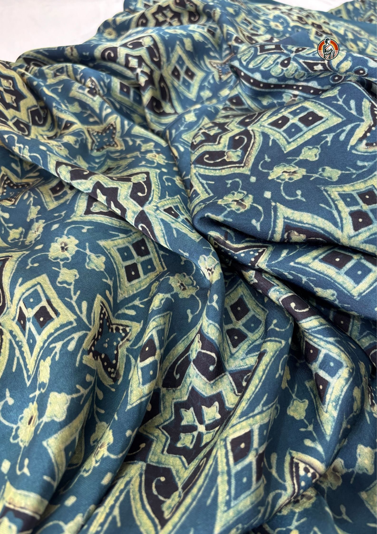The saree features a deep teal blue base colour, which gives it a rich and earthy appearance typical of traditional Ajrakh prints. The body of the saree is covered with classic Ajrakh block printed motifs arranged in repeating geometric patterns. These designs include diamond shapes, small square elements, and floral-inspired forms placed evenly across the fabric.